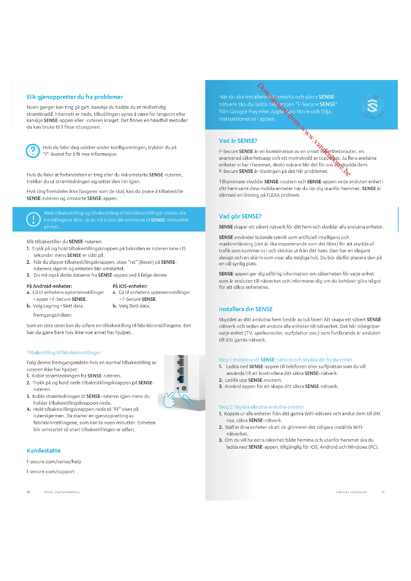 ladda ned SENSE-appen, tillgänglig för iOS, Android och Windows (PC). När du ska installera ditt smarta och säkra SENSE- nätverk ska du ladda ned appen ”F-Secure SENSE” från Google Play eller Apple App Store och följa instruktionerna i appen. Downloaded from www.vandenborre.be32 33Svenska • Snabbguide Svenska • Snabbguide Skärm Funktion Vad ska jag göra Inga tända lampor SENSE saknar ström. Kontrollera att SENSE- routern är ansluten till elnätet. Skärmens ljusstyrka är för svag. Ändra skärmens ljusstyrka i appinställningarna. Hela skärmen är tänd SENSE startas. Vänta några minuter. Om ingenting händer ska du koppla ur SENSE- routern och ansluta den igen. Om problemet kvarstår krävs en fabriksåterställning. Statiska rutor Pulserande rutor SENSE är redo för anslutning. Tryck på den blå knappen på SENSE- routerns baksida. Fyra (4) siffror Detta är anslutningskoden. Den visas när du trycker på den blå anslutningsknappen. Följ instruktionerna i SENSE-appen. Roterande rutor SENSE ansluter eller verifierar en åtgärd som har genomförts i appen. Detta kan ta en stund. Följ instruktionerna i appen. Plustecken Åtgärden slutförd. Ingen åtgärd krävs. Gå vidare till nästa steg. Utropstecken SENSE har hittat ett fel. Kontrollera SENSE- appen. Uppdaterar SENSE uppdaterar sin programvara och kommer att starta om automatiskt. Se till att SENSE-routern är ansluten och följ instruktionerna i SENSE- appen. Återställning SENSE-routern har nollställts. Vänta tills SENSE-routern har återställts och installera den därefter. Fabriksåterställning SENSE router har nollställts och återställts till fabriksinställningarna. Tid Du är online och är skyddad. Ha det så trevligt! Du kan ansluta dina andra enheter till SENSE-nätverket via antingen WiFi eller en Ethernet-kabel.