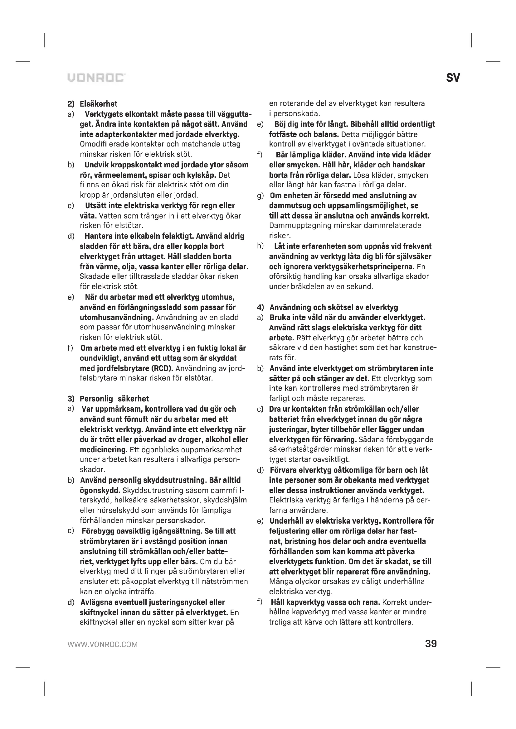 en mjuk trasa fuktad med tvållösning. Använd inte lösningsmedel som bensin, alkohol, ammoniak osv. Sådana kemikalier skadar de syntetiska kompo- nenterna. MILJÖ Felaktig och/eller kasserad elektrisk eller elektronisk utrustning måste lämnas in på lämpliga återvinningsstationer. Endast för EU-länder Kassera inte elverktyg i hushållsavfall. Enligt den europeiska riktlinjen 2012/19/EG om kasserad elektrisk och elektronisk utrustning och dess tillämpning i nationell rätt måste elverktyg som inte längre är användbara samlas in separat och kasseras på ett miljövänligt sätt. GARANTI VONROC-produkter är utvecklade enligt högsta kvali- tetsstandard och garanteras fria från defekter i både material och utförande under den period som lagen föreskriver från och med inköpsdatumet. Om produk- ten skulle utveckla fel under denna period på grund av defekt material och/eller utförande, kontakta då VONROC direkt. Följande omständigheter är undantagna från denna garanti: