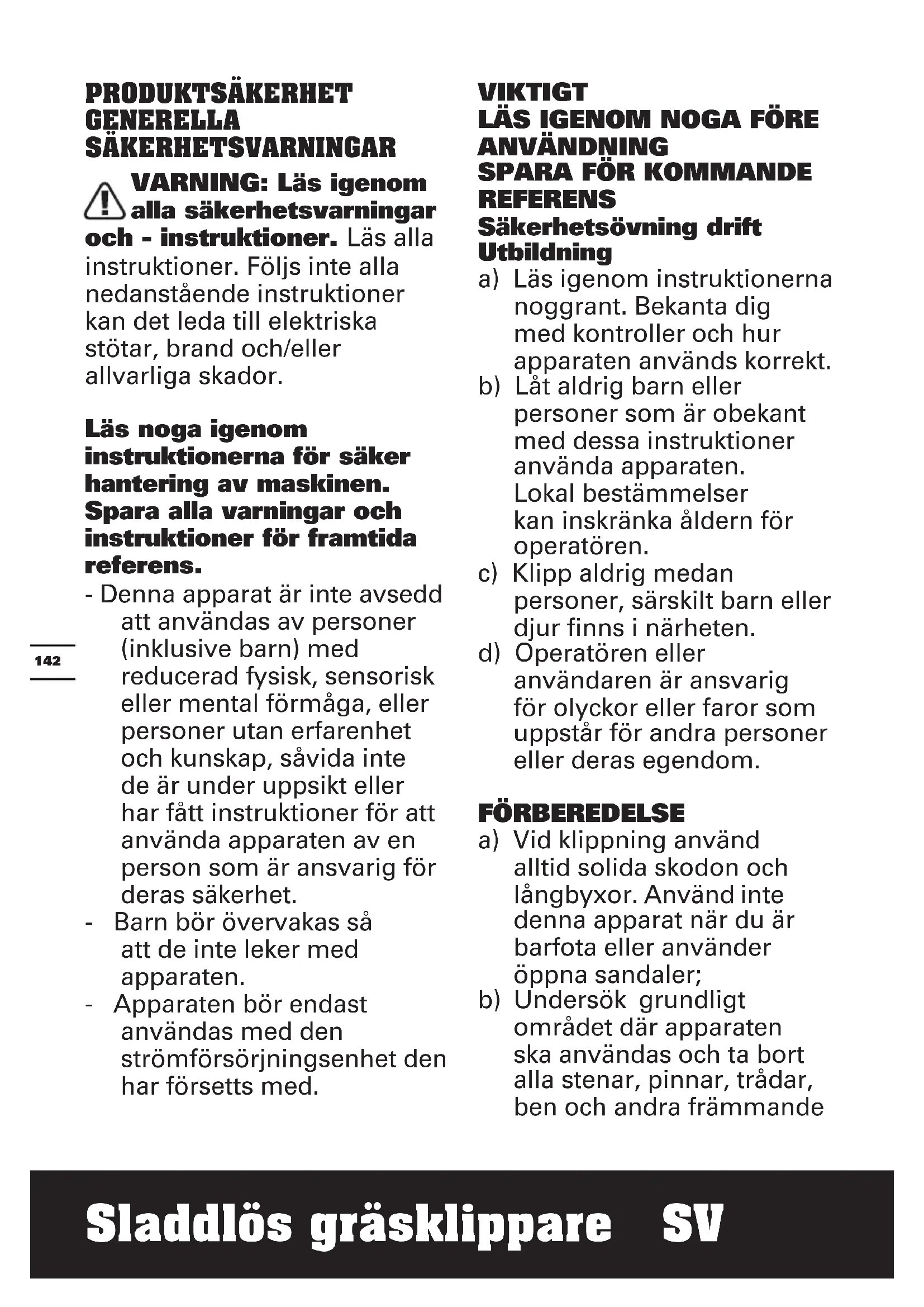 C ou menos.142 Sladdlös gräsklippare SV PRODUKTSÄKERHET GENERELLA SÄKERHETSVARNINGAR VARNING: Läs igenom alla säkerhetsvarningar och - instruktioner. Läs alla instruktioner. Följs inte alla nedanstående instruktioner kan det leda till elektriska stötar, brand och/eller allvarliga skador. Läs noga igenom instruktionerna för säker hantering av maskinen. Spara alla varningar och instruktioner för framtida referens. - Denna apparat är inte avsedd att användas av personer (inklusive barn) med reducerad fysisk, sensorisk eller mental förmåga, eller personer utan erfarenhet och kunskap, såvida inte de är under uppsikt eller har fått instruktioner för att använda apparaten av en person som är ansvarig för deras säkerhet. - Barn bör övervakas så att de inte leker med apparaten. - Apparaten bör endast användas med den strömförsörjningsenhet den har försetts med. VIKTIGT
