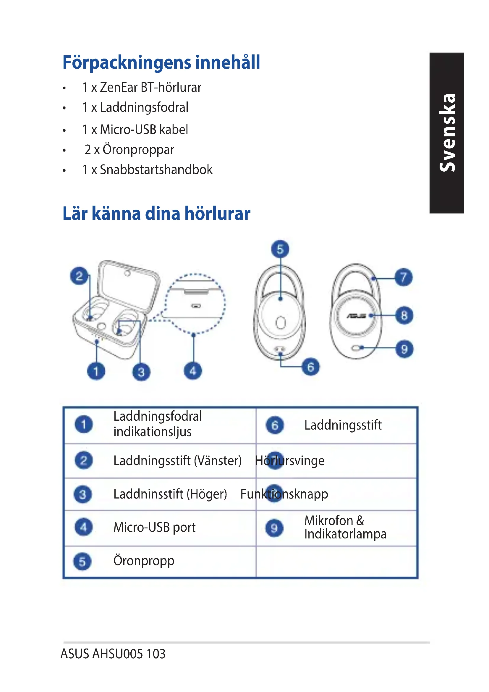 hörlursvingarnasitterstadigtpå öronen.ASUS AHSU005 105 Svenska Använda hörlurarna första gången Hörlurarnaäravstängdasomstandard.Tauthörlurarnaur laddningsfodraletförattaktiveradem. NOTERA:Setillattduharladdathörlurarnainnanduanvänderdem förstagången. LED-indikationer Ljus Status Blinkarblåfemgånger Slåpå Blinkarrödochblå omvartannat Länkar Blinkarblå Länkad Blinkarrödiensekund Stängaav Blinkarrödtvågångervar trettiondesekund Lågtbatteri NOTERA:Dukankontrollerahörlurarnasbatterinivåpåenhetenskärm närhörlurarnaärlänkadetilldinenhet. Hörlurarnas LED-indikationerSnabbstartshandbok106 Svenska Länka hörlurarna