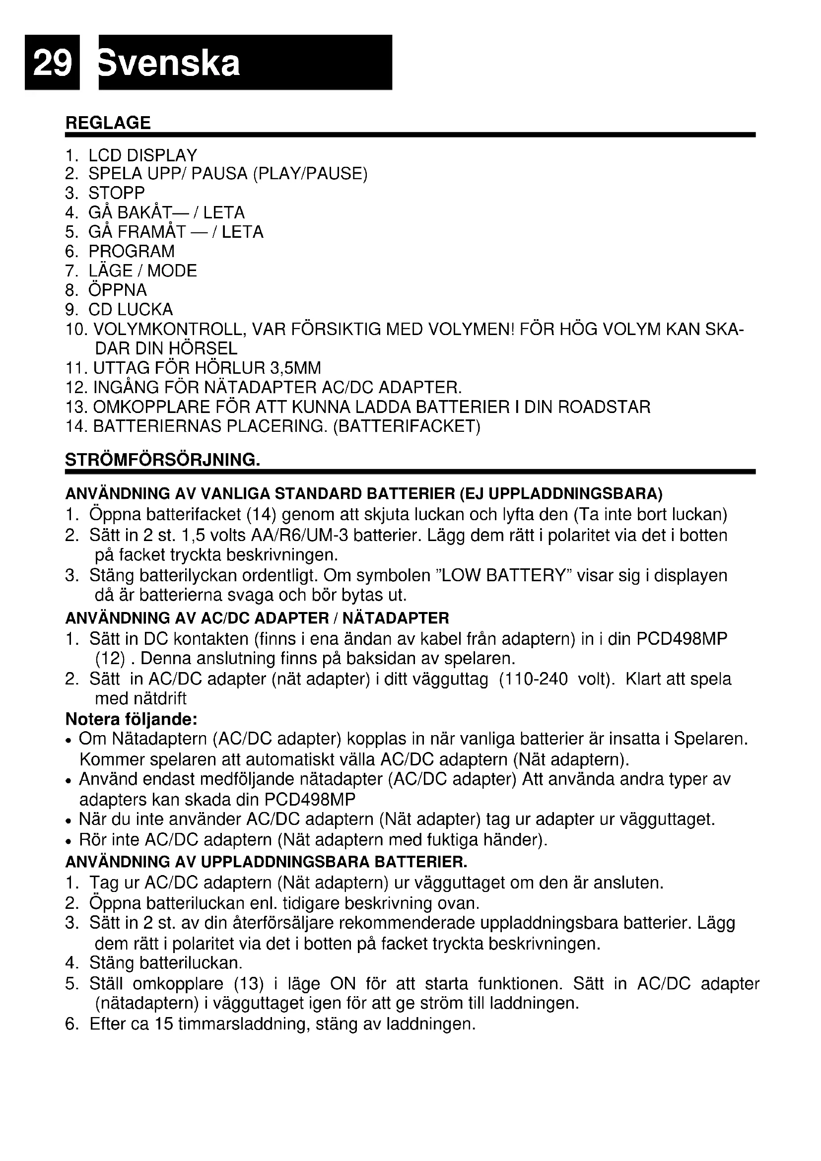 med nätdrift Notera följande: Om Nätadaptern (AC/DC adapter) kopplas in när vanliga batterier är insatta i Spelaren. Kommer spelaren att automatiskt välla AC/DC adaptern (Nät adaptern). Använd endast medföljande nätadapter (AC/DC adapter) Att använda andra typer av adapters kan skada din PCD498MP När du inte använder AC/DC adaptern (Nät adapter) tag ur adapter ur vägguttaget. Rör inte AC/DC adaptern (Nät adaptern med fuktiga händer). ANVÄNDNING AV UPPLADDNINGSBARA BATTERIER.