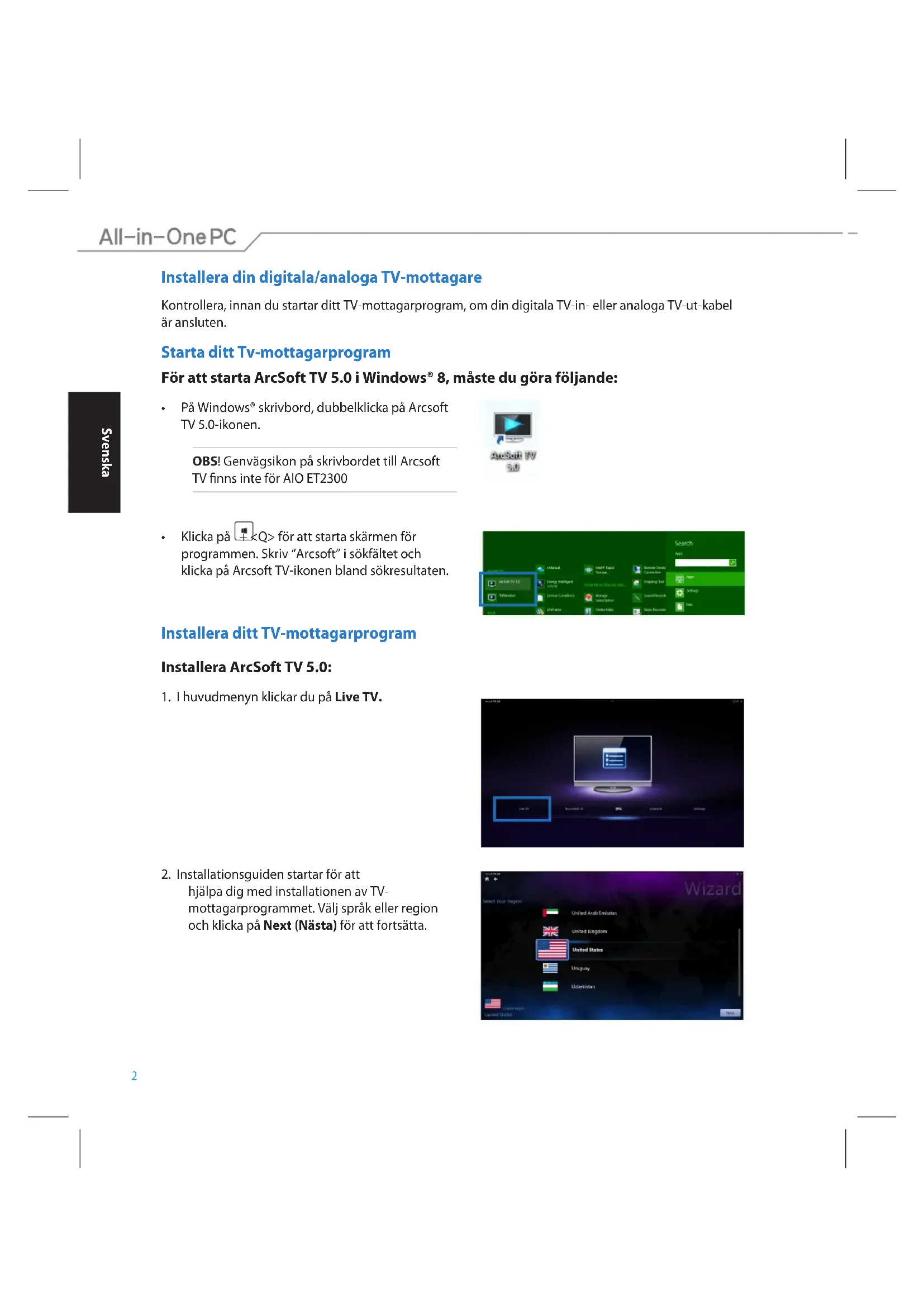 Installera din digitala/analoga TV-mottagare Kontrollera, innan du startar ditt TV-mottagarprogram, om din digitala TV-in- eller analoga TV-ut-kabel är ansluten. Starta ditt Tv-mottagarprogram För att starta ArcSoft TV 5.0 i Windows® 8, måste du göra följande: På Windows® skrivbord, dubbelklicka på Arcsoft TV 5.0-ikonen. OBS! Genvägsikon på skrivbordet till Arcsoft TV nns inte för AIO ET2300