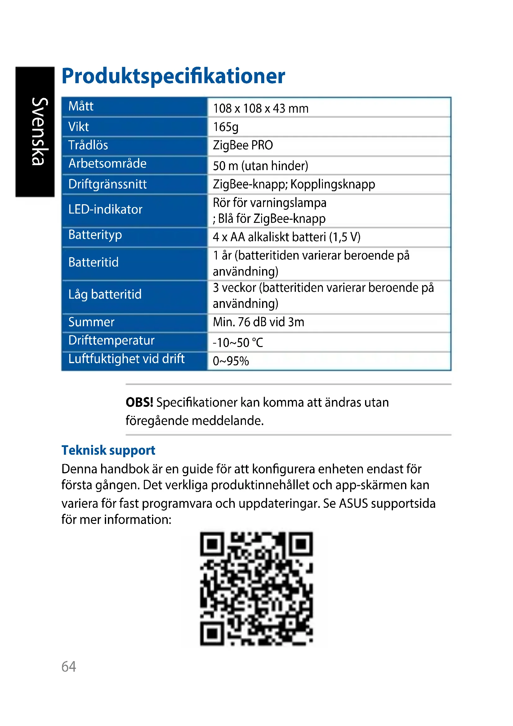 - Kun virta katkeaa tästä laitteesta, kumppanisovelluksen kuvake näkyy himmennettynä eikä sitä voi määrittää. Tila päivittyy 5 minuutin välein. 63Produktspecikationer Mått 108 x 108 x 43 mm Vikt 165g Trådlös ZigBee PRO Arbetsområde 50 m (utan hinder) Driftgränssnitt ZigBee-knapp; Kopplingsknapp LED-indikator Rör för varningslampa ; Blå för ZigBee-knapp Batterityp 4 x AA alkaliskt batteri (1,5 V) Batteritid 1 år (batteritiden varierar beroende på användning) Låg batteritid 3 veckor (batteritiden varierar beroende på användning) Summer Min. 76 dB vid 3m Drifttemperatur -10~50 °C Luftfuktighet vid drift 0~95% OBS! Specikationer kan komma att ändras utan föregående meddelande. Teknisk support Denna handbok är en guide för att kongurera enheten endast för första gången. Det verkliga produktinnehållet och app-skärmen kan variera för fast programvara och uppdateringar. Se ASUS supportsida för mer information: