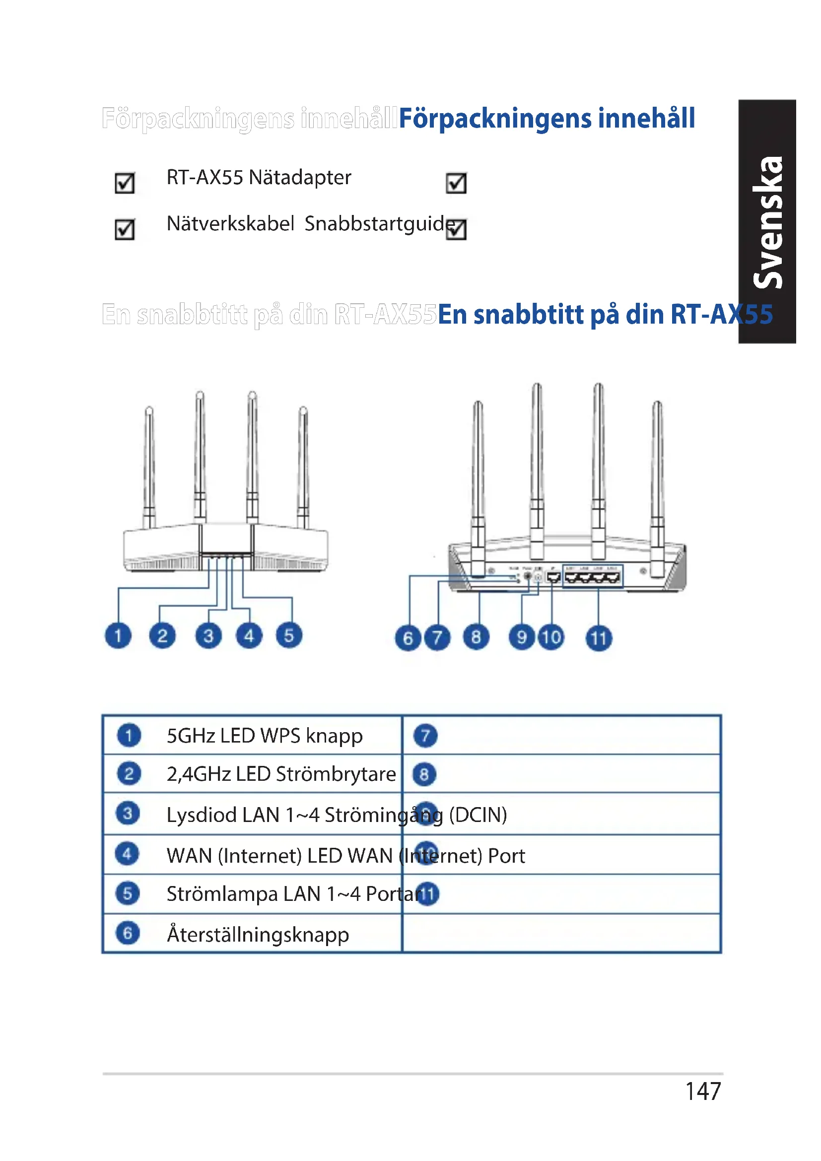 - Uporabniški priročnik lahko dobite na spletni strani https://www.asus.com/support147 Svenska En snabbtitt på din RT-AX55En snabbtitt på din RT-AX55 Förpackningens innehållFörpackningens innehåll RT-AX55 Nätadapter Nätverkskabel Snabbstartguide 5GHz LED WPS knapp 2,4GHz LED Strömbrytare Lysdiod LAN 1~4 Strömingång (DCIN) WAN (Internet) LED WAN (Internet) Port Strömlampa LAN 1~4 Portar Återställningsknapp148 Svenska Placera din routerPlacera din router För bästa trådlösa signalsändning mellan den trådlösa routern och nätverksenheterna som är anslutna till den, se till att du:
