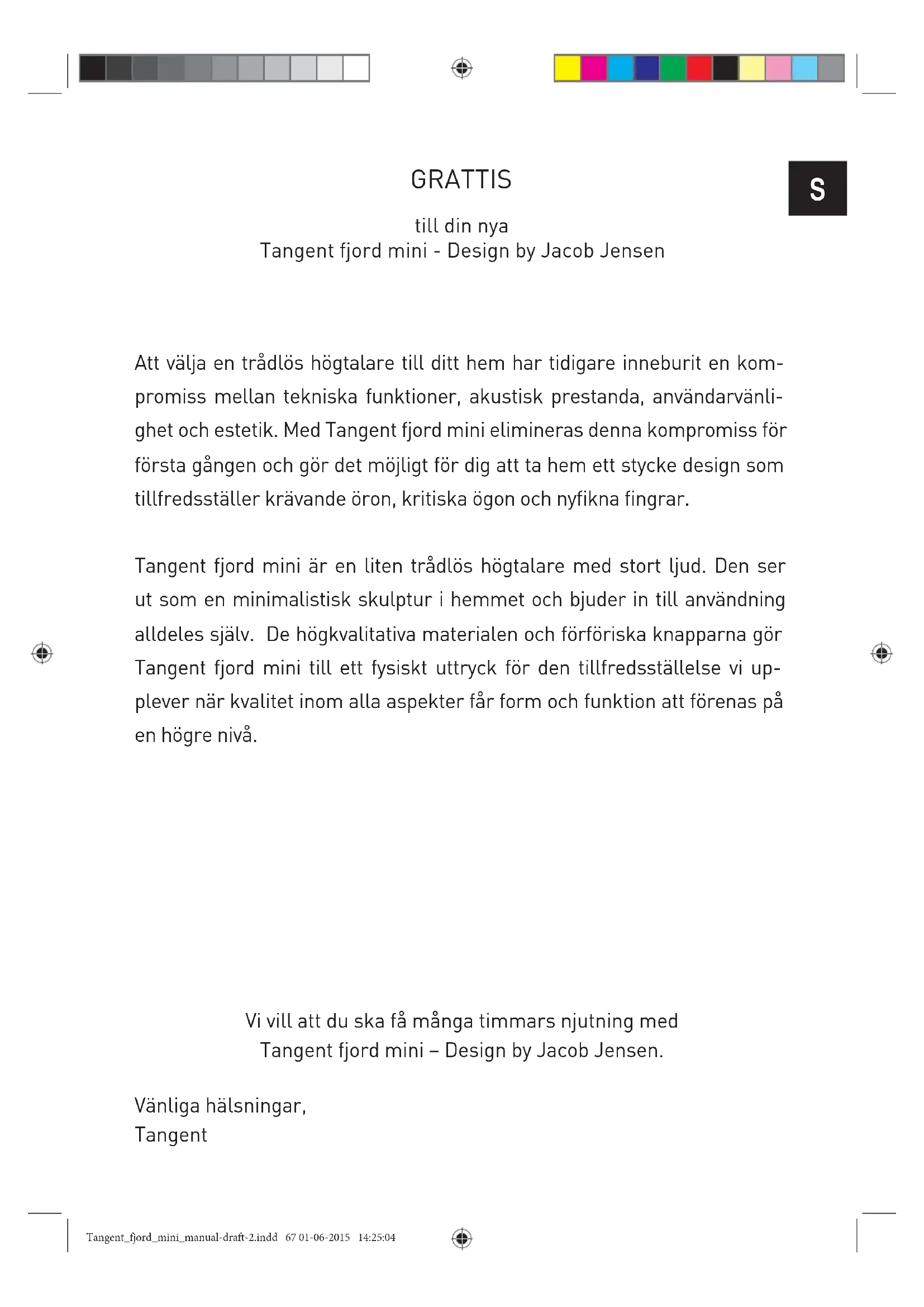 laite huoltoon. Tangent_fjord_mini_manual-draft-2.indd 66 01-06-2015 14:25:04S Vi vill att du ska få många timmars njutning med Tangent fjord mini – Design by Jacob Jensen. Vänliga hälsningar, Tangent GRATTIS till din nya Tangent fjord mini - Design by Jacob Jensen Att välja en trådlös högtalare till ditt hem har tidigare inneburit en kom- promiss mellan tekniska funktioner, akustisk prestanda, användarvänli- ghet och estetik. Med Tangent fjord mini elimineras denna kompromiss för första gången och gör det möjligt för dig att ta hem ett stycke design som tillfredsställer krävande öron, kritiska ögon och nyfikna fingrar. Tangent fjord mini är en liten trådlös högtalare med stort ljud. Den ser ut som en minimalistisk skulptur i hemmet och bjuder in till användning alldeles själv. De högkvalitativa materialen och förföriska knapparna gör Tangent fjord mini till ett fysiskt uttryck för den tillfredsställelse vi up- plever när kvalitet inom alla aspekter får form och funktion att förenas på en högre nivå. Tangent_fjord_mini_manual-draft-2.indd 67 01-06-2015 14:25:04Snabbstartsguide: Packa upp din Tangent fjord Sätt strömbrytaren på undersidan till PÅ för att aktivera beröringssen- sorn på enhetens ovansida. Sätt på enheten med ett kort tryck på beröringssensorn Enheten går nu i kopplingsläge och du kan hitta den i din smartphone. (“Om din smartphone har närfältskommunikation och den är aktiverad kan du använda den för ihopkoppling” Närfältskommunikation sitter högst upp på enheten.) Du är nu ihopkopplad med din enhet och kan spela musik. För att stänga AV fjord mini trycker du länge på beröringssensorn. Ladda din Tangent fjord vid behov.