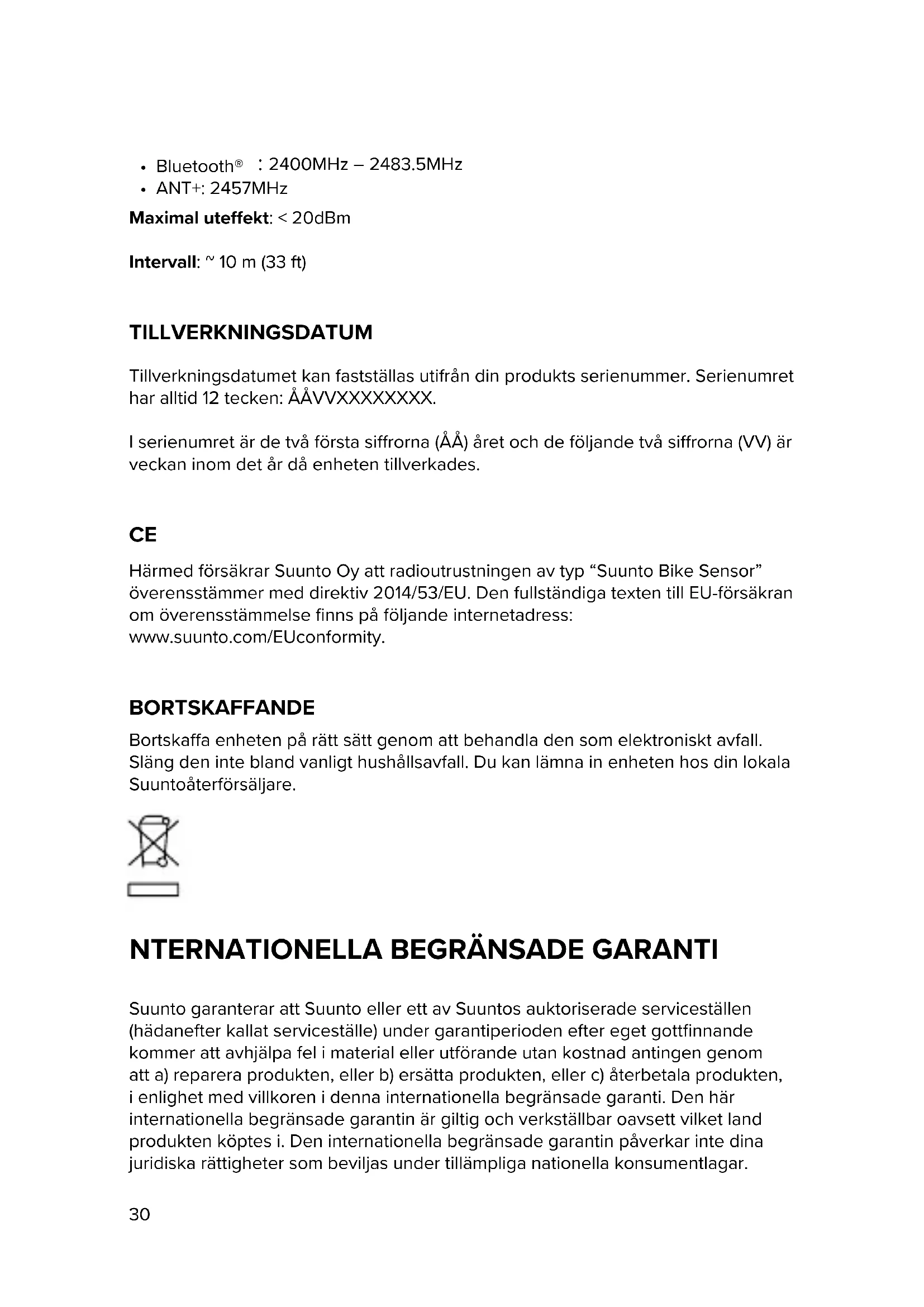 Suunto garanterar att Suunto eller ett av Suuntos auktoriserade serviceställen (hädanefter kallat serviceställe) under garantiperioden efter eget gottfinnande kommer att avhjälpa fel i material eller utförande utan kostnad antingen genom att a) reparera produkten, eller b) ersätta produkten, eller c) återbetala produkten, i enlighet med villkoren i denna internationella begränsade garanti. Den här internationella begränsade garantin är giltig och verkställbar oavsett vilket land produkten köptes i. Den internationella begränsade garantin påverkar inte dina juridiska rättigheter som beviljas under tillämpliga nationella konsumentlagar.31 GARANTIPERIOD Garantiperioden för den internationella begränsade garantin börjar gälla från det datum då den ursprungliga slutanvändaren köpte produkten. Garantiperioden är två (2) år för produkter och trådlösa trycksändare om inget annat anges. Garantiperioden är ett (1) år för tillbehör, inklusive men inte begränsat till trådlösa sensorer och sändare, laddare, kablar, laddningsbara batterier, remmar, armband och slangar.