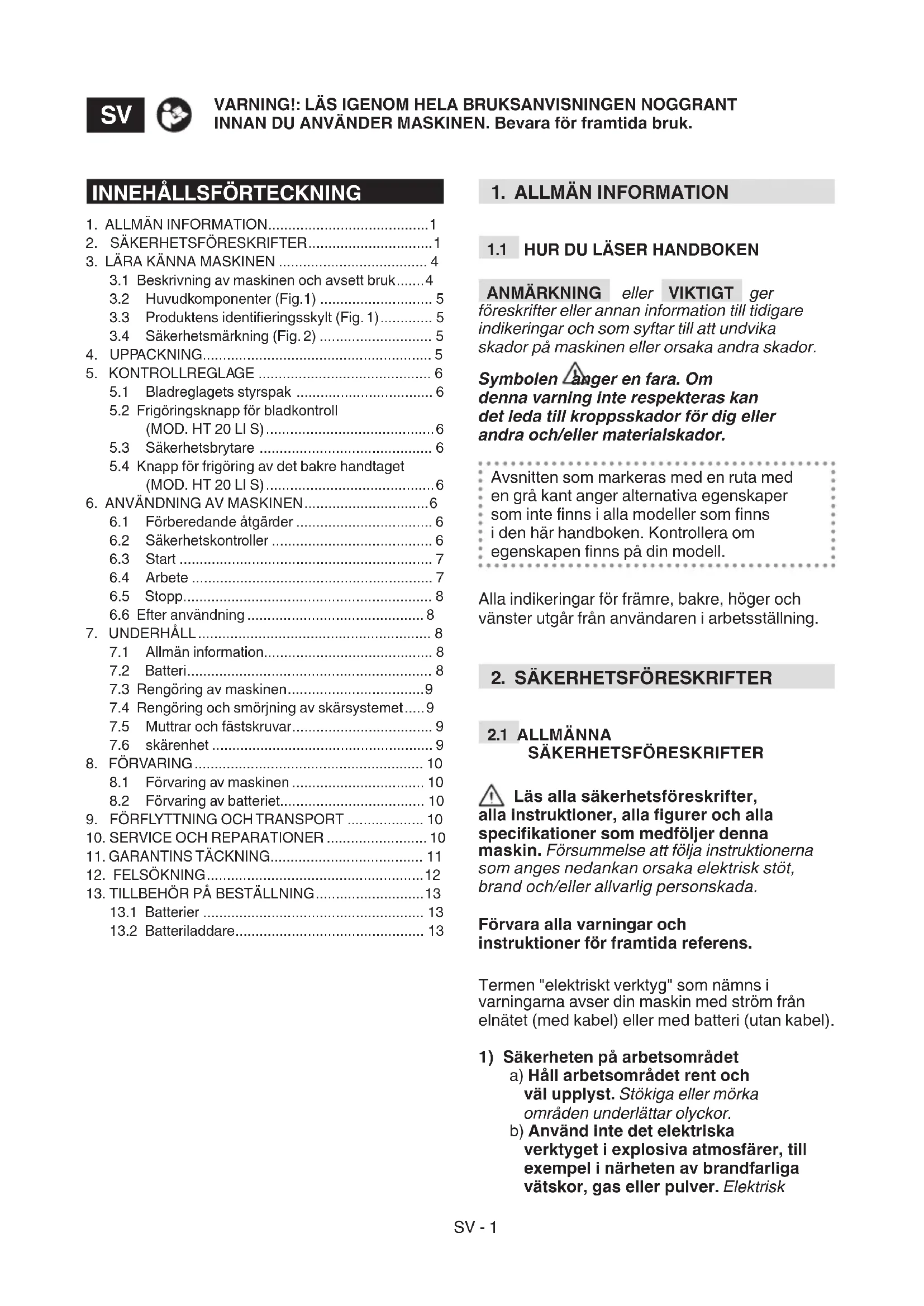 Batteridrivna handhållna häcksaxar BRUKSANVISNING VARNING: läs igenom hela detta häfte innan du använder maskinen.