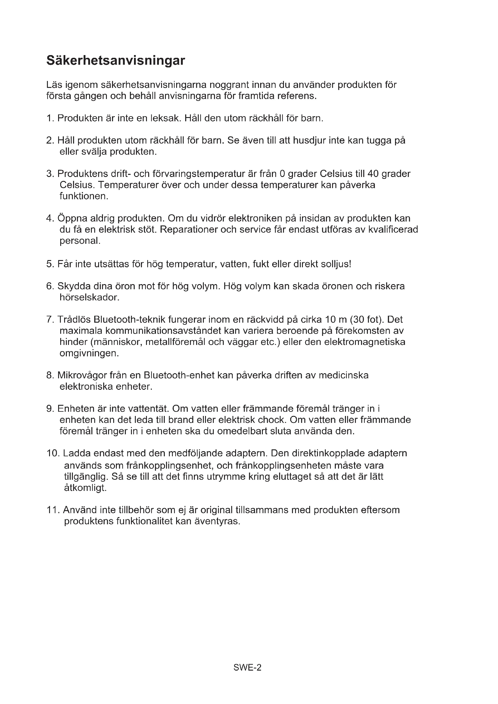 11. Använd inte tillbehör som ej är original tillsammans med produkten eftersom