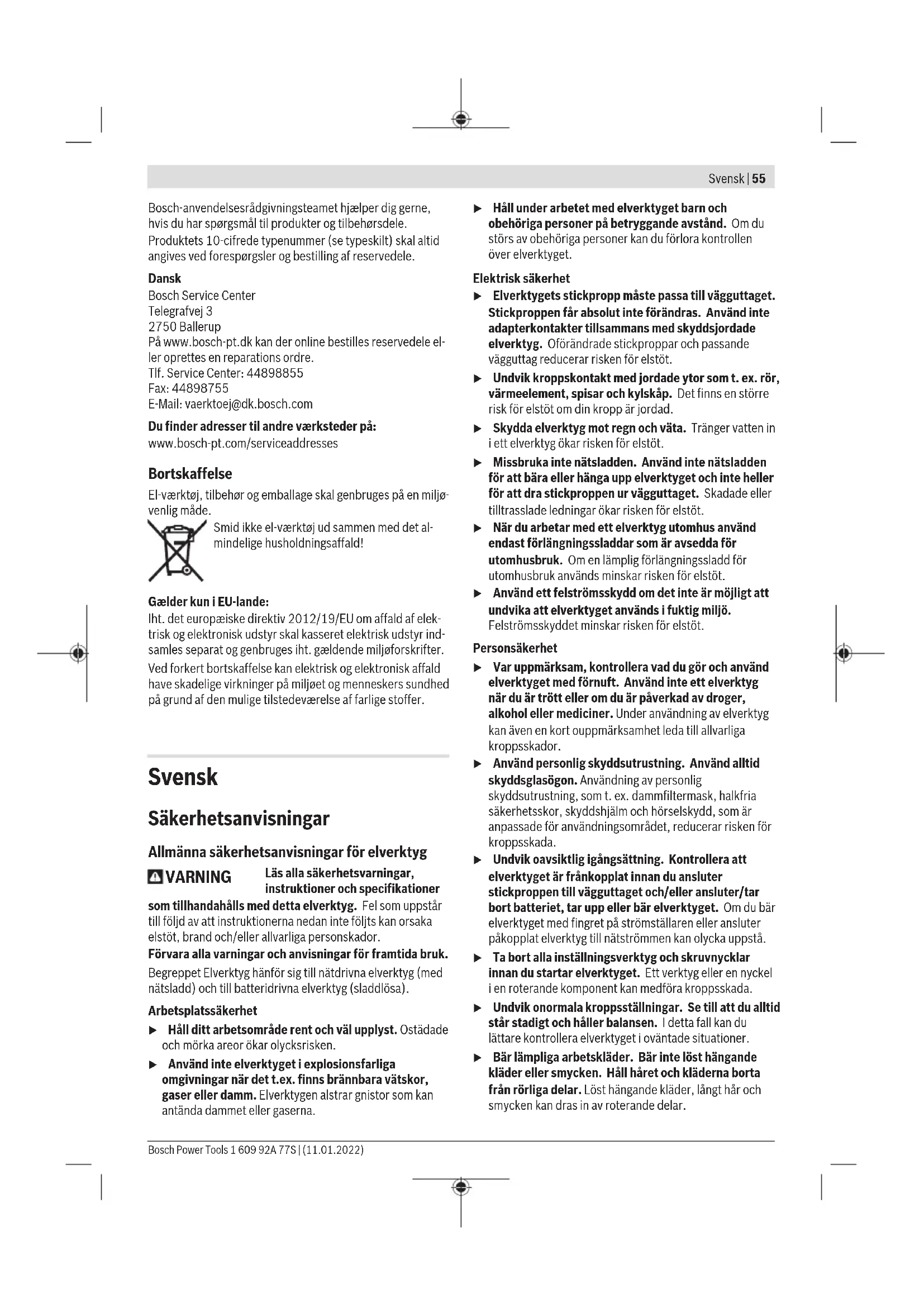 Den vibrationsnivå och det bullervärde som anges i dessa anvisningar har uppmätts enligt en mätmetod som normerats och kan användas för att jämföra elverktyg med varandra. Mätmetoden är även lämplig för preliminär bedömning av vibrations- och bullernivån. Den angivna vibrations- och bullernivån representerar den huvudsakliga användningen av elverktyget. Om däremot elverktyget används för andra ändamål, med andra insatsverktyg eller inte underhållits ordentligt kan vibrations- och bullernivån avvika. Då kan vibrations- och bullernivån under arbetsperioden öka betydligt under hela arbetstiden. För en exakt bedömning av vibrations- och bullernivån bör även de tider beaktas när elverktyget är avstängt eller är igång, men inte används. Detta reducerar vibrations- och bullerbelastningen för den totala arbetsperioden betydligt. Bestäm extra säkerhetsåtgärder för att skydda operatören mot vibrationernas inverkan t.ex.: underhåll av elverktyget och insatsverktygen, att hålla händerna varma, organisation av arbetsförloppen. Montering u Dra stickproppen ur nätuttaget innan arbeten utförs på elverktyget. Tilläggshandtag u Använd endast ditt elverktyg med tilläggshandtaget (12). u Se till att stödhandtaget alltid är ordentligt åtdraget. Annars kan du förlora kontrollen över elverktyget under arbetet. Vrid tilläggshandtaget (se bild A) Du kan vrida tilläggshandtaget (12) som du vill för att få en säker och mindre uttröttande arbetsställning. – Vrid det nedre greppet på tilläggshandtaget (12) motsols och vrid tilläggshandtaget (12) till önskad position. Dra åt det nedre handtaget på stödhandtaget (12) medsols igen. Se till att spännbandet på tilläggshandtaget ligger i avsett spår på höljet. Bosch Power Tools 1 609 92A 77S | (11.01.2022)58 | Svensk Välja chuck och verktyg För hammarborrning och mejsling behöver du SDS-plus- verktygen som monteras i SDS-plus-chucken. För borrning utan slag i trä, metall, keramik och plast samt för skruvdragning används verktyg utan SDS-plus (t. ex. borrar med cylindriskt skaft). Dessa verktyg kräver en snabbchuck eller en kuggkranschuck. Byta borrchuck Montera snabbchuck/kuggkranschuck (se bild B) – Skruva in SDS-plus-fästet(17) i en snabbchuck(1) / kuggkranschuck(16). Säkra snabbchucken(1) / kuggkranschucken(16) med låsskruven(15). Observera att låsskruven är vänstergängad. Sätta in snabbchuck/kuggkranschuck (se bild B) – Rengör insticksänden av SDS plus-fästet (17) och smörj den lätt. – Skjut med en vridrörelse in snabbchucken (1)/ kuggkranschucken (16) med universalhållaren i verktygsfästet tills den automatiskt låses. – Kontrollera låsningen genom att dra i snabbchucken (1)/ kuggkranschucken (16). Ta ut snabbchucken/kuggkranschucken – Skjut låshylsan(5) bakåt och ta av snabbchucken(1) / kuggkranschucken(16). Verktygsbyte Dammskyddskåpan (4) hindrar i stor utsträckning borrdamm från att tränga in i verktygsfästet under arbetet. Vid insättning av verktyg se till att dammskyddskåpan (4) inte skadas. u En skadad dammskyddskåpa måste bytas ut omedelbart. Vi rekommenderar att detta utförs av kundtjänst. Verktygsbyte (SDS-plus) Sätt in SDS-plus-insatsverktyget (se bild C) Med SDS-plus-chucken kan du enkelt och bekvämt byta insatsverktyget utan att behöva använda något annat verktyg. – Rengör insticksänden av insatsverktyget och smörj den lätt. – Sätt in insatsverktyget i verktygsfästet med en roterande rörelse tills det låser fast. – Kontrollera låsningen genom att dra i verktyget. SDS-plus-insatsverktyg kan röras fritt beroende på system. Därigenom uppstår en avvikelse i roteringen vid tomgång. Detta påverkar inte precisionen hos borrhålet, eftersom borren centrerar sig själv vid borrning. Ta av SDS-plus-insatsverktyget (se bild D) – Skjut spärrhylsan (5) bakåt och ta av insatsverktyget. Verktygsbyte snabbväxelchuck Sätta in insatsverktyg (sebildE) Observera: använd inte verktyg utan SDS-plus för hammarborrning eller mejsling! Verktyg utan SDS-plus och dess borrchuck skadas vid slagborrning och mejsling. – Sätt i snabbchucken (1). – Håll fast den bakre hylsan (19) på snabbchucken (1) och vrid den främre hylsan (18) motsols tills verktyget kan sättas in. Sätt in verktyget. – Håll fast den bakre hylsan på snabbchucken (1) och vrid den främre hylsan medsols kraftigt för hand tills klick inte längre hörs. Borrchucken låses därmed automatiskt. – Kontrollera fästet genom att dra i verktyget. Observera: om verktygsfästet har öppnats till anslag kan klickljud höras när det vrids åt och verktygsfästet stängs inte. Vrid i detta fall den främre hylsan ett varv i motsatt riktning mot pilriktningen. Därefter kan verktygsfästet stängas. – Vrid slag-/vridstoppsbrytaren (10) till position ”Borrning”. Ta av insatsverktyget (se bild F) – Håll fast den bakre hylsan (19) på snabbchucken. Öppna verktygsfästet genom att vrida främre hylsan i pilriktningen tills verktyget kan tas bort. Damm-/spånutsugning Dammet från material som t.ex. blyhaltig målning, vissa träslag, mineraler och metall kan vara hälsovådligt. Beröring eller inandning av dammet kan orsaka allergiska reaktioner och/eller andningsbesvär hos användaren eller personer som uppehåller sig i närheten. Vissa damm från ek eller bok anses vara cancerogena, speciellt då i förbindelse med tillsatsämnen för träbehandling (kromat, träkonserveringsmedel). Endast yrkesmän får bearbeta asbesthaltigt material. – Använd om möjligt en för materialet lämplig dammutsugning. – Se till att arbetsplatsen är väl ventilerad. – Vi rekommenderar ett andningsskydd i filterklass P2. Beakta de föreskrifter som i aktuellt land gäller för bearbetat material. u Undvik dammanhopning på arbetsplatsen. Damm kan lätt självantändas. Dammutsug med GDE16 Plus/GDE 68 (tillbehör) GDE 16 Plus (tillbehör) eller GDE 68 (t