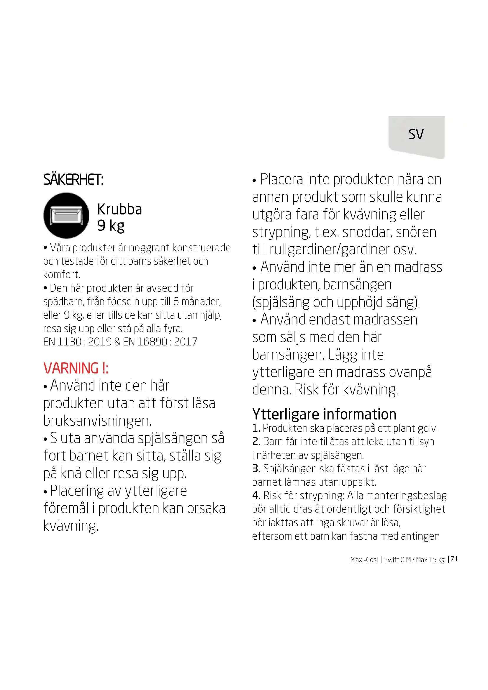 - Lämna inte något i sängen och placera den inte bredvid en produkt som kan utgöra fara för barnets fötter eller som innebär kvävningsrisk eller strypning, SVMaxi-Cosi