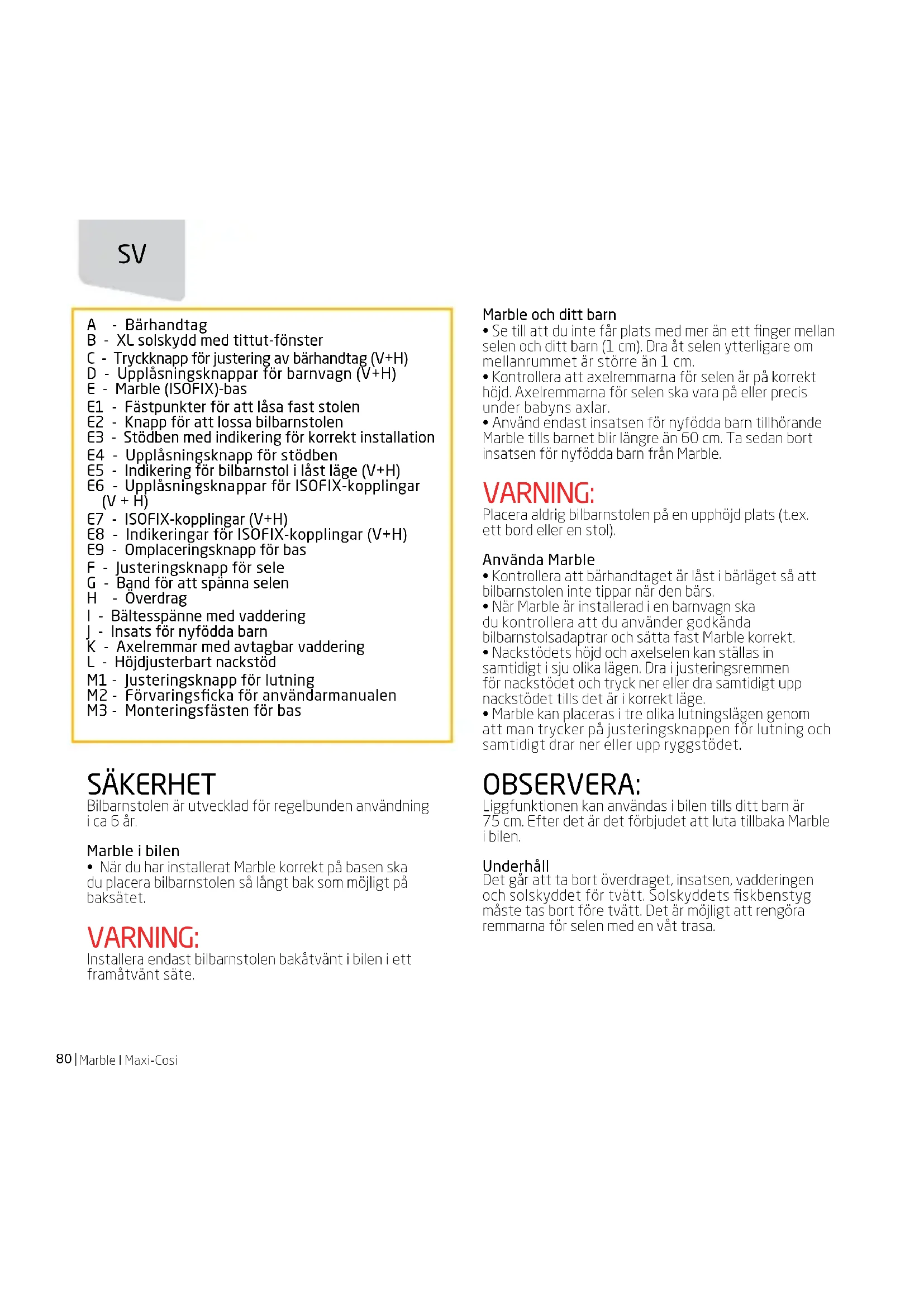 A - Bärhandtag B - XL solskydd med tittut-fönster C - Tryckknapp för justering av bärhandtag (V+H) D - Upplåsningsknappar för barnvagn (V+H) E - Marble (ISOFIX)-bas E1 - Fästpunkter för att låsa fast stolen E2 - Knapp för att lossa bilbarnstolen E3 - Stödben med indikering för korrekt installation E4 - Upplåsningsknapp för stödben E5 - Indikering för bilbarnstol i låst läge (V+H) E6 - Upplåsningsknappar för ISOFIX-kopplingar (V + H) E7 - ISOFIX-kopplingar (V+H) E8 - Indikeringar för ISOFIX-kopplingar (V+H) E9 - Omplaceringsknapp för bas F - Justeringsknapp för sele G - Band för att spänna selen H - Överdrag I - Bältesspänne med vaddering J - Insats för nyfödda barn K - Axelremmar med avtagbar vaddering L - Höjdjusterbart nackstöd M1 - Justeringsknapp för lutning M2 - Förvaringsficka för användarmanualen M3 - Monteringsfästen för basMaxi-Cosi