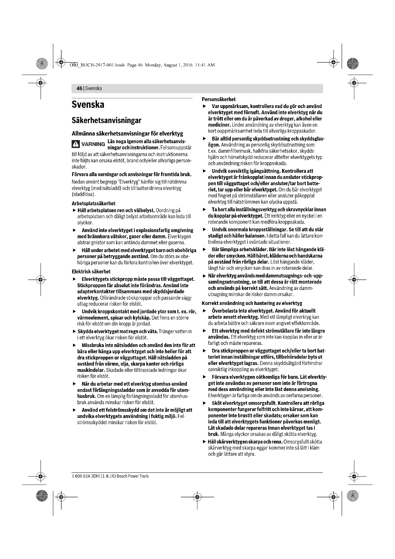 - i relation till använt batteri ** begränsad effekt vid temperaturer <0 °C OBJ_BUCH-2917-001.book Page 48 Monday, August 1, 2016 11:41 AMSvenska | 49 Bosch Power Tools 1 609 92A 2DH | (1.8.16) Drift Driftstart Insättning av batteri Anvisning: Använd endast för elverktyget lämpliga batterier, i annat fall finns risk för felfunktion eller skador på elverkty- get. Inställning av rotationsriktning (se bild C) Med riktningsomkopplaren 4 kan elverktygets rotationsrikt- ning ändras. Vid nedtryckt strömställare Till/Från 5 kan omkoppling inte ske. Högergång: För borrning och idragning av skruvar tryck rikt- ningsomkopplaren 4 åt vänster mot stopp. Vänstergång: För lossning och urdragning av skruvar tryck riktningsomkopplaren 4 åt höger mot stopp. Förval av vridmoment Med sliden för vridmomentförval 6 kan erforderligt vridmo- ment väljas i steg om 8. När vridmomentet är korrekt inställt löser rasterkopplingen ut när skruven ligger i plan med mate- rialets yta eller när inställt vridmoment har uppnåtts. I läget ” ” är rasterkopplingen avaktiverad t. ex. för borrning. Vid vänstergång är rasterkopplingen avaktiverad. In- och urkoppling Tryck för start av elverktyget ned strömställaren Till/Från 5 och håll den nedtryckt. För frånkoppling av elverktyget släpp strömställaren Till/Från 5. För att spara energi, koppla på elverktyget endast när du vill använda det. Inställning av varvtal Varvtalet på inkopplat elverktyg kan justeras steglöst genom att mer eller mindre trycka ned strömställaren Till/Från 5. Ett lätt tryck på strömställaren Till/Från 5 ger ett lågt varvtal. Med tilltagande tryck ökar varvtalet. Helautomatisk spindellåsning (Auto-Lock) Vid opåverkad strömställare Till/Från 5 är borrspindeln och även verktygsfästet låsta. Detta möjliggör idragning av skruvar även om batteriet är för- brukat, dvs verktyget kan användas som en normal skruvdra- gare. Temperaturberoende överbelastningsskydd Elverktyget kan inte överbelastas om användning sker enligt föreskrifterna. Vid för stark belastning eller vid temperaturer som avviker från tillåten temperaturintervall stängs elverkty- get av. Vid automatisk avstängning, stäng av elverktyget, låt batteriet kylas av och slå därefter på elverktyget igen. Djupurladdningsskydd Litium-jonbatteriet är med ”Electronic Cell Protection (ECP)” skyddad mot djupurladdning. Vid urladdat batteri kopplar skyddskopplingen från elverktyget: Insatsverktyget roterar inte längre. Tippbart verktygshuvud (se bild D) Verktygshuvudet kan låsas i 5 olika vinkellägen. Tryck ned upplåsningsknappen 7 och sväng verktygshuvudet till önskat läge. Släpp åter upplåsningsknappen 7. Kontrollera innan arbetet påbörjas att verktygshuvu- det är låst i inställt vinkelläge. Risk för kroppsskada. Arbetsanvisningar Elverktyget ska vara frånkopplat när det förs mot skru- ven. Roterande insatsverktyg kan slira bort. Upphängningsbygel Elverktyget kan med den fällbara upphängningsbygeln 8 hängas upp t. ex. på en hake. Vid upphängt elverktyg är båda händerna lediga och elverktyget är alltid till hands. Underhåll och service Underhåll och rengöring Innan åtgärder utförs på elverktyget ska batterimodu- len tas ut. Håll elverktyget och dess ventilationsöppningar rena för bra och säkert arbete. Kontakta en auktoriserad serviceverkstad för Bosch-elverk- tyg när batteriet inte längre är funktionsdugligt. Om i elverktyget trots exakt tillverkning och sträng kontroll störning skulle uppstå, bör reparation utföras av auktoriserad serviceverkstad för Bosch elverktyg. Ange alltid vid förfrågningar och reservdelsbeställningar det 10-siffriga produktnumret som finns på elverktygets typskylt. Kundtjänst och användarrådgivning Kundservicen ger svar på frågor beträffande reparation och underhåll av produkter och reservdelar. Sprängskisser och information om reservdelar hittar du på: www.bosch-pt.com Bosch användarrådgivningsteamet hjälper gärna vid frågor som gäller våra produkter och tillbehör. Ange alltid vid förfrågningar och reservdelsbeställningar det 10-siffriga produktnumret som finns på produktens typskylt. Svenska Bosch Service Center Telegrafvej 3 2750 Ballerup Danmark Tel.: (08) 7501820 (inom Sverige) Fax: (011) 187691 Transport De litiumjonbatterier som ingår är underkastade kraven för farligt gods. Användaren kan utan ytterligare förpliktelser transportera batterierna på allmän väg. Vid transport genom tredje person (t. ex. flygfrakt eller spedi- tion) ska speciella villkor för förpackning och märkning beak- tas. I detta fall bör vid förberedelse av transport en expert för farligt gods konsulteras. OBJ_BUCH-2917-001.book Page 49 Monday, August 1, 2016 11:41 AM50 | Norsk 1 609 92A 2DH | (1.8.16) Bosch Power Tools Batterier får försändas endast om höljet är oskadat. Tejpa öppna kontakter och förpacka batteriet så att det inte kan röras i förpackningen. Beakta även tillämpliga nationella föreskrifter. Avfallshantering Elverktyg, batterier, tillbehör och förpackning ska omhändertas på miljövänligt sätt för återvinning. Släng inte elverktyg och inte heller batterier i hushållsavfall! Endast för EU-länder: Enligt europeiska direktivet 2012/19/EU måste obrukbara elverktyg och enligt euro- peiska direktivet 2006/66/EG felaktiga eller förbrukade batterier separat omhän- dertas och på miljövänligt sätt lämnas in för återvinning. Sekundär-/primärbatterier: Li-jon: Beakta anvisningarna i avsnittet ”Transport”, sida 49. Ändringar förbehålles. Norsk Sikkerhetsinformasjon Generelle advarsler for elektroverktøy Les gjennom alle advarslene og anvis- ningene. Feil ved overholdelsen av ad- varslene og nedenstående anvisninger kan medføre elektri- ske støt, brann og/eller alvorlige skader. Ta godt vare på alle advarslene og informasjonene. Det nedenstående anvendte uttrykket «ele