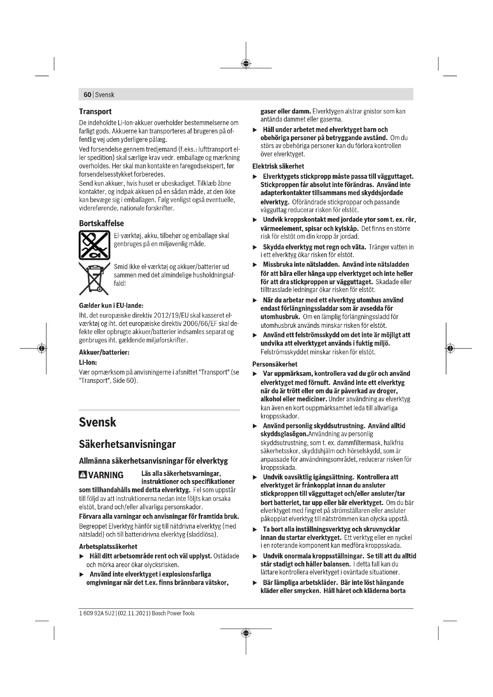 Drej muffen til den selvspændende borepatron (2) kraftigt i rotationsretningen ➋ med hånden. Borepatronen låses der- efter automatisk. Støv-/spånudsugning Støv fra materialer som f.eks. blyholdig maling, nogle træ- sorter, mineraler og metal kan være sundhedsfarlige. Berø- ring eller indånding af støv kan føre til allergiske reaktioner og/eller åndedrætssygdomme hos brugeren eller personer, der opholder sig i nærheden af arbejdspladsen. Bestemt støv som f.eks. ege- eller bøgestøv gælder som kræftfremkaldende, især i forbindelse med ekstra stoffer til træbehandling (chromat, træbeskyttelsesmiddel). Asbest- holdigt materiale må kun bearbejdes af fagfolk. – Sørg for god udluftning af arbejdspladsen. – Det anbefales at bære åndeværn med filterklasse P2. Overhold forskrifterne, der gælder i dit land vedr. de materi- aler, der skal bearbejdes. u Undgå at der samler sig støv på arbejdspladsen. Støv kan let antænde sig selv. Brug Ibrugtagning Isætning af akku Bemærk: Hvis der anvendes akkuer, som ikke er godkendt til dit el-værktøj, kan det resultere i fejlfunktion eller ødelæg- gelse af el-værktøjet. Sæt retningsomskifteren (13) i midten for at forhindre en utilsigtet start. Isæt den opladede akku (8) i grebet, indtil den går mærkbart i indgreb og ligger helt an mod grebet. Indstilling af rotationsretning (se billede B) u Aktivér kun drejeretningsomskifteren (13), når el- værktøjet står stille. Med retningsomskifteren (13) kan du ændre el-værktøjets drejeretning. Ved nedtrykket start-stop-kontakt (14) er det- te imidlertid ikke muligt. Højreløb: Ved boring og iskruning af skruer skal du skubbe drejeretningsomskifteren (13) til venstre til anslag. Venstreløb: Til løsning og uddrejning af skruer og møtrikker trykkes retningsomskifteren (13) helt mod højre. Indstilling af driftstype Boring GSR 18 V-EC: Stil indstillingsringen til forvalg af drejningsmoment(3) på symbolet "Boring". GSB 18 V-EC: Stil driftstype-valgknappen(4) på symbolet "Boring". Skruning Sæt indstillingsringen til forvalg af drejningsmoment(3) på det ønskede drejnings- moment. GSB 18 V-EC: Stil driftstype-valgknappen(4) på symbolet "Skruning". Slagboring (GSB18V-EC) Indstil driftstype-valgknappen(4) på symbolet "Slagboring". 1 609 92A 5U2 | (02.11.2021) Bosch Power ToolsDansk | 59 Tænd/sluk Til ibrugtagning af el‑værktøjet tryk på start-stop-kontakten (14) og hold den nede. LED'en (10) lyser, når tænd/sluk-kontakten (14) er trykket halvt eller helt ned, så skruestedet kan lyses op under dårlige lysforhold. El‑værktøjet slukkes ved at slippe start-stop-kontakten (14) igen. Indstil omdrejningstal Du kan regulere omdrejningstallet på det tændte el-værktøj trinløst afhængigt af, hvor langt du trykker start-stop-kontak- ten (14) ind. Let tryk på start-stop‑kontakten (14) fører til et lavt omdrej- ningstal. Med tiltagende tryk øges omdrejningstallet. Forvalg af drejningsmoment Med indstillingsringen til forvalg af drejningsmoment (3) kan du forvælge det nødvendige drejningsmoment i 20trin. Så snart det indstillede drejningsmoment er nået, standser ind- satsværktøjet. Mekanisk gearvalg u Aktivér kun gearvælgeren (5), når elværktøjet står stille. u Skub altid gearvælgeren til anslag. Ellers kan el‑værktø- jet blive beskadiget. Gear 1: Lavt omdrejningstalsområde; til skruning eller til arbejde med stor bordiameter. Gear 2: Højt omdrejningstalsområde; til arbejde med små bordiame- tre. Temperaturafhængig overbelastningsbeskyttelse Ved korrekt brug kan el-værktøjet ikke blive overbelastet. I tilfælde af for kraftig belastning, eller hvis det tilladte akku- temperaturområde over- eller underskrides, reduceres om- drejningstallet. El-værktøjet kører først, når den tilladte ak- ku-temperatur er opnået med fuldt omdrejningstal. Den temperaturafhængige overbelastningssikring vises ved, at den røde lysdiode(11) på el-værktøjet lyser. Når lysdioden(11) går ud, befinder maskinen sig igen inden for det tilladte temperaturområde. Dybafladningsbeskyttelse Lithium-ion-batteriet er beskyttet mod dybafladning via elek- tronisk cellebeskyttelse (ECP). Er akkuen afladet, slukkes el- værktøjet med en beskyttelseskontakt: Indsatsværktøjet be- væger sig ikke mere. Hurtigfrakobling (KickBack Control) Hurtigfrakoblingen (KickBack Control) gi- ver en bedre kontrol over el-værktøjet og forøger derved brugerbeskyttelsen i for- hold til el-værktøj uden KickBack Control. Ved pludselig og uforudselig rotation af el-værktøjet om- kring borets akse slås el-værktøjet fra. Hurtigafbrydelse vises ved, at lysdioden på el-værktøjet blin- ker. For at tage maskinen i brug igen skal du slippe tænd/sluk- kontakten og aktivere den igen. u Hvis funktionen KickBack Control er defekt, kan el- værktøjet ikke mere tændes. Sørg for, at el-værktøjet kun repareres af kvalificerede fagfolk, og at der kun benyttes originale reservedele. Arbejdsvejledning u Sæt kun el-værktøjet mod skruen i slukket tilstand. Roterende indsatsværktøjer kan skride. Hvis du vil fjerne skruetrækkerbitten eller universalbithol- deren, kan du bruge et hjælpeværktøj. Bælteholdeclip Med bælteholdeclippen kan du hænge el-værktøjet fast i f.eks. et bælte. Derved har du begge hænder fri og el-værk- tøjet er lige ved hånden. Farveclip (se billedeD) Med farveclippen(6) kan du mærke el-værktøjet individuelt. Vedligeholdelse og service Vedligeholdelse og rengøring u Tag altid akkuen ud af el‑værktøjet, før der arbejdes på el‑værktøjet (f.eks. vedligeholdelse, værktøjsskift osv.) samt før det transporteres og lægges til opbeva- ring. Utilsigtet aktivering af start-stop-kontakten er for- bundet med kvæstelsesfare. u El‑værktøj og el‑værktøjets ventilationsåbninger skal altid holdes rene for at sikre et godt og sikkert ar- bejde. Kundeservice og anvendelsesrådgivning Kundeservice besvarer dine spørgsmål vedr. repara