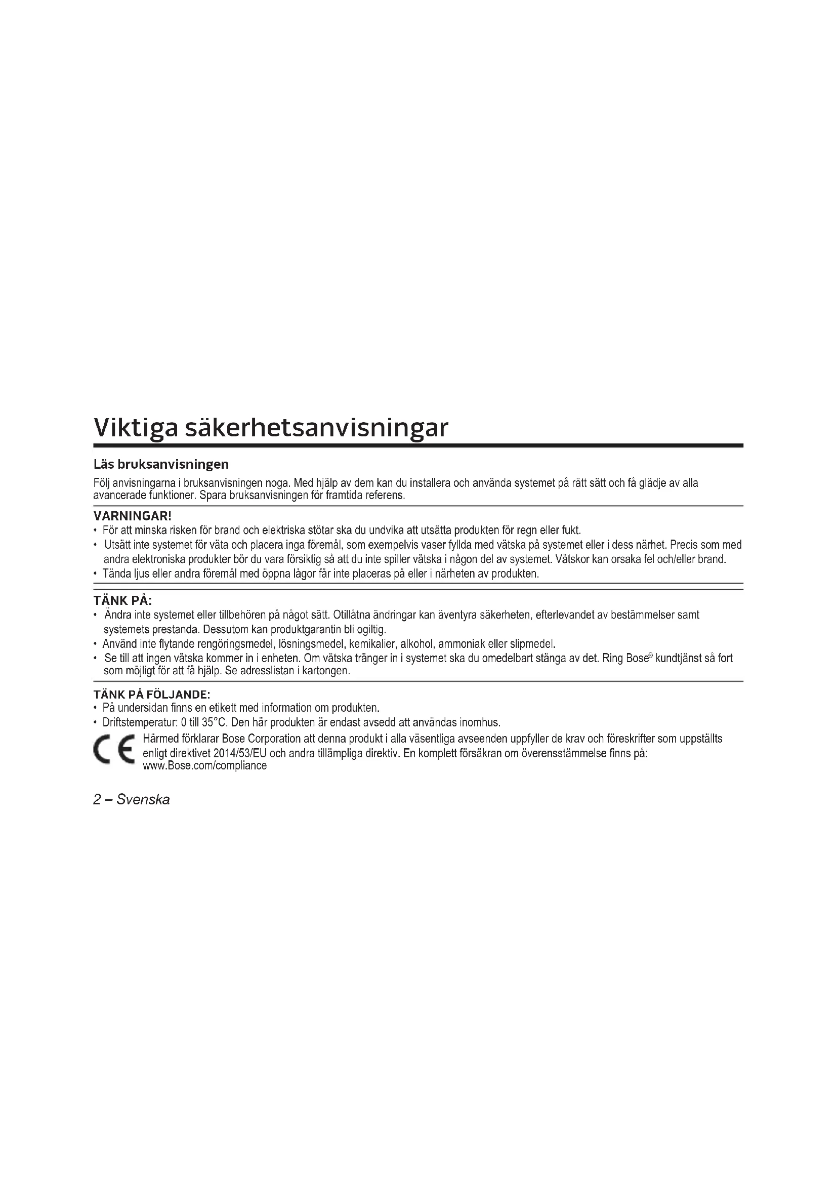 são marcas comerciais registradas pertencentes à Bluetooth SIG, Inc. e qualquer utilização de tais marcas pela Bose Corporation é feita sob licença.2 – Svenska Läs bruksanvisningen Följ anvisningarna i bruksanvisningen noga. Med hjälp av dem kan du installera och använda systemet på rätt sätt och få glädje av alla avancerade funktioner. Spara bruksanvisningen för framtida referens. VARNINGAR!