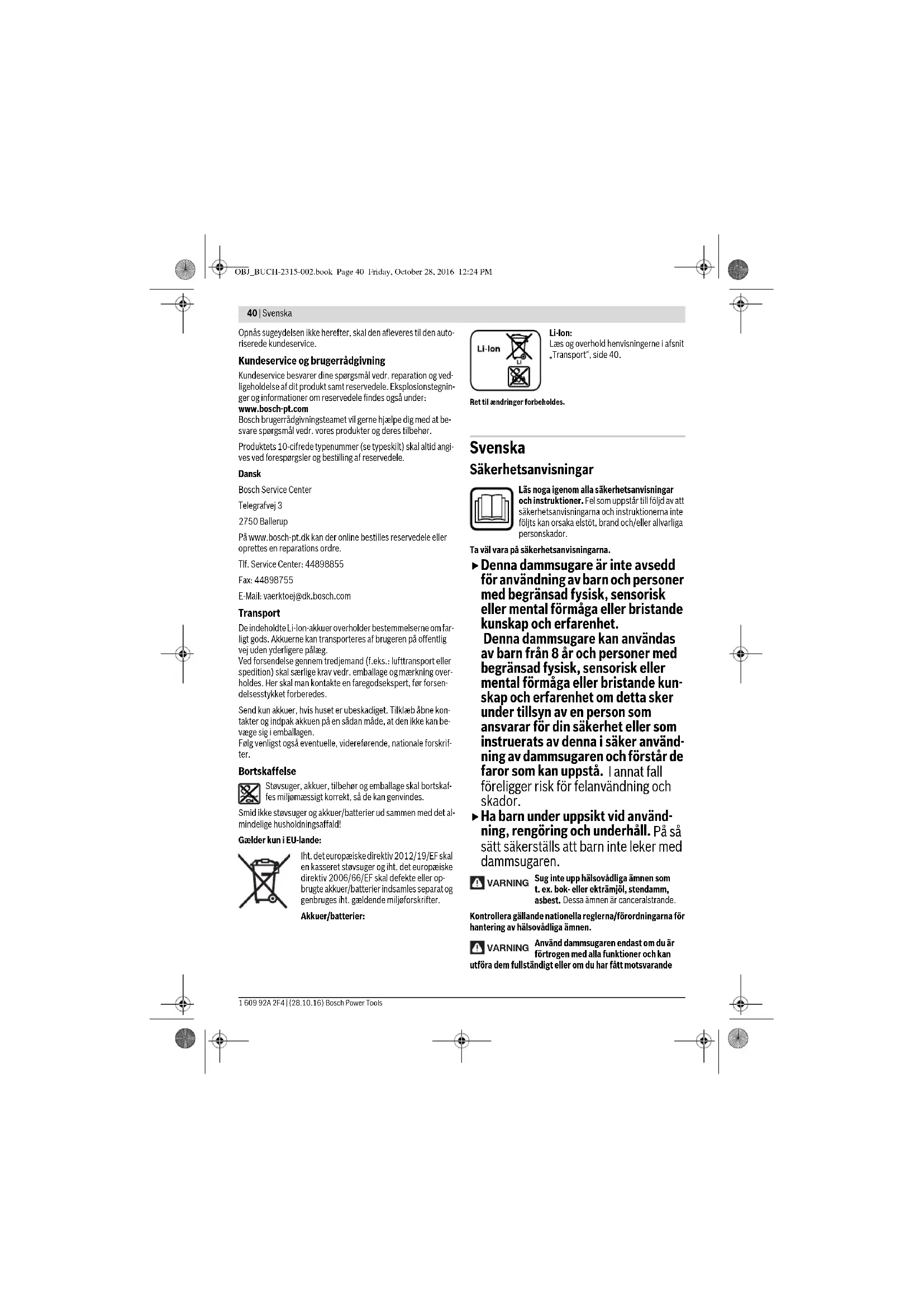 garanterar optimal sugeffekt. Om sugeffekten inte uppnås efter dessa åtgärder, ska dammsu- garen skickas till kundservicen. Kundtjänst och användarrådgivning Kundservicen ger svar på frågor beträffande reparation och underhåll av produkter och reservdelar. Sprängskisser och information om reservdelar hittar du på: www.bosch-pt.com Bosch användarrådgivningsteamet hjälper gärna vid frågor som gäller våra produkter och tillbehör. Ange alltid vid förfrågningar och reservdelsbeställningar det 10-siffriga produktnumret som finns på produktens typskylt. Svenska Bosch Service Center Telegrafvej 3 2750 Ballerup Danmark Tel.: (08) 7501820 (inom Sverige) Fax: (011) 187691 Transport De litiumjonbatterier som ingår är underkastade kraven för far- ligt gods. Användaren kan utan ytterligare förpliktelser transpor- tera batterierna på allmän väg. Vid transport genom tredje person (t. ex. flygfrakt eller spedi- tion) ska speciella villkor för förpackning och märkning beaktas. I detta fall bör vid förberedelse av transport en expert för farligt gods konsulteras. OBJ_BUCH-2315-002.book Page 43 Friday, October 28, 2016 12:24 PM44 | Norsk 1 609 92A 2F4 | (28.10.16) Bosch Power ToolsBatterier får försändas endast om höljet är oskadat. Tejpa öppna kontakter och förpacka batteriet så att det inte kan röras i för-packningen.Beakta även tillämpliga nationella föreskrifter. Avfallshantering Dammsugare, batteri, tillbehör och förpackningar ska omhändertas på miljövänligt sätt för återvinning.Släng inte dammsugaren eller batterierna i hushållsavfallet!Endast för EU-länder:Enligt det europeiska direktivet 2012/19/EG skall obrukbara sugare och enligt det europe-iska direktivet 2006/66/EG felaktiga eller förbrukade batterier samlas in separat och tillföras en miljöanpassad avfallshantering.Sekundär-/primärbatterier:Li-jon:Beakta anvisningarna i avsnittet ”Trans-port”, sida 43.Ändringar förbehålles. Norsk Sikkerhetsinformasjon Les gjennom alle advarslene og anvisningene. Feil ved overholdelsen av advarslene og neden-stående anvisninger kan medføre elektriske støt, brann og/eller alvorlige skader.Ta godt vare på disse informasjonene.