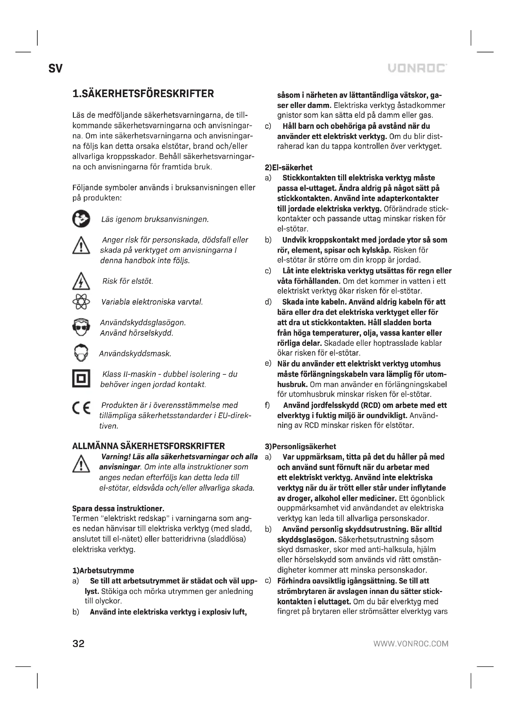 GARANTI VONROC produkter är utvecklade enligt högsta kva- litetsstandard och garanteras vara utan defekter både vad gäller material och tillverkning under den period som stipuleras enligt lag med början från ursprungligt inköpsdatum. Om något fel uppstår på produkten under denna period på grund av material- och/eller tillverkningsfel skall VONROC kontaktas direkt. Följande omständigheter exkluderas från denna garanti: