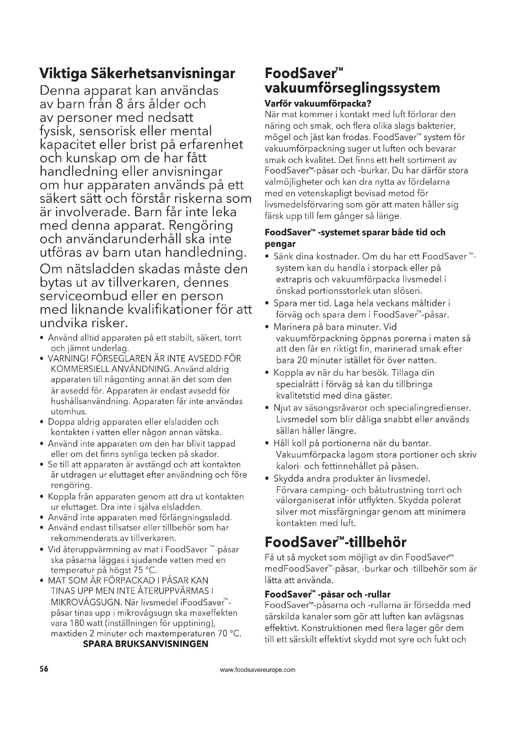 påsar tinas upp i mikrovågsugn ska maxeffekten vara 180 watt (inställningen för upptining), maxtiden 2 minuter och maxtemperaturen 70°C. SPARA BRUKSANVISNINGEN FoodSaver