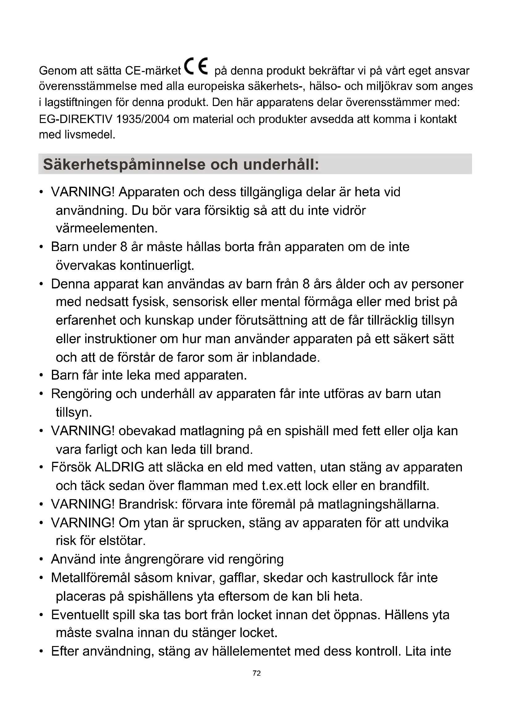 - Rengöring och underhåll av apparaten får inte utföras av barn utan tillsyn.