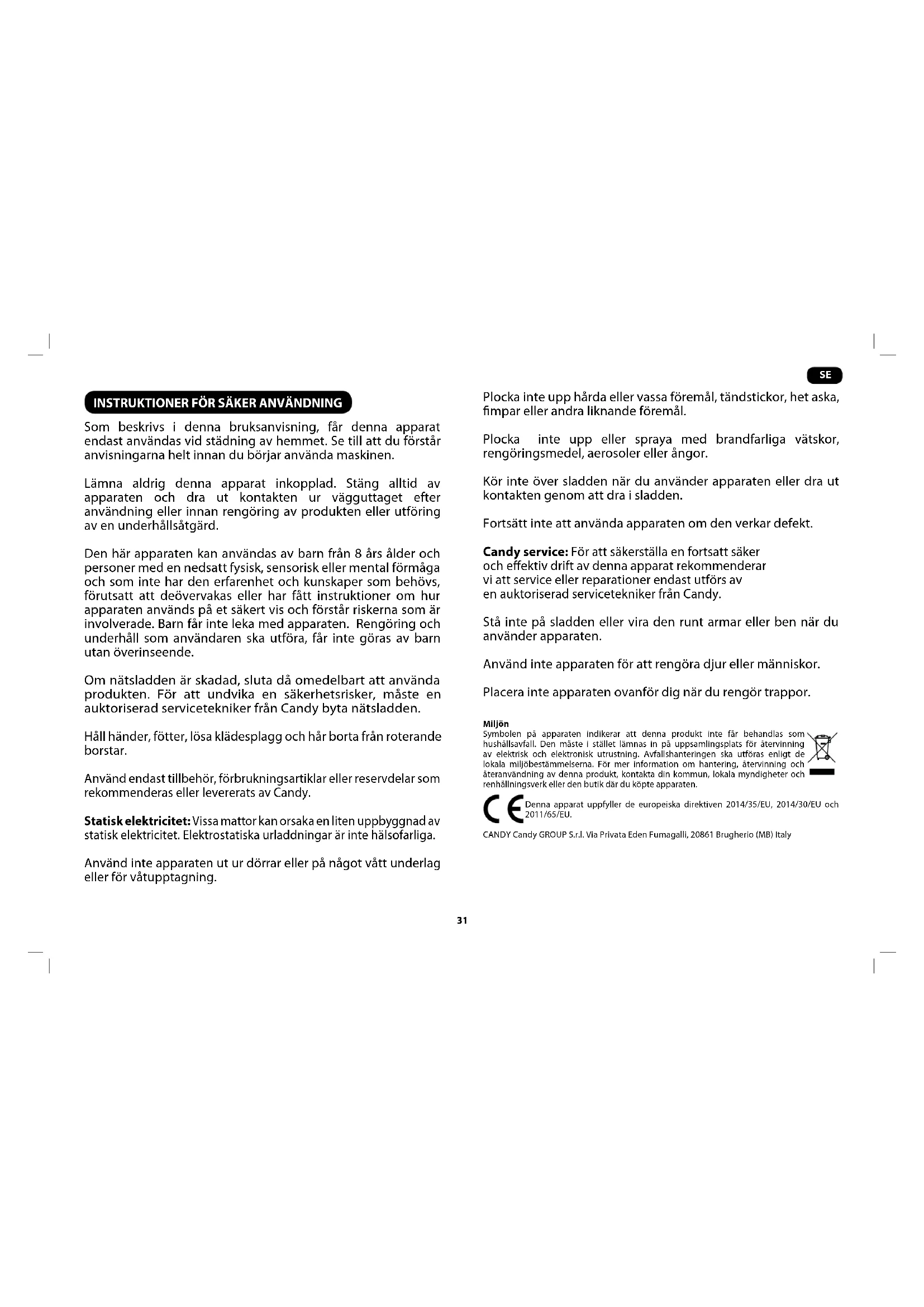 INSTRUKTIONER FÖR SÄKER ANVÄNDNING Som beskrivs i denna bruksanvisning, får denna apparat endast användas vid städning av hemmet. Se till att du förstår anvisningarna helt innan du börjar använda maskinen. Lämna aldrig denna apparat inkopplad. Stäng alltid av apparaten och dra ut kontakten ur vägguttaget efter användning eller innan rengöring av produkten eller utföring av en underhållsåtgärd. Den här apparaten kan användas av barn från 8 års ålder och personer med en nedsatt fysisk, sensorisk eller mental förmåga och som inte har den erfarenhet och kunskaper som behövs, förutsatt att deövervakas eller har fått instruktioner om hur apparaten används på et säkert vis och förstår riskerna som är involverade. Barn får inte leka med apparaten. Rengöring och underhåll som användaren ska utföra, får inte göras av barn utan överinseende. Om nätsladden är skadad, sluta då omedelbart att använda produkten. För att undvika en säkerhetsrisker, måste en auktoriserad servicetekniker från Candy byta nätsladden. Håll händer, fötter, lösa klädesplagg och hår borta från roterande borstar. Använd endast tillbehör, förbrukningsartiklar eller reservdelar som rekommenderas eller levererats av Candy. Statisk elektricitet: Vissa mattor kan orsaka en liten uppbyggnad av statisk elektricitet. Elektrostatiska urladdningar är inte hälsofarliga. Använd inte apparaten ut ur dörrar eller på något vått underlag eller för våtupptagning. Plocka inte upp hårda eller vassa föremål, tändstickor, het aska, mpar eller andra liknande föremål. Plocka inte upp eller spraya med brandfarliga vätskor, rengöringsmedel, aerosoler eller ångor. Kör inte över sladden när du använder apparaten eller dra ut kontakten genom att dra i sladden. Fortsätt inte att använda apparaten om den verkar defekt. Candy service: För att säkerställa en fortsatt säker och eektiv drift av denna apparat rekommenderar vi att service eller reparationer endast utförs av en auktoriserad servicetekniker från Candy. Stå inte på sladden eller vira den runt armar eller ben när du använder apparaten. Använd inte apparaten för att rengöra djur eller människor. Placera inte apparaten ovanför dig när du rengör trappor. Miljön Symbolen på apparaten indikerar att denna produkt inte får behandlas som hushållsavfall. Den måste i stället lämnas in på uppsamlingsplats för återvinning av elektrisk och elektronisk utrustning. Avfallshanteringen ska utföras enligt de lokala miljöbestämmelserna. För mer information om hantering, återvinning och återanvändning av denna produkt, kontakta din kommun, lokala myndigheter och renhållningsverk eller den butik där du köpte apparaten. Denna apparat uppfyller de europeiska direktiven 2014/35/EU, 2014/30/EU och 2011/65/EU. CANDY Candy GROUP S.r.l. Via Privata Eden Fumagalli, 20861 Brugherio (MB) Italy32