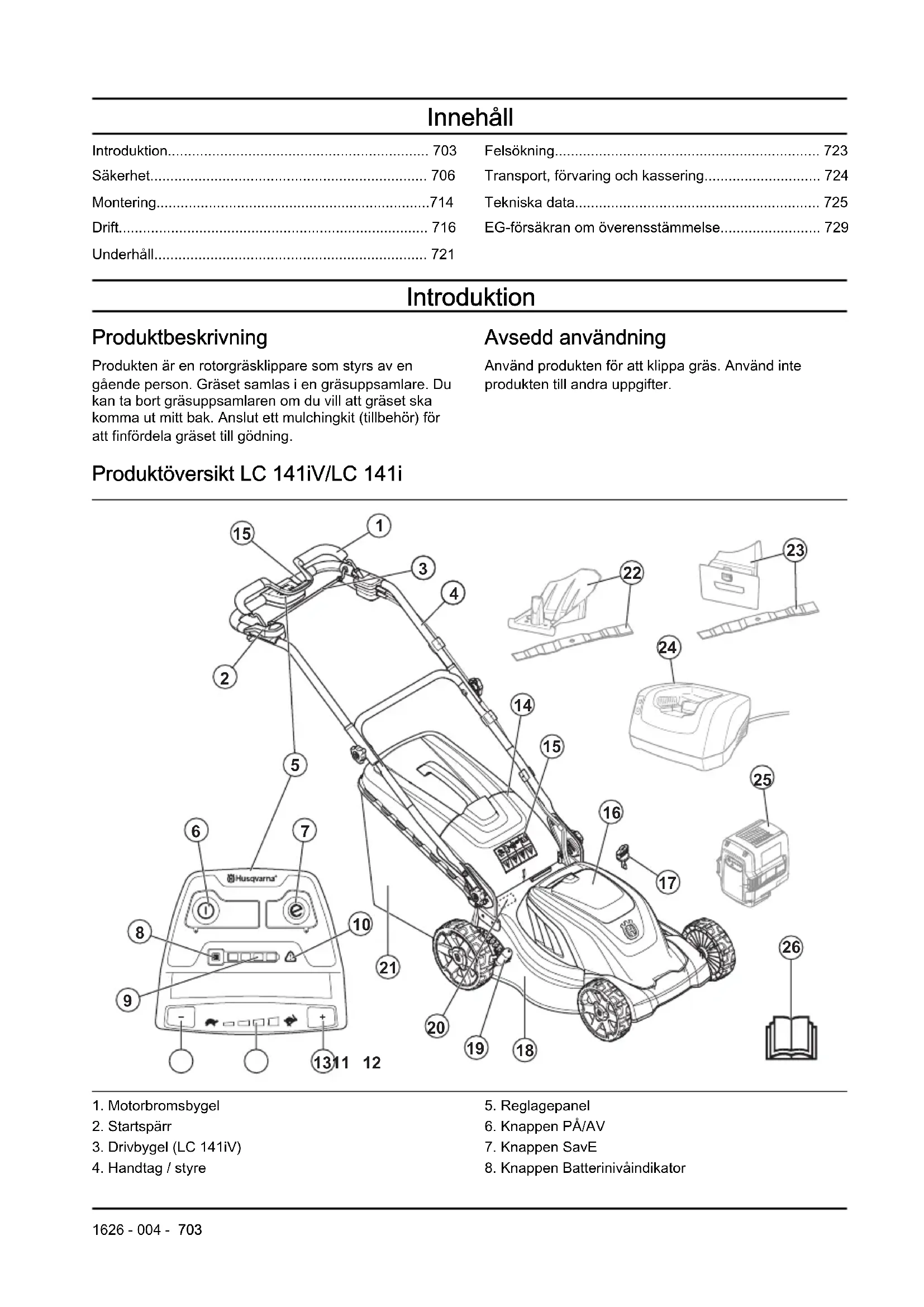 - EG‐försäkran om överensstämmelse Introduktion Produktbeskrivning Produkten är en rotorgräsklippare som styrs av en gående person. Gräset samlas i en gräsuppsamlare. Du kan ta bort gräsuppsamlaren om du vill att gräset ska komma ut mitt bak. Anslut ett mulchingkit (tillbehör) för att finfördela gräset till gödning. Avsedd användning Använd produkten för att klippa gräs. Använd inte produkten till andra uppgifter. Produktöversikt LC 141iV/LC 141i p. 729