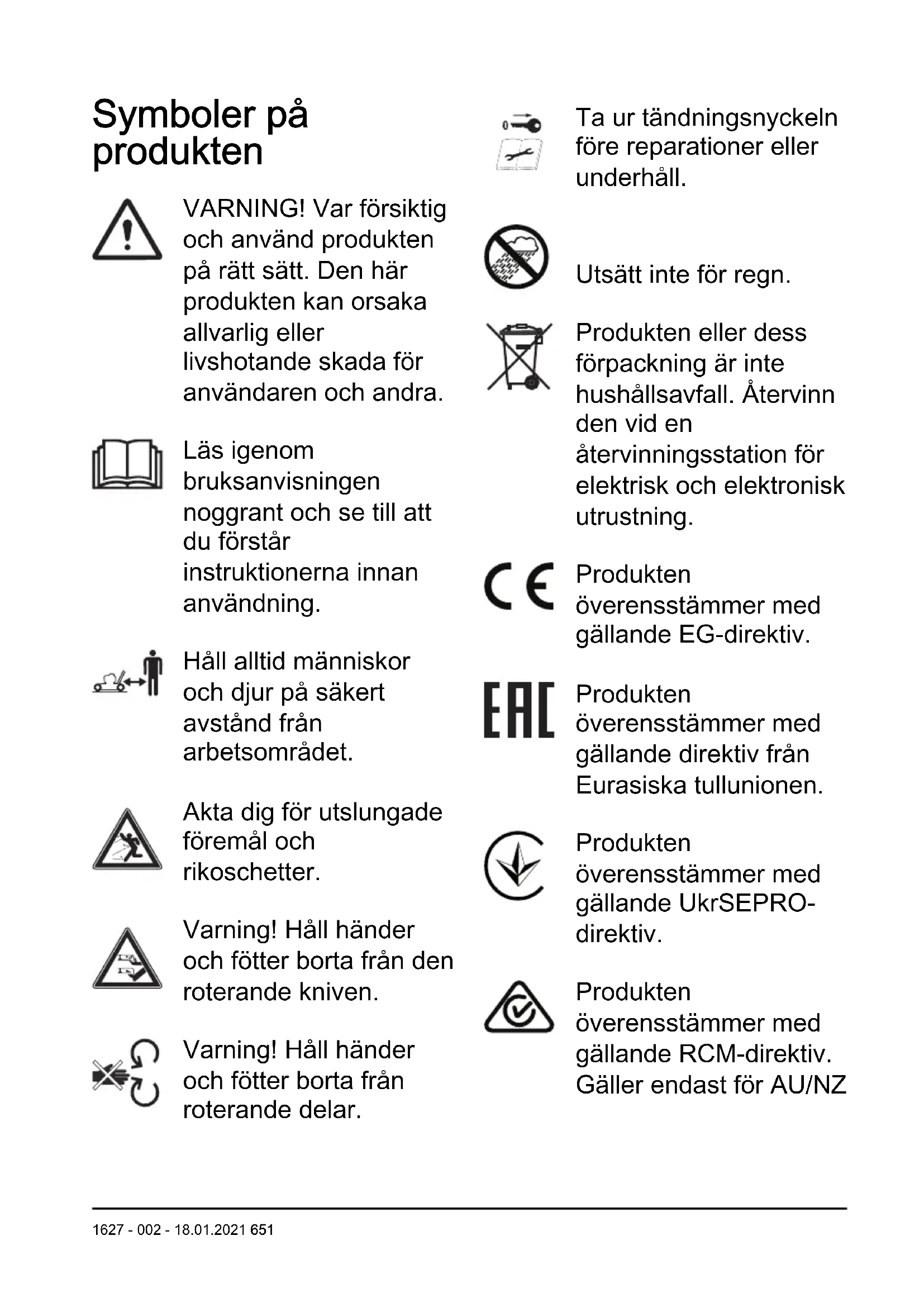 650 1627 - 002 - 18.01.2021Symboler på produkten VARNING! Var försiktig och använd produkten på rätt sätt. Den här produkten kan orsaka allvarlig eller livshotande skada för användaren och andra. Läs igenom bruksanvisningen noggrant och se till att du förstår instruktionerna innan användning. Håll alltid människor och djur på säkert avstånd från arbetsområdet. Akta dig för utslungade föremål och rikoschetter. Varning! Håll händer och fötter borta från den roterande kniven. Varning! Håll händer och fötter borta från roterande delar. Ta ur tändningsnyckeln före reparationer eller underhåll. Utsätt inte för regn. Produkten eller dess förpackning är inte hushållsavfall. Återvinn den vid en återvinningsstation för elektrisk och elektronisk utrustning. Produkten överensstämmer med gällande EG-direktiv. Produkten överensstämmer med gällande direktiv från Eurasiska tullunionen. Produkten överensstämmer med gällande UkrSEPRO- direktiv. Produkten överensstämmer med gällande RCM-direktiv. Gäller endast för AU/NZ 1627 - 002 - 18.01.2021 651Emission av buller i miljön enligt EU-direktiv 2000/14/EG och New South Wales ”Protection of the Environment Operations (Noise Control) Regulation 2017”. Information om bulleremission finns på maskinens etikett och i avsnittet Tekniska data. Produkten har droppskydd. Startprocedur: Tryck på knappen PÅ/AV, lyft på startspärren och tryck ned motorbromsbygeln. Stoppa genom att släppa motorbromsbygeln. Långsamt Snabb Kod som kan skannas Notera: Övriga symboler/etiketter på produkten avser specifika krav för certifieringar på vissa marknader. Märkning på produkten Håll händer och fötter borta från de roterande knivarna. Produktansvar Enligt lagstiftningen för produktansvar ansvarar vi inte för skador som vår produkt orsakar om: