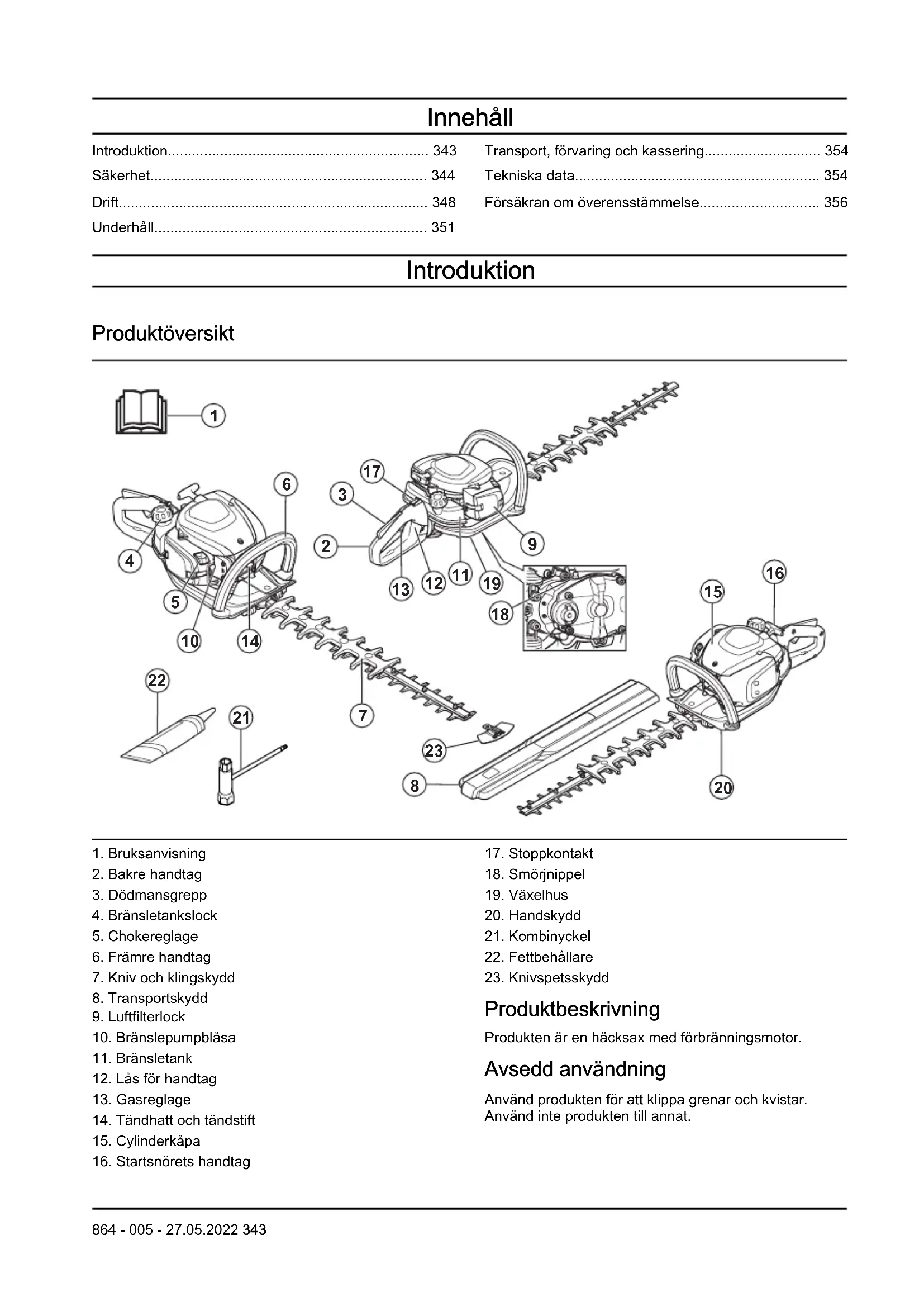 Produktbeskrivning Produkten är en häcksax med förbränningsmotor. Avsedd användning Använd produkten för att klippa grenar och kvistar. Använd inte produkten till annat.