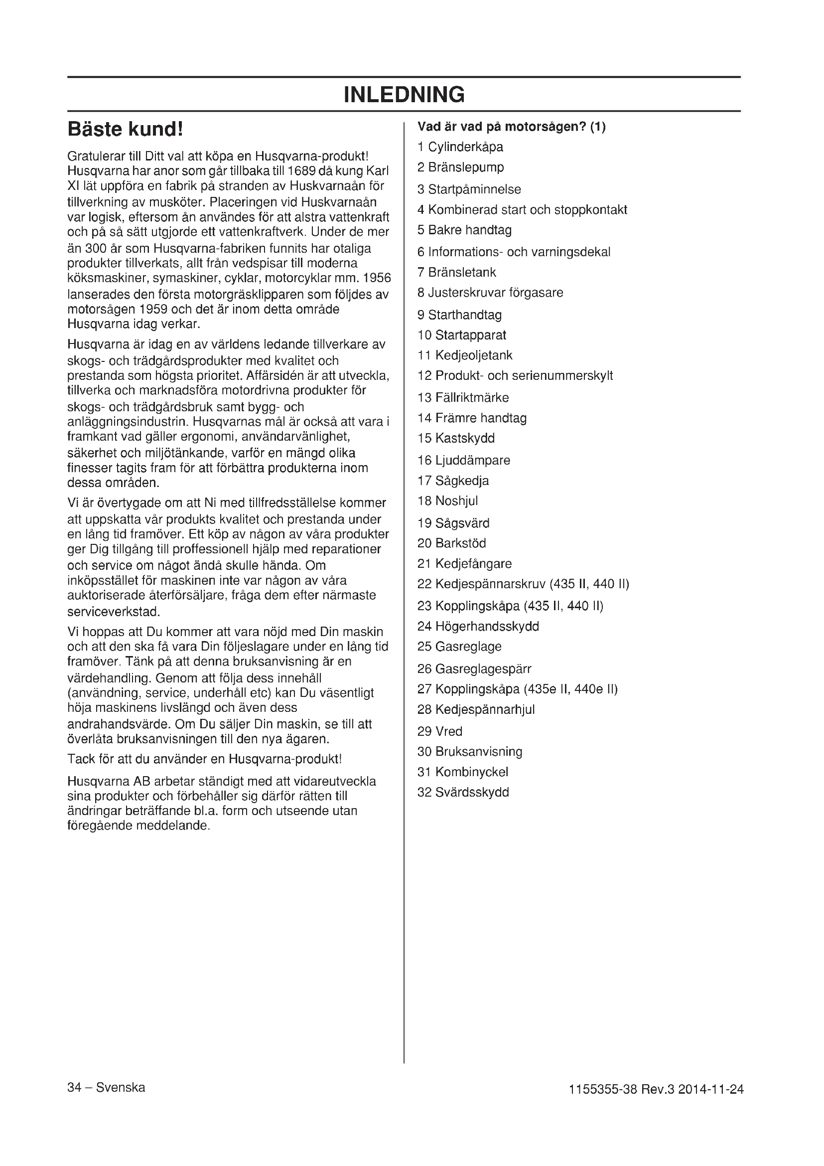 - EG-försäkran om överensstämmelse INLEDNING 34 – Svenska 1155355-38 Rev.3 2014-11-24 Bäste kund! Gratulerar till Ditt val att köpa en Husqvarna-produkt! Husqvarna har anor som går tillbaka till 1689 då kung Karl XI lät uppföra en fabrik på stranden av Huskvarnaån för tillverkning av musköter. Placeringen vid Huskvarnaån var logisk, eftersom ån användes för att alstra vattenkraft och på så sätt utgjorde ett vattenkraftverk. Under de mer än 300 år som Husqvarna-fabriken funnits har otaliga produkter tillverkats, allt från vedspisar till moderna köksmaskiner, symaskiner, cyklar, motorcyklar mm. 1956 lanserades den första motorgräsklipparen som följdes av motorsågen 1959 och det är inom detta område Husqvarna idag verkar. Husqvarna är idag en av världens ledande tillverkare av skogs- och trädgårdsprodukter med kvalitet och prestanda som högsta prioritet. Affärsidén är att utveckla, tillverka och marknadsföra motordrivna produkter för skogs- och trädgårdsbruk samt bygg- och anläggningsindustrin. Husqvarnas mål är också att vara i framkant vad gäller ergonomi, användarvänlighet, säkerhet och miljötänkande, varför en mängd olika finesser tagits fram för att förbättra produkterna inom dessa områden. Vi är övertygade om att Ni med tillfredsställelse kommer att uppskatta vår produkts kvalitet och prestanda under en lång tid framöver. Ett köp av någon av våra produkter ger Dig tillgång till proffessionell hjälp med reparationer och service om något ändå skulle hända. Om inköpsstället för maskinen inte var någon av våra auktoriserade återförsäljare, fråga dem efter närmaste serviceverkstad. Vi hoppas att Du kommer att vara nöjd med Din maskin och att den ska få vara Din följeslagare under en lång tid framöver. Tänk på att denna bruksanvisning är en värdehandling. Genom att följa dess innehåll (användning, service, underhåll etc) kan Du väsentligt höja maskinens livslängd och även dess andrahandsvärde. Om Du säljer Din maskin, se till att överlåta bruksanvisningen till den nya ägaren. Tack för att du använder en Husqvarna-produkt! Husqvarna AB arbetar ständigt med att vidareutveckla sina produkter och förbehåller sig därför rätten till ändringar beträffande bl.a. form och utseende utan föregående meddelande. Vad är vad på motorsågen? (1) 1 Cylinderkåpa 2 Bränslepump 3 Startpåminnelse 4 Kombinerad start och stoppkontakt 5 Bakre handtag 6 Informations- och varningsdekal 7 Bränsletank 8 Justerskruvar förgasare 9 Starthandtag 10 Startapparat 11 Kedjeoljetank 12 Produkt- och serienummerskylt 13 Fällriktmärke 14 Främre handtag 15 Kastskydd 16 Ljuddämpare 17 Sågkedja 18 Noshjul 19 Sågsvärd 20 Barkstöd 21 Kedjefångare 22 Kedjespännarskruv (435 II, 440 II) 23 Kopplingskåpa (435 II, 440 II) 24 Högerhandsskydd 25 Gasreglage 26 Gasreglagespärr 27 Kopplingskåpa (435e II, 440e II) 28 Kedjespännarhjul 29 Vred 30 Bruksanvisning 31 Kombinyckel 32 SvärdsskyddALLMÄNNA SÄKERHETSINSTRUKTIONER Svenska – 35 1155355-38 Rev.3 2014-11-24 Åtgärder före användning av ny motorsåg p. 56