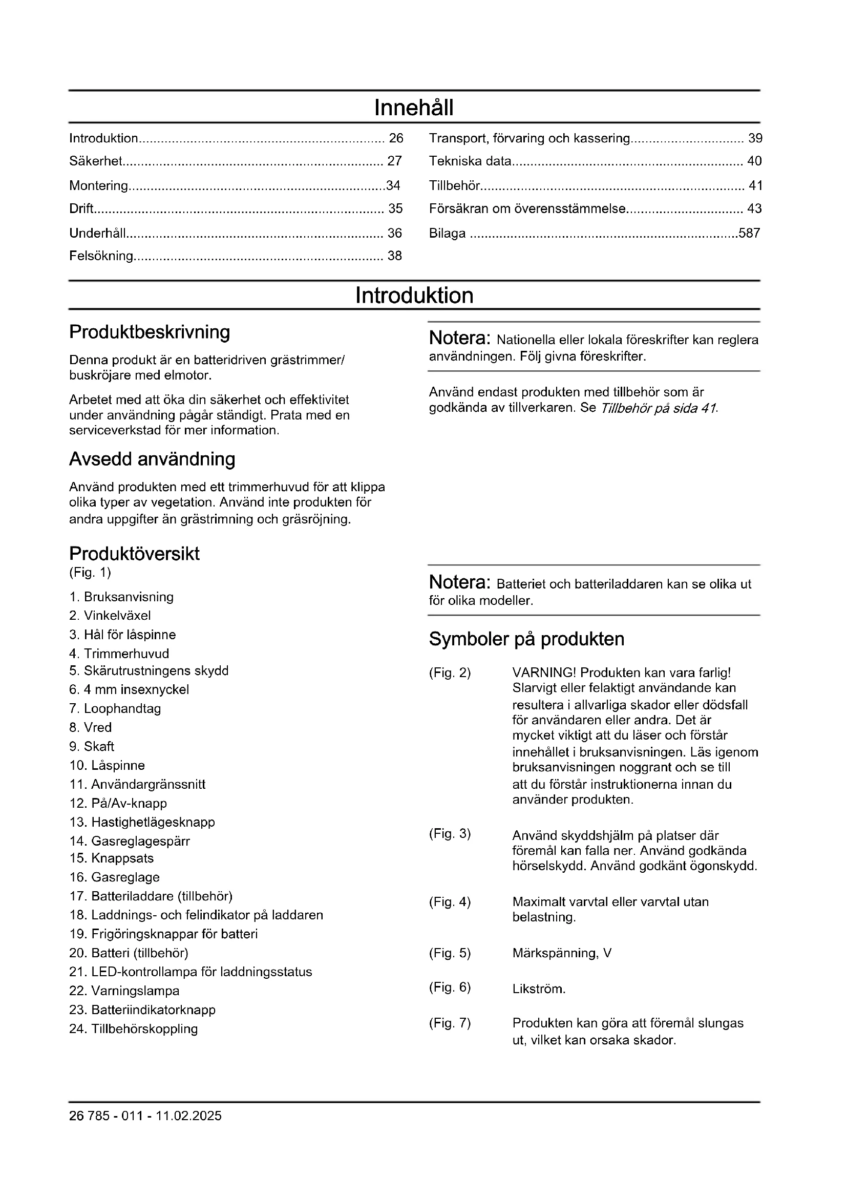 Notera: Batteriet och batteriladdaren kan se olika ut för olika modeller. Symboler på produkten (Fig. 2) VARNING! Produkten kan vara farlig! Slarvigt eller felaktigt användande kan resultera i allvarliga skador eller dödsfall för användaren eller andra. Det är mycket viktigt att du läser och förstår innehållet i bruksanvisningen. Läs igenom bruksanvisningen noggrant och se till att du förstår instruktionerna innan du använder produkten. (Fig. 3) Använd skyddshjälm på platser där föremål kan falla ner. Använd godkända hörselskydd. Använd godkänt ögonskydd. (Fig. 4) Maximalt varvtal eller varvtal utan belastning. (Fig. 5) Märkspänning, V (Fig. 6) Likström. (Fig. 7) Produkten kan göra att föremål slungas ut, vilket kan orsaka skador. 26 785 - 011 - 11.02.2025(Fig. 8) Använd endast icke-metallisk flexibel skärutrustning, dvs. trimmerhuvuden med trimmerlina. (Fig. 9) Produkten överensstämmer med gällande EG-direktiv. (Fig. 10) Använd godkända skyddshandskar. (Fig. 11) Använd kraftiga halksäkra kängor. (Fig. 12) Koppla bort batteriet före underhåll. (Fig. 13) Symbolen på produkten eller dess förpackning indikerar att denna produkt ej kan hanteras som hushållsavfall. Denna produkt ska överlämnas till lämplig återvinningsstation. (Fig. 14) Produkten har skydd mot vattenstänk. (Fig. 15) Håll alla delar av din kropp borta från de heta ytorna. (Fig. 16) Miljömärkning för bulleremission enligt EU- (inklusive lagstiftning för New South Wales) och brittiska direktiv och bestämmelser. Produktens garanterade ljudeffektnivå anges i Tekniska data på sida 40 och på etiketten. ååååvvxxxx Typskylten visar serienumret. yyyy är produktionsåret, ww är produktions- veckan och xxxx är sekvensnumret. (Fig. 17) Håll ett avstånd på minst 15m till personer och djur vid an- vändning av produkten. Notera: Övriga symboler/dekaler på produkten avser specifika krav för certifieringar på andra kommersiella marknader. Tillverkare Husqvarna AB Drottninggatan 2, SE-561 82 Huskvarna, Sweden, tel: +46-36-146500 Produktskada Vi ansvarar inte för skador på vår produkt om: