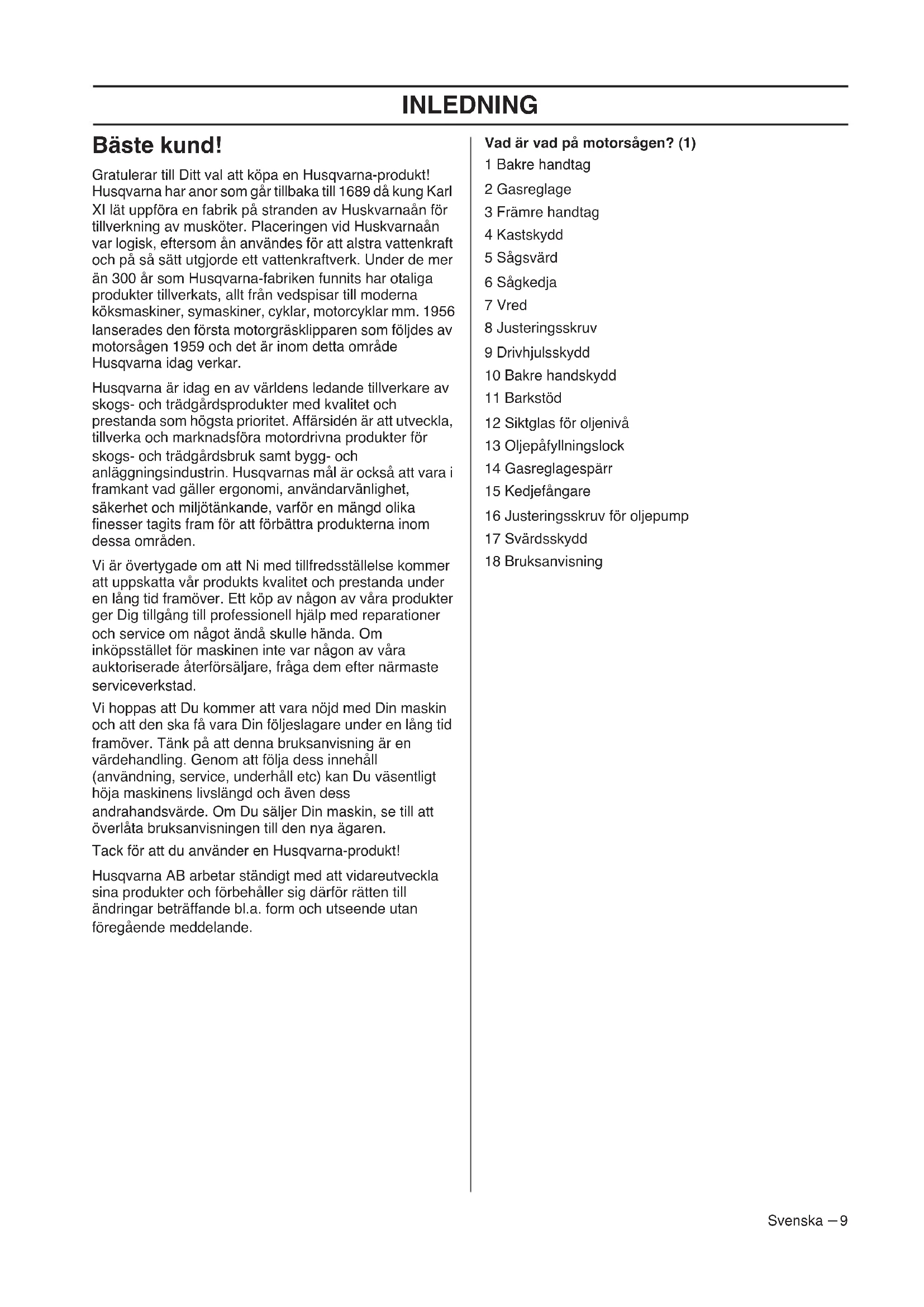 Bäste kund! Gratulerar till Ditt val att köpa en Husqvarna-produkt! Husqvarna har anor som går tillbaka till 1689 då kung Karl XI lät uppföra en fabrik på stranden av Huskvarnaån för tillverkning av musköter. Placeringen vid Huskvarnaån var logisk, eftersom ån användes för att alstra vattenkraft och på så sätt utgjorde ett vattenkraftverk. Under de mer än 300 år som Husqvarna-fabriken funnits har otaliga produkter tillverkats, allt från vedspisar till moderna köksmaskiner, symaskiner, cyklar, motorcyklar mm. 1956 lanserades den första motorgräsklipparen som följdes av motorsågen 1959 och det är inom detta område Husqvarna idag verkar. Husqvarna är idag en av världens ledande tillverkare av skogs- och trädgårdsprodukter med kvalitet och prestanda som högsta prioritet. Affärsidén är att utveckla, tillverka och marknadsföra motordrivna produkter för skogs- och trädgårdsbruk samt bygg- och anläggningsindustrin. Husqvarnas mål är också att vara i framkant vad gäller ergonomi, användarvänlighet, säkerhet och miljötänkande, varför en mängd olika finesser tagits fram för att förbättra produkterna inom dessa områden. Vi är övertygade om att Ni med tillfredsställelse kommer att uppskatta vår produkts kvalitet och prestanda under en lång tid framöver. Ett köp av någon av våra produkter ger Dig tillgång till professionell hjälp med reparationer och service om något ändå skulle hända. Om inköpsstället för maskinen inte var någon av våra auktoriserade återförsäljare, fråga dem efter närmaste serviceverkstad. Vi hoppas att Du kommer att vara nöjd med Din maskin och att den ska få vara Din följeslagare under en lång tid framöver. Tänk på att denna bruksanvisning är en värdehandling. Genom att följa dess innehåll (användning, service, underhåll etc) kan Du väsentligt höja maskinens livslängd och även dess andrahandsvärde. Om Du säljer Din maskin, se till att överlåta bruksanvisningen till den nya ägaren. Tack för att du använder en Husqvarna-produkt! Husqvarna AB arbetar ständigt med att vidareutveckla sina produkter och förbehåller sig därför rätten till ändringar beträffande bl.a. form och utseende utan föregående meddelande. Vad är vad på motorsågen? (1) 1 Bakre handtag 2 Gasreglage 3 Främre handtag 4 Kastskydd 5 Sågsvärd 6 Sågkedja 7 Vred 8 Justeringsskruv 9 Drivhjulsskydd 10 Bakre handskydd 11 Barkstöd 12 Siktglas för oljenivå 13 Oljepåfyllningslock 14 Gasreglagespärr 15 Kedjefångare 16 Justeringsskruv för oljepump 17 Svärdsskydd 18 BruksanvisningALLMÄNNA SÄKERHETSINSTRUKTIONER 10 – Svenska Allmänna elverktygs säkerhetsvarningar Säkerhet i arbetsområdet