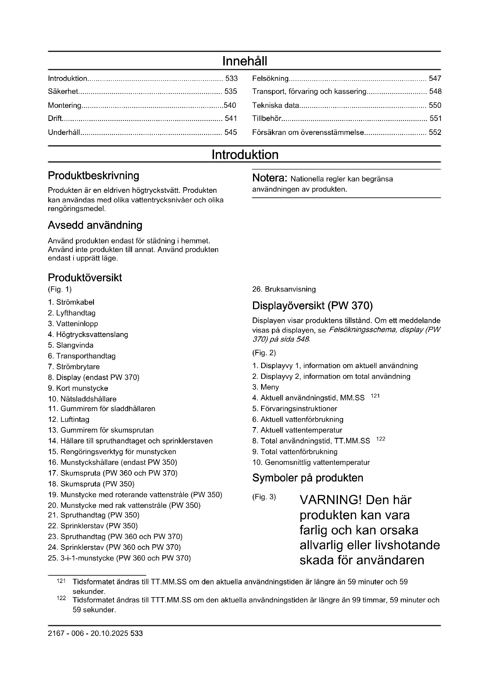 Tidsformatet ändras till TTT.MM.SS om den aktuella användningstiden är längre än 99 timmar, 59 minuter och 59 sekunder. 2167 - 006 - 20.10.2025 533och andra. Var försiktig och använd produkten på rätt sätt. (Fig. 4) Läs noggrant igenom bruksanvisningen och se till att du förstår innehållet innan du använder produkten. (Fig. 5) Produkten är inte lämplig för anslutning till dricksvattenledningarna. (Fig. 6) Vattenstrålar med högt tryck kan vara farliga om de används på fel sätt. Strålen får inte riktas mot personer, elutrustning eller produkten. (Fig. 7) Miljömärkning. Produkten eller dess förpackning är inte hushållsavfall. Återvinn den vid en godkänd plats för kassering av elektrisk och elektronisk utrustning. (Fig. 8) Verktyg i klass II. (Fig. 9) Miljömärkning för bulleremission enligt direktiv och bestämmelser för EU och Storbritannien samt New South Wales-lagstiftningen ”Protection of the Environment Operations (Noise Control) Regulations 2017”. Produktens garanterade ljudeffektnivå anges i Tekniska data på sida