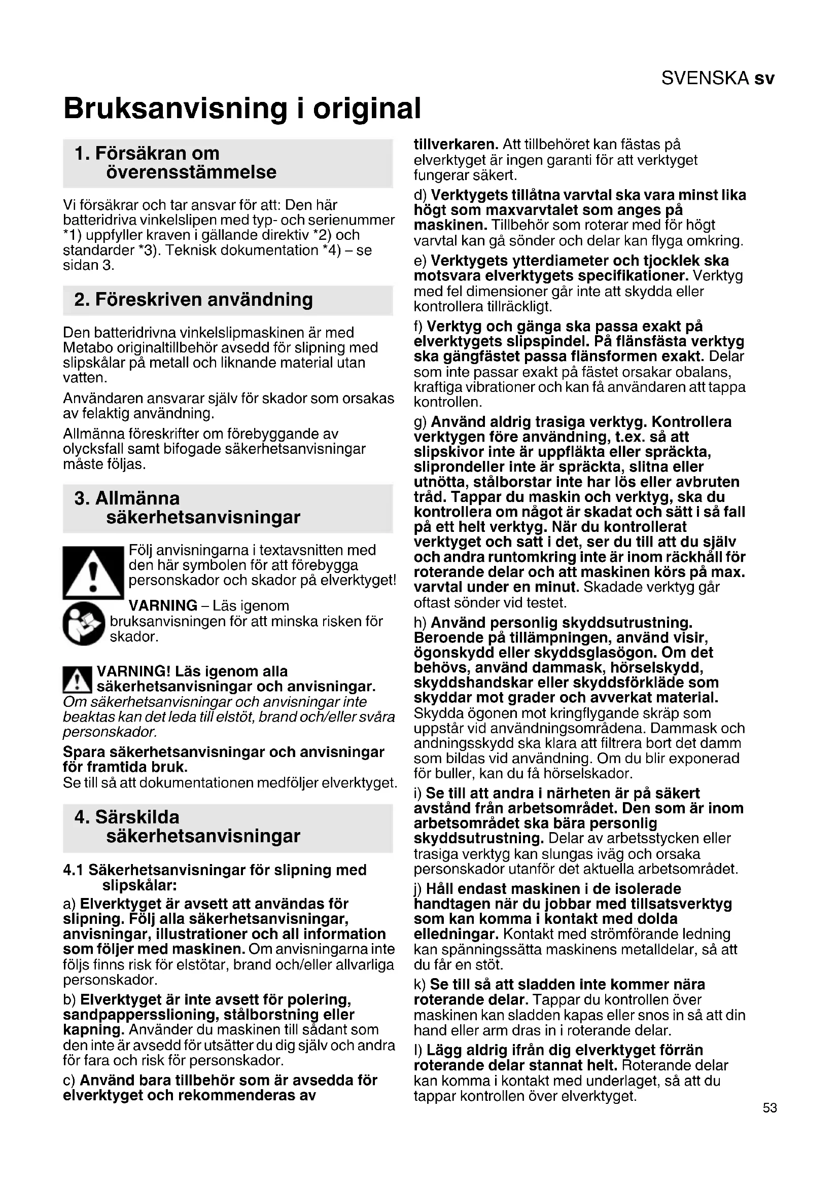 Bruksanvisning i original Vi försäkrar och tar ansvar för att: Den här batteridriva vinkelslipen med typ- och serienummer *1) uppfyller kraven i gällande direktiv *2) och standarder *3). Teknisk dokumentation *4) – se sidan 3. Den batteridrivna vinkelslipmaskinen är med Metabo originaltillbehör avsedd för slipning med slipskålar på metall och liknande material utan vatten. Användaren ansvarar själv för skador som orsakas av felaktig användning. Allmänna föreskrifter om förebyggande av olycksfall samt bifogade säkerhetsanvisningar måste följas. Följ anvisningarna i textavsnitten med den här symbolen för att förebygga personskador och skador på elverktyget! VARNING – Läs igenom bruksanvisningen för att minska risken för skador. VARNING! Läs igenom alla säkerhetsanvisningar och anvisningar. Om säkerhetsanvisningar och anvisningar inte beaktas kan det leda till elstöt, brand och/eller svåra personskador. Spara säkerhetsanvisningar och anvisningar för framtida bruk. Se till så att dokumentationen medföljer elverktyget.
