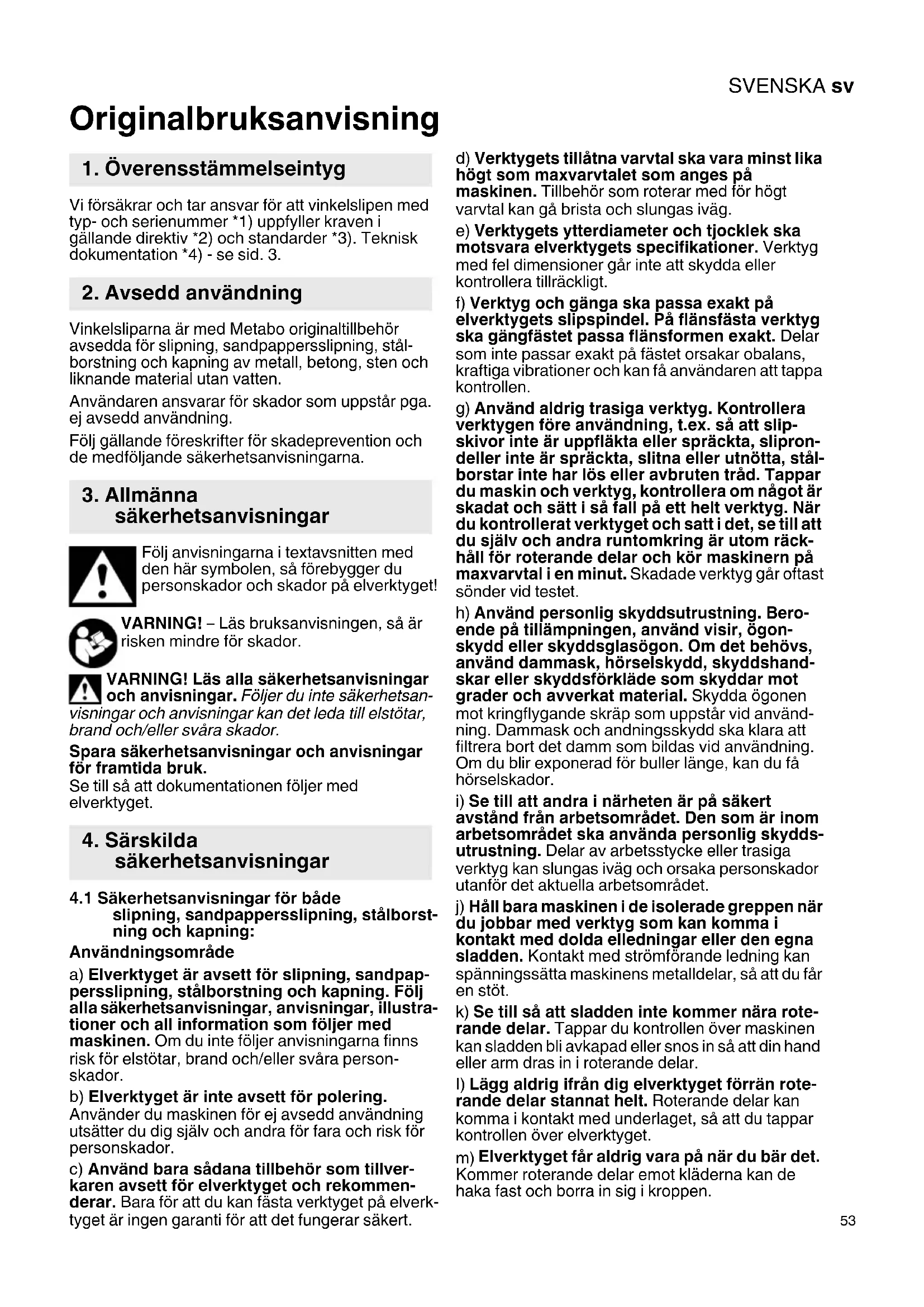 Originalbruksanvisning Vi försäkrar och tar ansvar för att vinkelslipen med typ- och serienummer *1) uppfyller kraven i gällande direktiv *2) och standarder *3). Teknisk dokumentation *4) - se sid. 3. Vinkelsliparna är med Metabo originaltillbehör avsedda för slipning, sandpappersslipning, stål- borstning och kapning av metall, betong, sten och liknande material utan vatten. Användaren ansvarar för skador som uppstår pga. ej avsedd användning. Följ gällande föreskrifter för skadeprevention och de medföljande säkerhetsanvisningarna. Följ anvisningarna i textavsnitten med den här symbolen, så förebygger du personskador och skador på elverktyget! VARNING! – Läs bruksanvisningen, så är risken mindre för skador. VARNING! Läs alla säkerhetsanvisningar och anvisningar. Följer du inte säkerhetsan- visningar och anvisningar kan det leda till elstötar, brand och/eller svåra skador. Spara säkerhetsanvisningar och anvisningar för framtida bruk. Se till så att dokumentationen följer med elverktyget.
