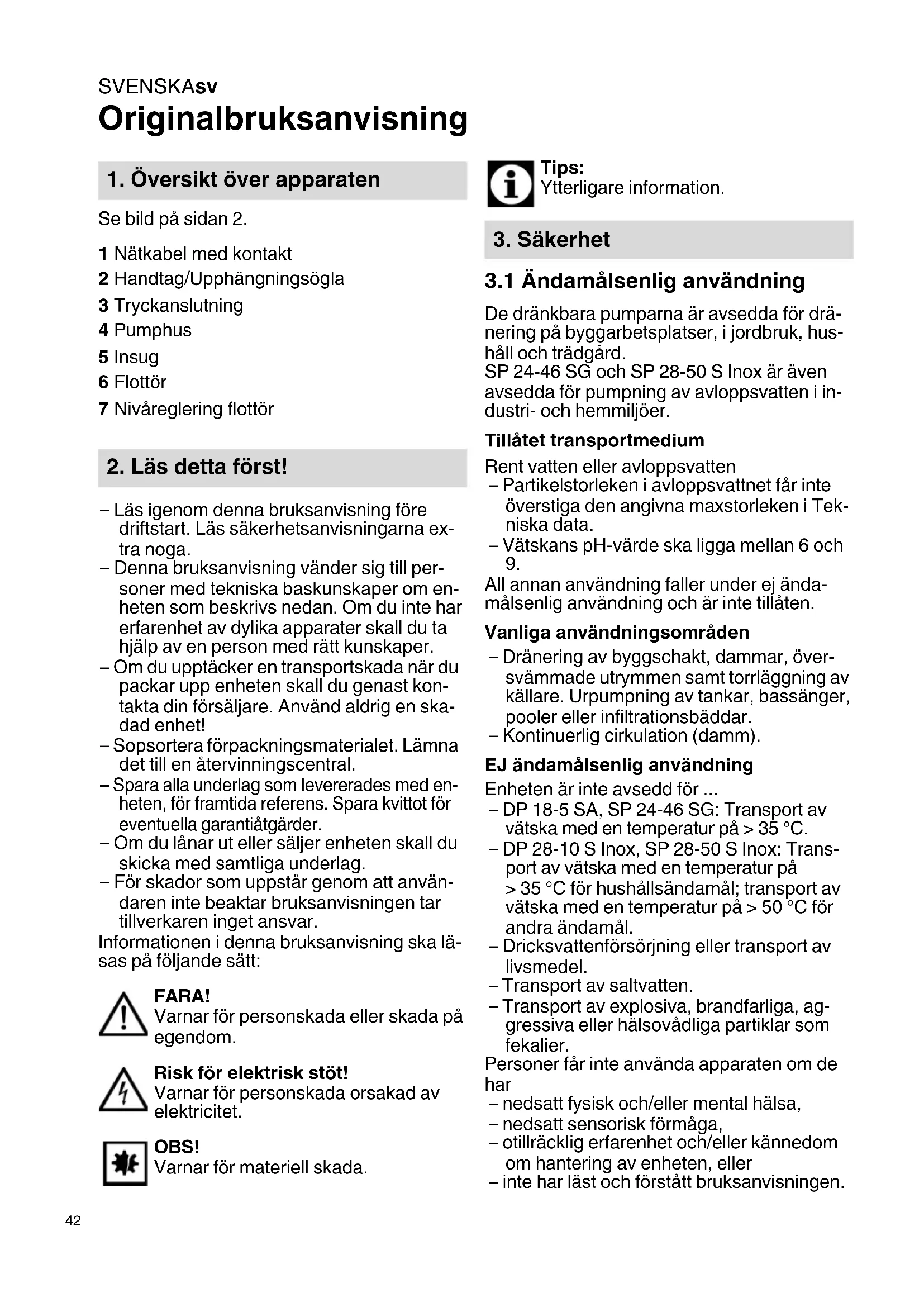 All annan användning faller under ej ända- målsenlig användning och är inte tillåten. Vanliga användningsområden – Dränering av byggschakt, dammar, över- svämmade utrymmen samt torrläggning av källare. Urpumpning av tankar, bassänger, pooler eller infiltrationsbäddar. – Kontinuerlig cirkulation (damm). EJ ändamålsenlig användning Enheten är inte avsedd för ... – DP 18-5 SA, SP 24-46 SG: Transport av vätska med en temperatur på > 35 °C. – DP 28-10 S Inox, SP 28-50 S Inox: Trans- port av vätska med en temperatur på > 35 °C för hushållsändamål; transport av vätska med en temperatur på > 50 °C för andra ändamål. – Dricksvattenförsörjning eller transport av livsmedel. – Transport av saltvatten. – Transport av explosiva, brandfarliga, ag- gressiva eller hälsovådliga partiklar som fekalier. Personer får inte använda apparaten om de har – nedsatt fysisk och/eller mental hälsa, – nedsatt sensorisk förmåga, – otillräcklig erfarenhet och/eller kännedom om hantering av enheten, eller – inte har läst och förstått bruksanvisningen.