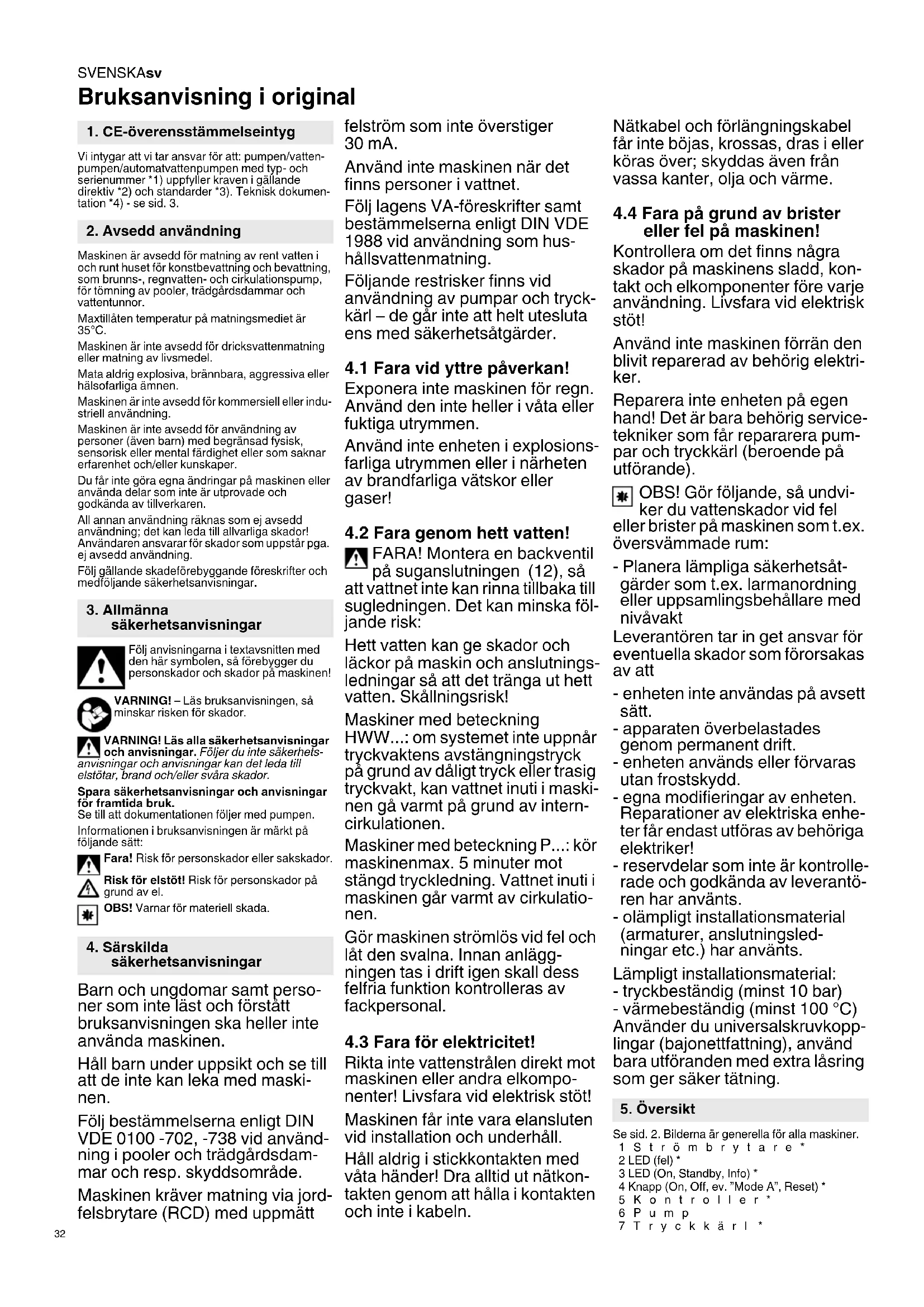 Bruksanvisning i original Vi intygar att vi tar ansvar för att: pumpen/vatten- pumpen/automatvattenpumpen med typ- och serienummer *1) uppfyller kraven i gällande direktiv *2) och standarder *3). Teknisk dokumen- tation *4) - se sid. 3. Maskinen är avsedd för matning av rent vatten i och runt huset för konstbevattning och bevattning, som brunns-, regnvatten- och cirkulationspump, för tömning av pooler, trädgårdsdammar och vattentunnor. Maxtillåten temperatur på matningsmediet är 35°C. Maskinen är inte avsedd för dricksvattenmatning eller matning av livsmedel. Mata aldrig explosiva, brännbara, aggressiva eller hälsofarliga ämnen. Maskinen är inte avsedd för kommersiell eller indu- striell användning. Maskinen är inte avsedd för användning av personer (även barn) med begränsad fysisk, sensorisk eller mental färdighet eller som saknar erfarenhet och/eller kunskaper. Du får inte göra egna ändringar på maskinen eller använda delar som inte är utprovade och godkända av tillverkaren. All annan användning räknas som ej avsedd användning; det kan leda till allvarliga skador! Användaren ansvarar för skador som uppstår pga. ej avsedd användning. Följ gällande skadeförebyggande föreskrifter och medföljande säkerhetsanvisningar. Följ anvisningarna i textavsnitten med den här symbolen, så förebygger du personskador och skador på maskinen! VARNING! – Läs bruksanvisningen, så minskar risken för skador. VARNING! Läs alla säkerhetsanvisningar och anvisningar. Följer du inte säkerhets- anvisningar och anvisningar kan det leda till elstötar, brand och/eller svåra skador. Spara säkerhetsanvisningar och anvisningar för framtida bruk. Se till att dokumentationen följer med pumpen. Informationen i bruksanvisningen är märkt på följande sätt: Fara! Risk för personskador eller sakskador. Risk för elstöt! Risk för personskador på grund av el. OBS! Varnar för materiell skada. Barn och ungdomar samt perso- ner som inte läst och förstått bruksanvisningen ska heller inte använda maskinen. Håll barn under uppsikt och se till att de inte kan leka med maski- nen. Följ bestämmelserna enligt DIN VDE 0100 -702, -738 vid använd- ning i pooler och trädgårdsdam- mar och resp. skyddsområde. Maskinen kräver matning via jord- felsbrytare (RCD) med uppmätt felström som inte överstiger 30 mA. Använd inte maskinen när det finns personer i vattnet. Följ lagens VA-föreskrifter samt bestämmelserna enligt DIN VDE 1988 vid användning som hus- hållsvattenmatning. Följande restrisker finns vid användning av pumpar och tryck- kärl – de går inte att helt utesluta ens med säkerhetsåtgärder.