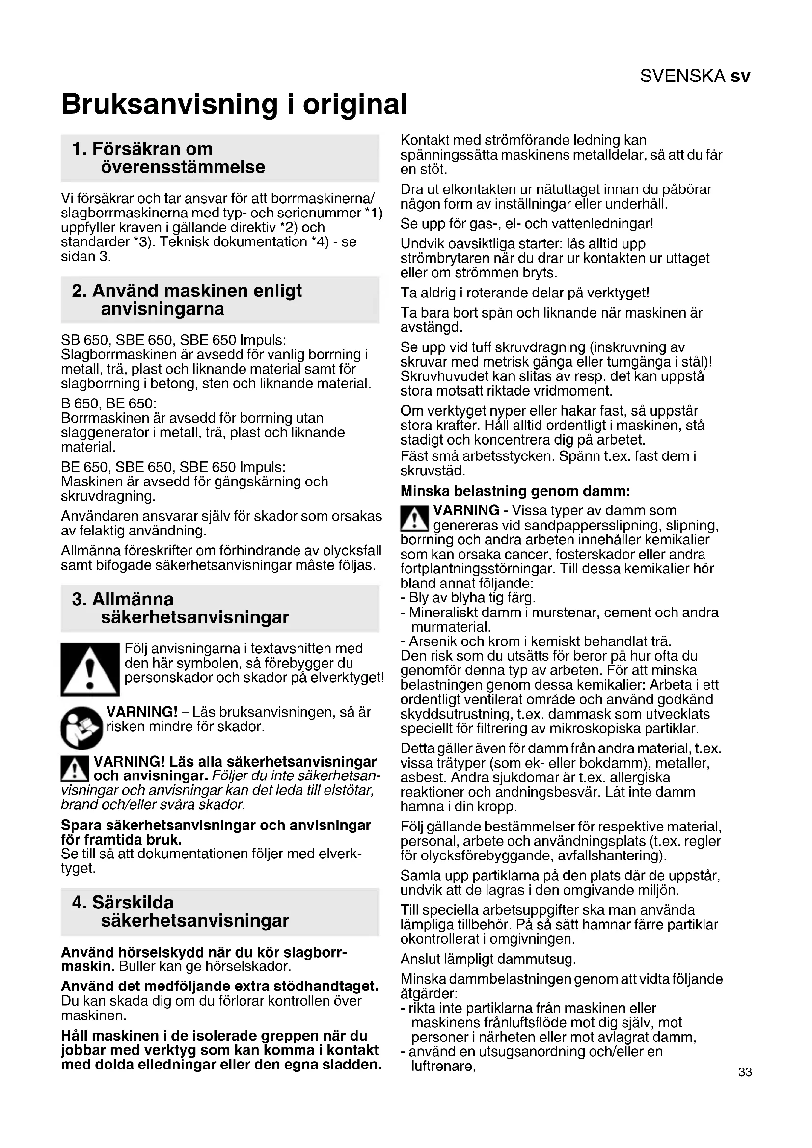 Bruksanvisning i original Vi försäkrar och tar ansvar för att borrmaskinerna/ slagborrmaskinerna med typ- och serienummer *1) uppfyller kraven i gällande direktiv *2) och standarder *3). Teknisk dokumentation *4) - se sidan 3. SB 650, SBE 650, SBE 650 Impuls: Slagborrmaskinen är avsedd för vanlig borrning i metall, trä, plast och liknande material samt för slagborrning i betong, sten och liknande material. B 650, BE 650: Borrmaskinen är avsedd för borrning utan slaggenerator i metall, trä, plast och liknande material. BE 650, SBE 650, SBE 650 Impuls: Maskinen är avsedd för gängskärning och skruvdragning. Användaren ansvarar själv för skador som orsakas av felaktig användning. Allmänna föreskrifter om förhindrande av olycksfall samt bifogade säkerhetsanvisningar måste följas. Följ anvisningarna i textavsnitten med den här symbolen, så förebygger du personskador och skador på elverktyget! VARNING! – Läs bruksanvisningen, så är risken mindre för skador. VARNING! Läs alla säkerhetsanvisningar och anvisningar. Följer du inte säkerhetsan- visningar och anvisningar kan det leda till elstötar, brand och/eller svåra skador. Spara säkerhetsanvisningar och anvisningar för framtida bruk. Se till så att dokumentationen följer med elverk- tyget. Använd hörselskydd när du kör slagborr- maskin. Buller kan ge hörselskador. Använd det medföljande extra stödhandtaget. Du kan skada dig om du förlorar kontrollen över maskinen. Håll maskinen i de isolerade greppen när du jobbar med verktyg som kan komma i kontakt med dolda elledningar eller den egna sladden. Kontakt med strömförande ledning kan spänningssätta maskinens metalldelar, så att du får en stöt. Dra ut elkontakten ur nätuttaget innan du påbörar någon form av inställningar eller underhåll. Se upp för gas-, el- och vattenledningar! Undvik oavsiktliga starter: lås alltid upp strömbrytaren när du drar ur kontakten ur uttaget eller om strömmen bryts. Ta aldrig i roterande delar på verktyget! Ta bara bort spån och liknande när maskinen är avstängd. Se upp vid tuff skruvdragning (inskruvning av skruvar med metrisk gänga eller tumgänga i stål)! Skruvhuvudet kan slitas av resp. det kan uppstå stora motsatt riktade vridmoment. Om verktyget nyper eller hakar fast, så uppstår stora krafter. Håll alltid ordentligt i maskinen, stå stadigt och koncentrera dig på arbetet. Fäst små arbetsstycken. Spänn t.ex. fast dem i skruvstäd. Minska belastning genom damm: VARNING - Vissa typer av damm som genereras vid sandpappersslipning, slipning, borrning och andra arbeten innehåller kemikalier som kan orsaka cancer, fosterskador eller andra fortplantningsstörningar. Till dessa kemikalier hör bland annat följande: - Bly av blyhaltig färg. - Mineraliskt damm i murstenar, cement och andra murmaterial. - Arsenik och krom i kemiskt behandlat trä. Den risk som du utsätts för beror på hur ofta du genomför denna typ av arbeten. För att minska belastningen genom dessa kemikalier: Arbeta i ett ordentligt ventilerat område och använd godkänd skyddsutrustning, t.ex. dammask som utvecklats speciellt för filtrering av mikroskopiska partiklar. Detta gäller även för damm från andra material, t.ex. vissa trätyper (som ek- eller bokdamm), metaller, asbest. Andra sjukdomar är t.ex. allergiska reaktioner och andningsbesvär. Låt inte damm hamna i din kropp. Följ gällande bestämmelser för respektive material, personal, arbete och användningsplats (t.ex. regler för olycksförebyggande, avfallshantering). Samla upp partiklarna på den plats där de uppstår, undvik att de lagras i den omgivande miljön. Till speciella arbetsuppgifter ska man använda lämpliga tillbehör. På så sätt hamnar färre partiklar okontrollerat i omgivningen. Anslut lämpligt dammutsug. Minska dammbelastningen genom att vidta följande åtgärder: - rikta inte partiklarna från maskinen eller maskinens frånluftsflöde mot dig själv, mot personer i närheten eller mot avlagrat damm, - använd en utsugsanordning och/eller en luftrenare,