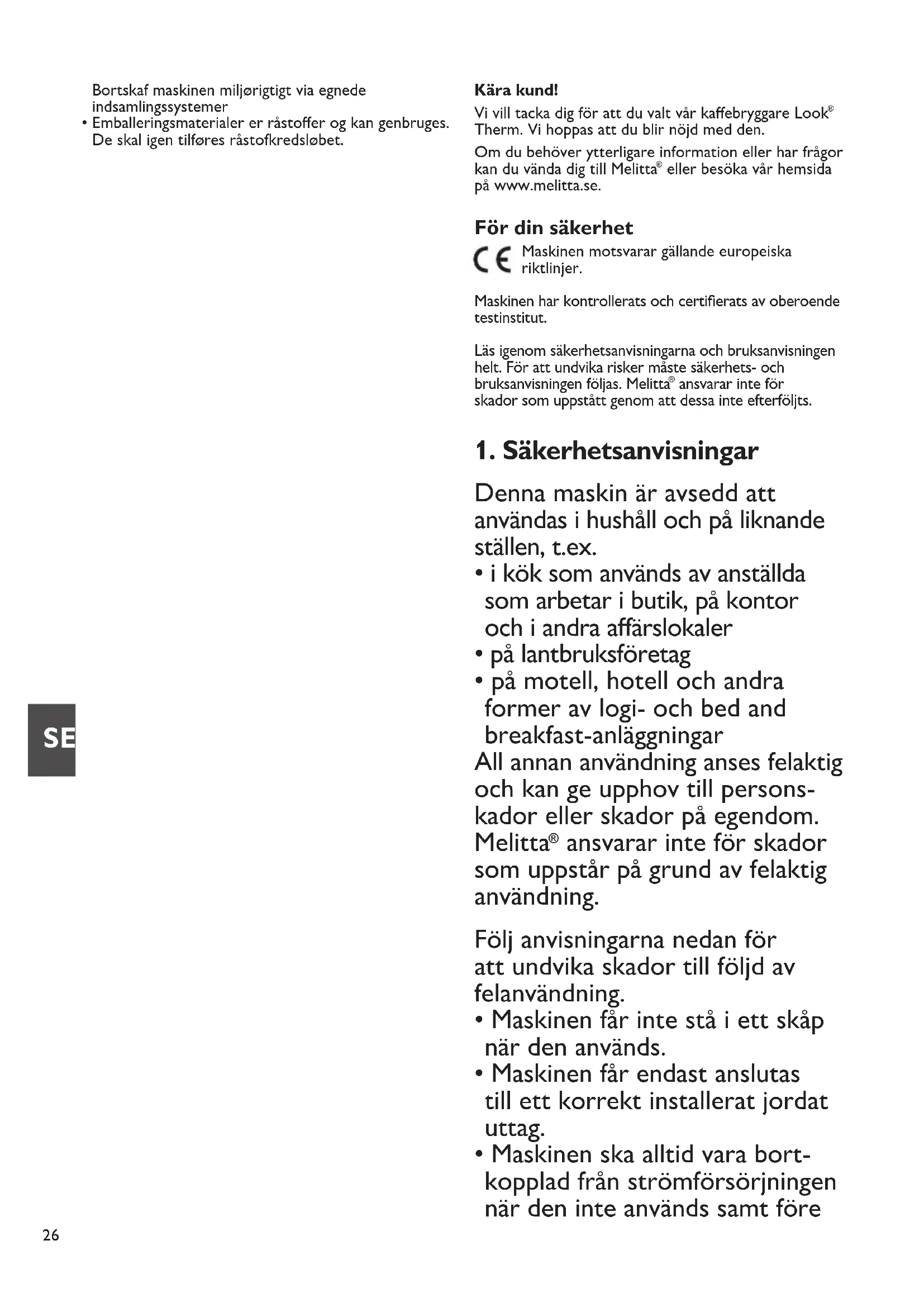Maskinen motsvarar gällande europeiska riktlinjer. Maskinen har kontrollerats och certifierats av oberoende testinstitut. Läs igenom säkerhetsanvisningarna och bruksanvisningen helt. För att undvika risker måste säkerhets- och bruksanvisningen följas. Melitta