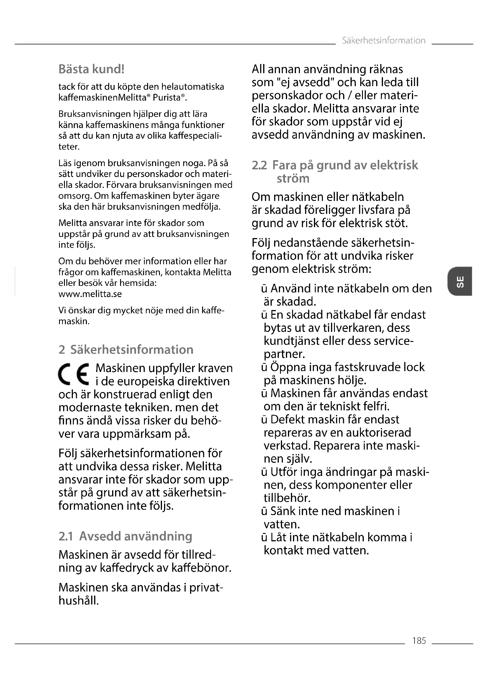 Bästa kund! tack för att du köpte den helautomatiska kaemaskinen Melitta® Purista®. Bruksanvisningen hjälper dig att lära känna kaemaskinens många funktioner så att du kan njuta av olika kaespeciali- teter. Läs igenom bruksanvisningen noga. På så sätt undviker du personskador och materi- ella skador. Förvara bruksanvisningen med omsorg. Om kaemaskinen byter ägare ska den här bruksanvisningen medfölja. Melitta ansvarar inte för skador som uppstår på grund av att bruksanvisningen inte följs. Om du behöver mer information eller har frågor om kaemaskinen, kontakta Melitta eller besök vår hemsida: www.melitta.se Vi önskar dig mycket nöje med din kae- maskin. 2 Säkerhetsinformation Maskinen uppfyller kraven i de europeiska direktiven och är konstruerad enligt den modernaste tekniken. men det nns ändå vissa risker du behö- ver vara uppmärksam på. Följ säkerhetsinformationen för att undvika dessa risker. Melitta ansvarar inte för skador som upp- står på grund av att säkerhetsin- formationen inte följs.