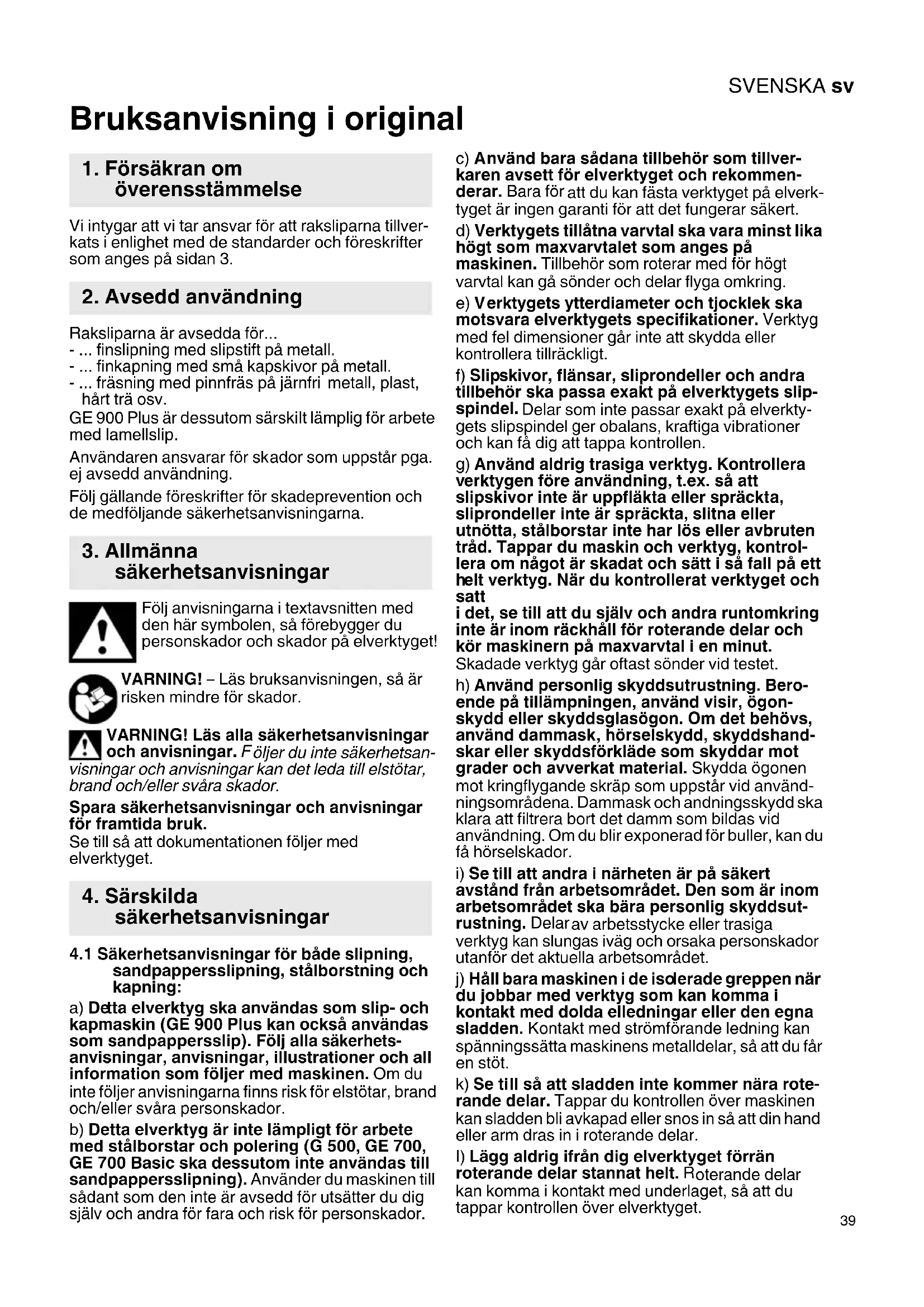 sandpappersslipning, stålborstning och kapning: a) De tta elverktyg ska användas som slip- och kapmaskin (GE 900 Plus kan också användas som sandpappersslip). Följ alla säkerhets- anvisningar, anvisningar, illustrationer och all information som följer med maskinen. Om du inte följer anvisningarna finns risk för elstötar, brand och/eller svåra personskador. b) D etta elverktyg är inte lämpligt för arbete med stålborstar och polering (G 500, GE 700, GE 700 Basic ska dessutom inte användas till sandpappersslipning). Använder du maskinen till sådant som den inte är avsedd för utsätter du dig själv och andra för fara och risk för personskador. c) A nvänd bara sådana tillbehör som tillver- karen avsett för elverktyget och rekommen- derar. Bara för att du kan fästa verktyget på elverk- tyget är ingen garanti för att det fungerar säkert. d) Verktygets tillåtna varvtal ska vara minst lika högt so m maxvarvtalet som anges på maskinen. Tillbehör som roterar med för högt varvtal kan gå sönder och delar flyga omkring. e) V erktygets ytterdiameter och tjocklek ska motsvara elverktygets specifikationer. Verktyg med fel dimensioner går inte att skydda eller kontrollera tillräckligt. f) Slip skivor, flänsar, sliprondeller och andra tillbehör ska passa exakt på elverktygets slip- spindel. Delar som inte passar exakt på elverkty- gets slipspindel ger obalans, kraftiga vibrationer och kan få dig att tappa kontrollen. g) Använd aldrig trasiga verktyg. Kontrollera