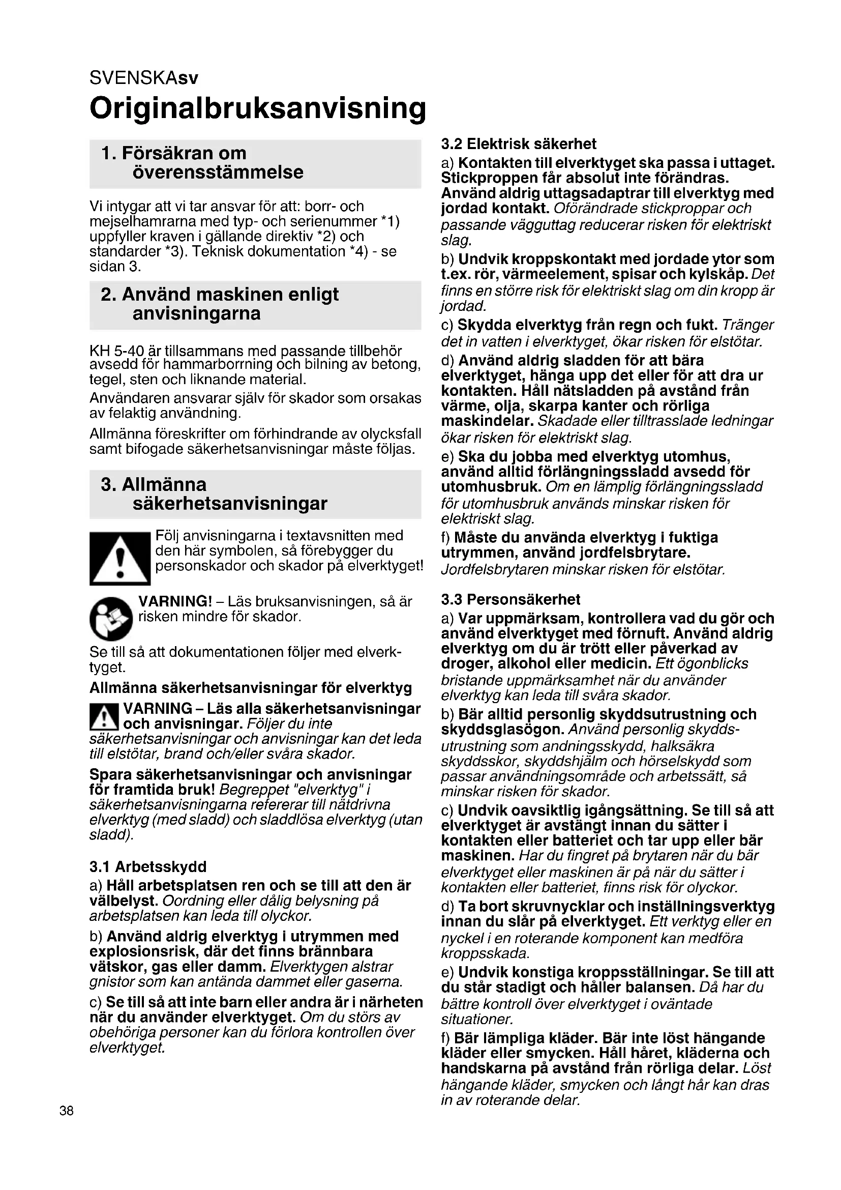 Originalbruksanvisning Vi intygar att vi tar ansvar för att: borr- och mejselhamrarna med typ- och serienummer *1) uppfyller kraven i gällande direktiv *2) och standarder *3). Teknisk dokumentation *4) - se sidan 3. KH 5-40 är tillsammans med passande tillbehör avsedd för hammarborrning och bilning av betong, tegel, sten och liknande material. Användaren ansvarar själv för skador som orsakas av felaktig användning. Allmänna föreskrifter om förhindrande av olycksfall samt bifogade säkerhetsanvisningar måste följas. Följ anvisningarna i textavsnitten med den här symbolen, så förebygger du personskador och skador på elverktyget! VARNING! – Läs bruksanvisningen, så är risken mindre för skador. Se till så att dokumentationen följer med elverk- tyget. Allmänna säkerhetsanvisningar för elverktyg VARNING – Läs alla säkerhetsanvisningar och anvisningar. Följer du inte säkerhetsanvisningar och anvisningar kan det leda till elstötar, brand och/eller svåra skador. Spara säkerhetsanvisningar och anvisningar för framtida bruk! Begreppet "elverktyg" i säkerhetsanvisningarna refererar till nätdrivna elverktyg (med sladd) och sladdlösa elverktyg (utan sladd).