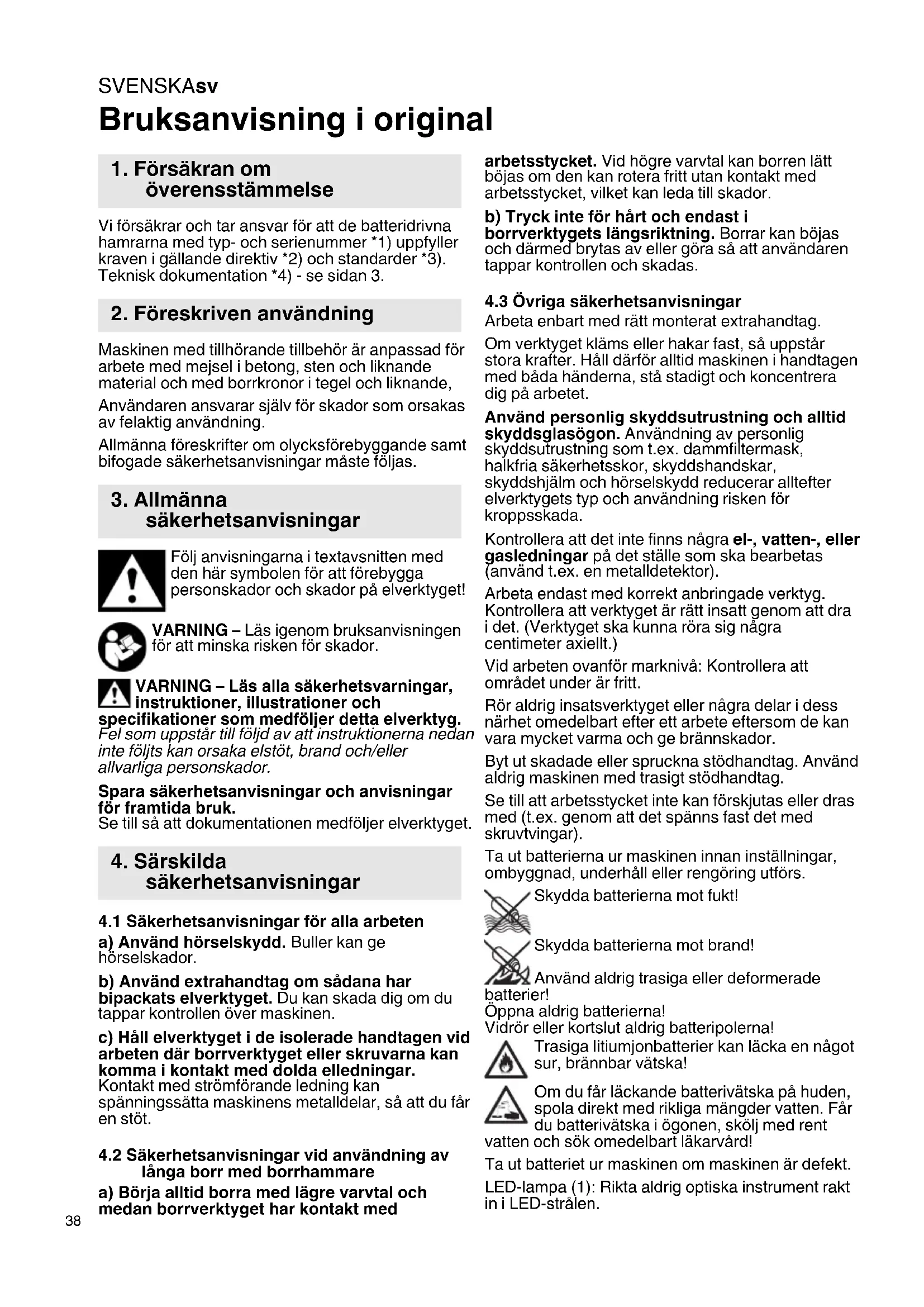Bruksanvisning i original Vi försäkrar och tar ansvar för att de batteridrivna hamrarna med typ- och serienummer *1) uppfyller kraven i gällande direktiv *2) och standarder *3). Teknisk dokumentation *4) - se sidan 3. Maskinen med tillhörande tillbehör är anpassad för arbete med mejsel i betong, sten och liknande material och med borrkronor i tegel och liknande, Användaren ansvarar själv för skador som orsakas av felaktig användning. Allmänna föreskrifter om olycksförebyggande samt bifogade säkerhetsanvisningar måste följas. Följ anvisningarna i textavsnitten med den här symbolen för att förebygga personskador och skador på elverktyget! VARNING – Läs igenom bruksanvisningen för att minska risken för skador. VARNING – Läs alla säkerhetsvarningar, instruktioner, illustrationer och specifikationer som medföljer detta elverktyg. Fel som uppstår till följd av att instruktionerna nedan inte följts kan orsaka elstöt, brand och/eller allvarliga personskador. Spara säkerhetsanvisningar och anvisningar för framtida bruk. Se till så att dokumentationen medföljer elverktyget.