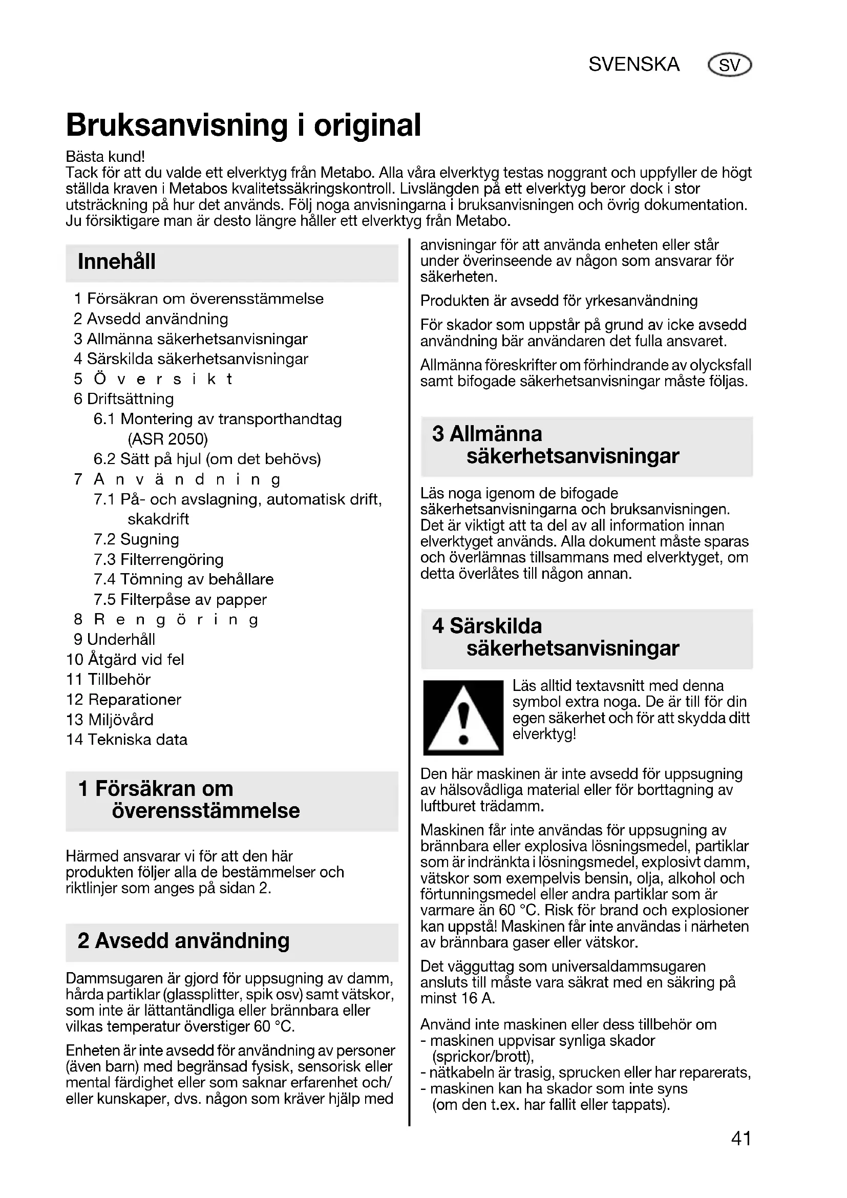 8Rengöring 9 Underhåll 10 Åtgärd vid fel 11 Tillbehör 12 Reparationer 13 Miljövård 14 Tekniska data Härmed ansvarar vi för att den här produkten följer alla de bestämmelser och riktlinjer som anges på sidan 2. Dammsugaren är gjord för uppsugning av damm, hårda partiklar (glassplitter, spik osv) samt vätskor, som inte är lättantändliga eller brännbara eller vilkas temperatur överstiger 60 °C. Enheten är inte avsedd för användning av personer (även barn) med begränsad fysisk, sensorisk eller mental färdighet eller som saknar erfarenhet och/ eller kunskaper, dvs. någon som kräver hjälp med anvisningar för att använda enheten eller står under överinseende av någon som ansvarar för säkerheten. Produkten är avsedd för yrkesanvändning För skador som uppstår på grund av icke avsedd användning bär användaren det fulla ansvaret. Allmänna föreskrifter om förhindrande av olycksfall samt bifogade säkerhetsanvisningar måste följas. Läs noga igenom de bifogade säkerhetsanvisningarna och bruksanvisningen. Det är viktigt att ta del av all information innan elverktyget används. Alla dokument måste sparas och överlämnas tillsammans med elverktyget, om detta överlåtes till någon annan. Läs alltid textavsnitt med denna symbol extra noga. De är till för din egen säkerhet och för att skydda ditt elverktyg! Den här maskinen är inte avsedd för uppsugning av hälsovådliga material eller för borttagning av luftburet trädamm. Maskinen får inte användas för uppsugning av brännbara eller explosiva lösningsmedel, partiklar som är indränkta i lösningsmedel, explosivt damm, vätskor som exempelvis bensin, olja, alkohol och förtunningsmedel eller andra partiklar som är varmare än 60 °C. Risk för brand och explosioner kan uppstå! Maskinen får inte användas i närheten av brännbara gaser eller vätskor. Det vägguttag som universaldammsugaren ansluts till måste vara säkrat med en säkring på minst 16 A. Använd inte maskinen eller dess tillbehör om - maskinen uppvisar synliga skador (sprickor/brott), - nätkabeln är trasig, sprucken eller har reparerats, - maskinen kan ha skador som inte syns (om den t.ex. har fallit eller tappats). Bruksanvisning i original Bästa kund! Tack för att du valde ett elverktyg från Metabo. Alla våra elverktyg testas noggrant och uppfyller de högt ställda kraven i Metabos kvalitetssäkringskontroll. Livslängden på ett elverktyg beror dock i stor utsträckning på hur det används. Följ noga anvisningarna i bruksanvisningen och övrig dokumentation. Ju försiktigare man är desto längre håller ett elverktyg från Metabo. Innehåll 1 Försäkran om överensstämmelse 2 Avsedd användning 3 Allmänna säkerhetsanvisningar 4 Särskilda säkerhetsanvisningar 17026696_0810 ASR 2025 und ASR 2050.book Seite 41 Mittwoch, 18. August 2010 5:10 1742 SVENSKA