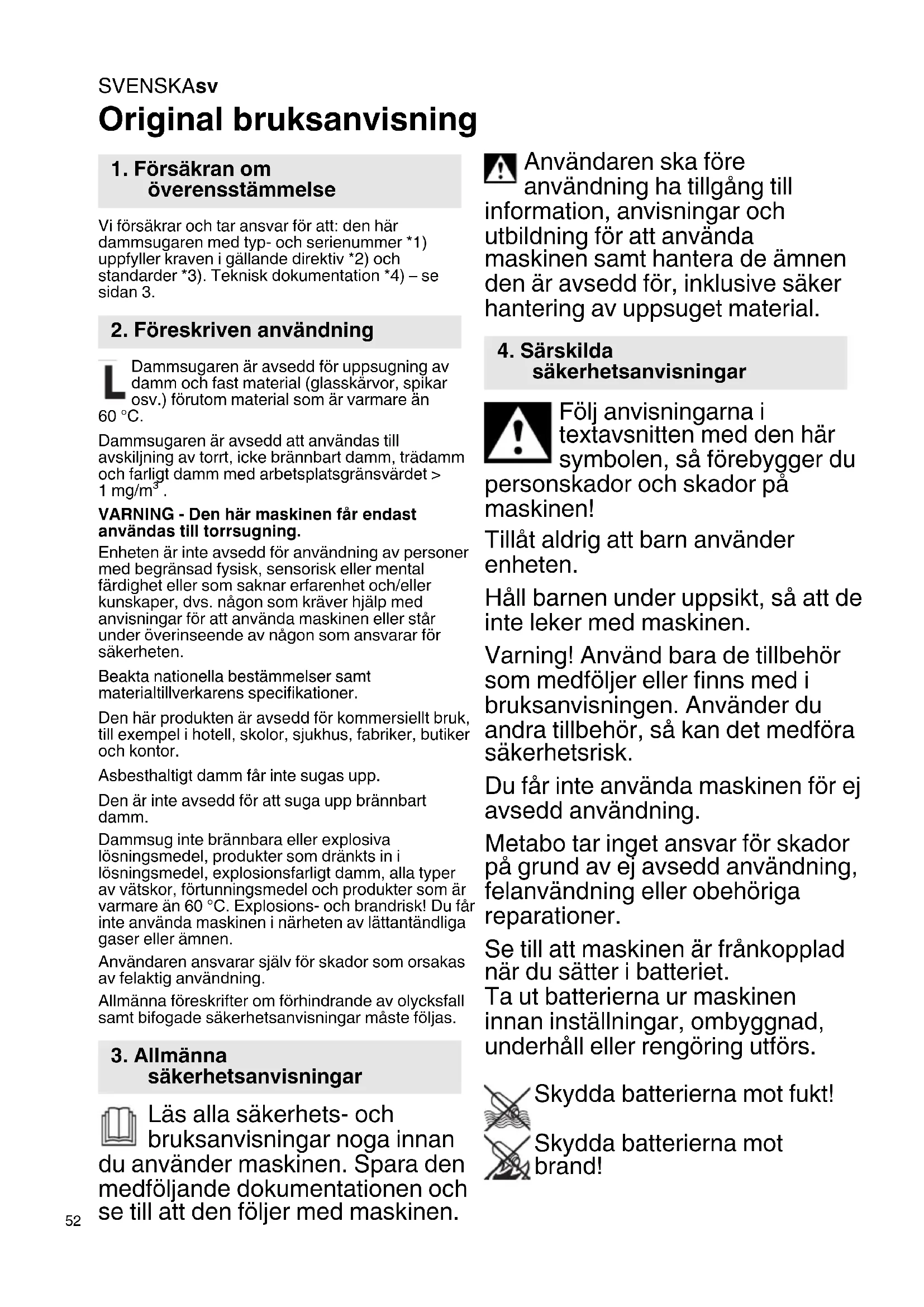 Original bruksanvisning Vi försäkrar och tar ansvar för att: den här dammsugaren med typ- och serienummer *1) uppfyller kraven i gällande direktiv *2) och standarder *3). Teknisk dokumentation *4) – se sidan 3. Dammsugaren är avsedd för uppsugning av damm och fast material (glasskärvor, spikar osv.) förutom material som är varmare än 60 °C. Dammsugaren är avsedd att användas till avskiljning av torrt, icke brännbart damm, trädamm och farligt damm med arbetsplatsgränsvärdet > 1 mg/m³ . VARNING - Den här maskinen får endast användas till torrsugning. Enheten är inte avsedd för användning av personer med begränsad fysisk, sensorisk eller mental färdighet eller som saknar erfarenhet och/eller kunskaper, dvs. någon som kräver hjälp med anvisningar för att använda maskinen eller står under överinseende av någon som ansvarar för säkerheten. Beakta nationella bestämmelser samt materialtillverkarens specifikationer. Den här produkten är avsedd för kommersiellt bruk, till exempel i hotell, skolor, sjukhus, fabriker, butiker och kontor. Asbesthaltigt damm får inte sugas upp. Den är inte avsedd för att suga upp brännbart damm. Dammsug inte brännbara eller explosiva lösningsmedel, produkter som dränkts in i lösningsmedel, explosionsfarligt damm, alla typer av vätskor, förtunningsmedel och produkter som är varmare än 60 °C. Explosions- och brandrisk! Du får inte använda maskinen i närheten av lättantändliga gaser eller ämnen. Användaren ansvarar själv för skador som orsakas av felaktig användning. Allmänna föreskrifter om förhindrande av olycksfall samt bifogade säkerhetsanvisningar måste följas. Läs alla säkerhets- och bruksanvisningar noga innan du använder maskinen. Spara den medföljande dokumentationen och se till att den följer med maskinen. Användaren ska före användning ha tillgång till information, anvisningar och utbildning för att använda maskinen samt hantera de ämnen den är avsedd för, inklusive säker hantering av uppsuget material. Följ anvisningarna i textavsnitten med den här symbolen, så förebygger du personskador och skador på maskinen! Tillåt aldrig att barn använder enheten. Håll barnen under uppsikt, så att de inte leker med maskinen. Varning! Använd bara de tillbehör som medföljer eller finns med i bruksanvisningen. Använder du andra tillbehör, så kan det medföra säkerhetsrisk. Du får inte använda maskinen för ej avsedd användning. Metabo tar inget ansvar för skador på grund av ej avsedd användning, felanvändning eller obehöriga reparationer. Se till att maskinen är frånkopplad när du sätter i batteriet. Ta ut batterierna ur maskinen innan inställningar, ombyggnad, underhåll eller rengöring utförs. Skydda batterierna mot fukt! Skydda batterierna mot brand!
