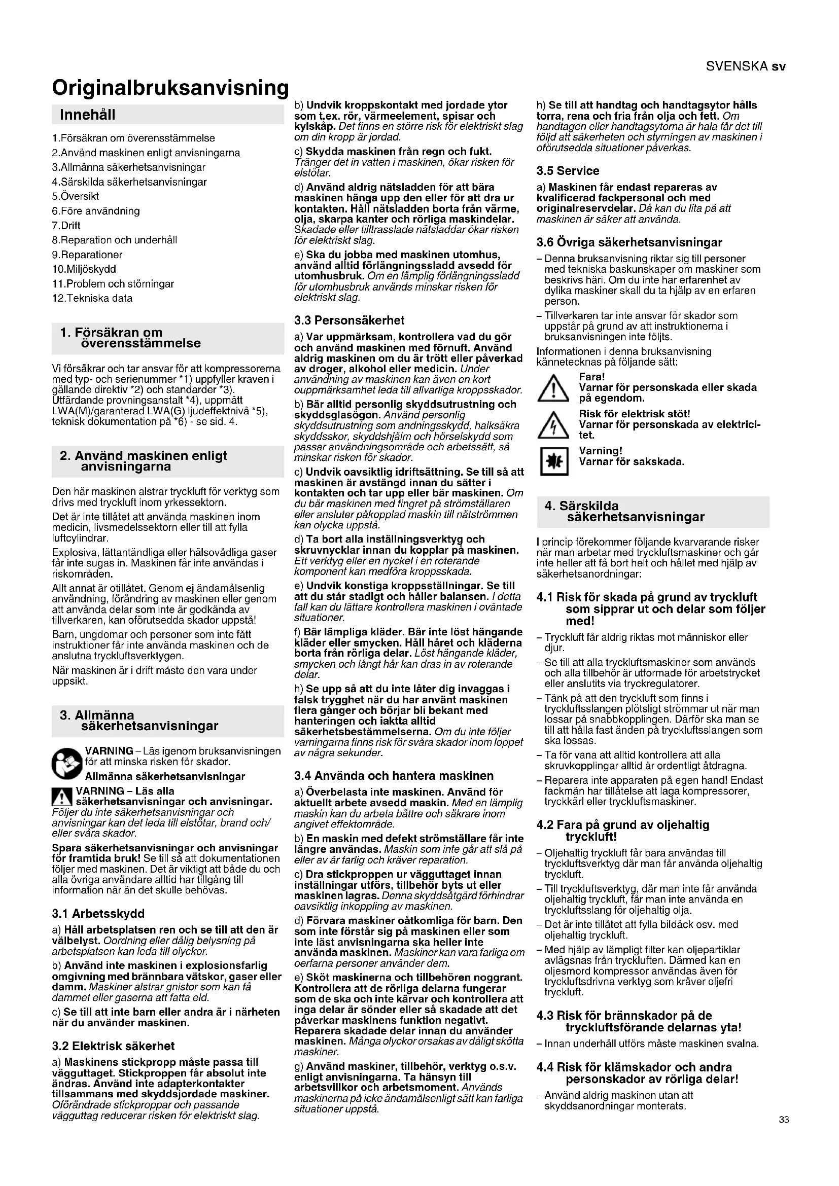 Originalbruksanvisning 1.Försäkran om överensstämmelse 2.Använd maskinen enligt anvisningarna 3.Allmänna säkerhetsanvisningar 4.Särskilda säkerhetsanvisningar 5.Översikt 6.Före användning 7.Drift 8.Reparation och underhåll 9.Reparationer 10.Miljöskydd 11.Problem och störningar 12.Tekniska data Vi försäkrar och tar ansvar för att kompressorerna med typ- och serienummer *1) uppfyller kraven i gällande direktiv *2) och standarder *3). Utfärdande provningsanstalt *4), uppmätt LWA(M)/garanterad LWA(G) ljudeffektnivå *5), teknisk dokumentation på *6) - se sid. 4. Den här maskinen alstrar tryckluft för verktyg som drivs med tryckluft inom yrkessektorn. Det är inte tillåtet att använda maskinen inom medicin, livsmedelssektorn eller till att fylla luftcylindrar. Explosiva, lättantändliga eller hälsovådliga gaser får inte sugas in. Maskinen får inte användas i riskområden. Allt annat är otillåtet. Genom ej ändamålsenlig användning, förändring av maskinen eller genom att använda delar som inte är godkända av tillverkaren, kan oförutsedda skador uppstå! Barn, ungdomar och personer som inte fått instruktioner får inte använda maskinen och de anslutna tryckluftsverktygen. När maskinen är i drift måste den vara under uppsikt. VARNING – Läs igenom bruksanvisningen för att minska risken för skador. Allmänna säkerhetsanvisningar VARNING – Läs alla säkerhetsanvisningar och anvisningar. Följer du inte säkerhetsanvisningar och anvisningar kan det leda till elstötar, brand och/ eller svåra skador. Spara säkerhetsanvisningar och anvisningar för framtida bruk! Se till så att dokumentationen följer med maskinen. Det är viktigt att både du och alla övriga användare alltid har tillgång till information när än det skulle behövas.