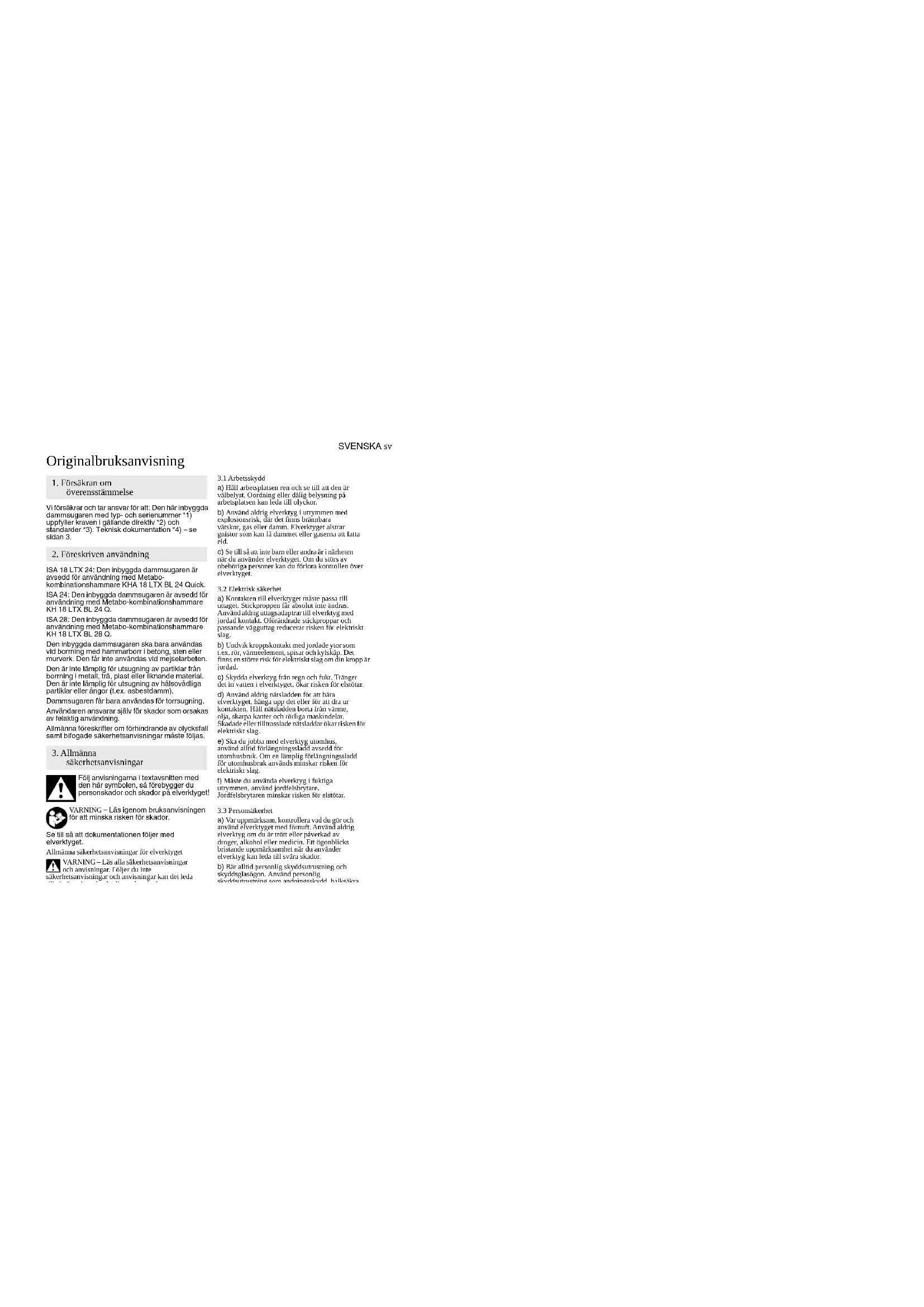 Originalbruksanvisning Vi försäkrar och tar ansvar för att: Den här inbyggda dammsugaren med typ- och serienummer *1) uppfyller kraven i gällande direktiv *2) och standarder *3). Teknisk dokumentation *4) – se sidan 3. ISA 18 LTX 24: Den inbyggda dammsugaren är avsedd för användning med Metabo- kombinationshammare KHA 18 LTX BL 24 Quick. ISA 24: Den inbyggda dammsugaren är avsedd för användning med Metabo-kombinationshammare KH 18 LTX BL 24 Q. ISA 28: Den inbyggda dammsugaren är avsedd för användning med Metabo-kombinationshammare KH 18 LTX BL 28 Q. Den inbyggda dammsugaren ska bara användas vid borrning med hammarborr i betong, sten eller murverk. Den får inte användas vid mejselarbeten. Den är inte lämplig för utsugning av partiklar från borrning i metall, trä, plast eller liknande material. Den är inte lämplig för utsugning av hälsovådliga partiklar eller ångor (t.ex. asbestdamm). Dammsugaren får bara användas för torrsugning. Användaren ansvarar själv för skador som orsakas av felaktig användning. Allmänna föreskrifter om förhindrande av olycksfall samt bifogade säkerhetsanvisningar måste följas. Följ anvisningarna i textavsnitten med den här symbolen, så förebygger du personskador och skador på elverktyget! VARNING – Läs igenom bruksanvisningen för att minska risken för skador. Se till så att dokumentationen följer med elverktyget. Allmänna säkerhetsanvisningar för elverktyget VARNING – Läs alla säkerhetsanvisningar och anvisningar. Följer du inte säkerhetsanvisningar och anvisningar kan det leda till elstötar, brand och/eller svåra skador. Spara säkerhetsanvisningar och anvisningar för framtida bruk! Begreppet ”elverktyg” i säkerhetsanvisningarna syftar på nätdrivna elverktyg (med nätkabel) eller batteridrivna elverktyg (utan nätkabel).