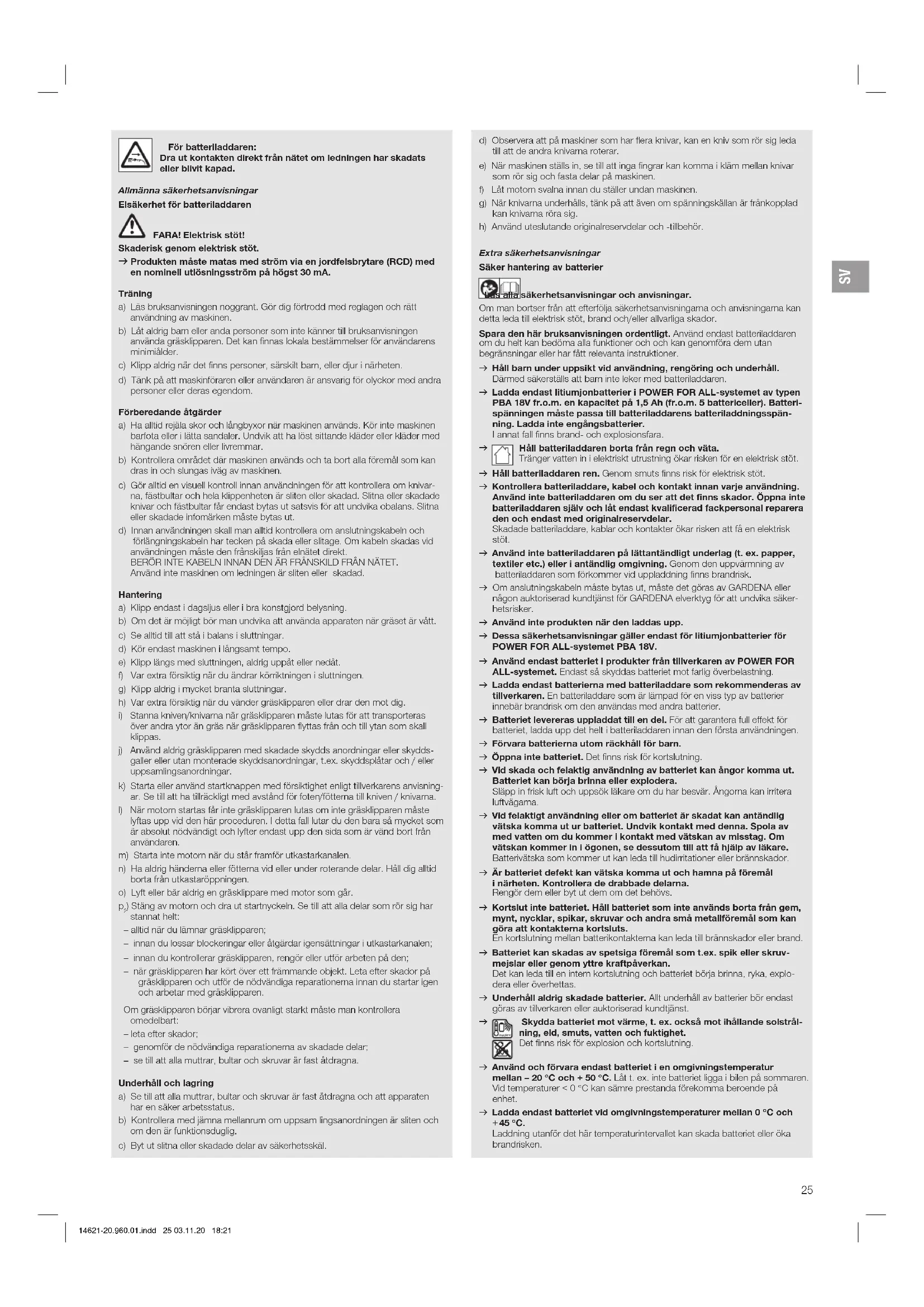 ) Stäng av motorn och dra ut startnyckeln. Se till att alla delar som rör sig har stannat helt: – alltid när du lämnar gräsklipparen; – innan du lossar blockeringar eller åtgärdar igensättningar i utkastarkanalen; – innan du kontrollerar gräsklipparen, rengör eller utför arbeten på den; – när gräsklipparen har kört över ett främmande objekt. Leta efter skador på gräsklipparen och utför de nödvändiga reparationerna innan du startar igen och arbetar med gräsklipparen. Om gräsklipparen börjar vibrera ovanligt starkt måste man kontrollera omedelbart: – leta efter skador; – genomför de nödvändiga reparationerna av skadade delar; – se till att alla muttrar, bultar och skruvar är fast åtdragna. Underhåll och lagring a) Se till att alla muttrar, bultar och skruvar är fast åtdragna och att apparaten har en säker arbetsstatus. b) Kontrollera med jämna mellanrum om uppsam lingsanordningen är sliten och om den är funktionsduglig. c) Byt ut slitna eller skadade delar av säkerhetsskäl. d) Observera att på maskiner som har flera knivar, kan en kniv som rör sig leda till att de andra knivarna roterar. e) När maskinen ställs in, se till att inga fingrar kan komma i kläm mellan knivar som rör sig och fasta delar på maskinen. f) Låt motorn svalna innan du ställer undan maskinen. g) När knivarna underhålls, tänk på att även om spänningskällan är frånkopplad kan knivarna röra sig. h) Använd uteslutande originalreservdelar och -tillbehör. Extra säkerhetsanvisningar Säker hantering av batterier Läs alla säkerhetsanvisningar och anvisningar. Om man bortser från att efterfölja säkerhetsanvisningarna och anvisningarna kan detta leda till elektrisk stöt, brand och/eller allvarliga skador. Spara den här bruksanvisningen ordentligt. Använd endast batteriladdaren om du helt kan bedöma alla funktioner och och kan genomföra dem utan begränsningar eller har fått relevanta instruktioner. v Håll barn under uppsikt vid användning, rengöring och underhåll. Därmed säkerställs att barn inte leker med batteriladdaren. v Ladda endast litiumjonbatterier i POWER FOR ALL-systemet av typen PBA 18V fr.o.m. en kapacitet på 1,5 Ah (fr.o.m. 5 battericeller). Batteri- spänningen måste passa till batteriladdarens batteriladdningsspän- ning. Ladda inte engångsbatterier. I annat fall finns brand- och explosionsfara.