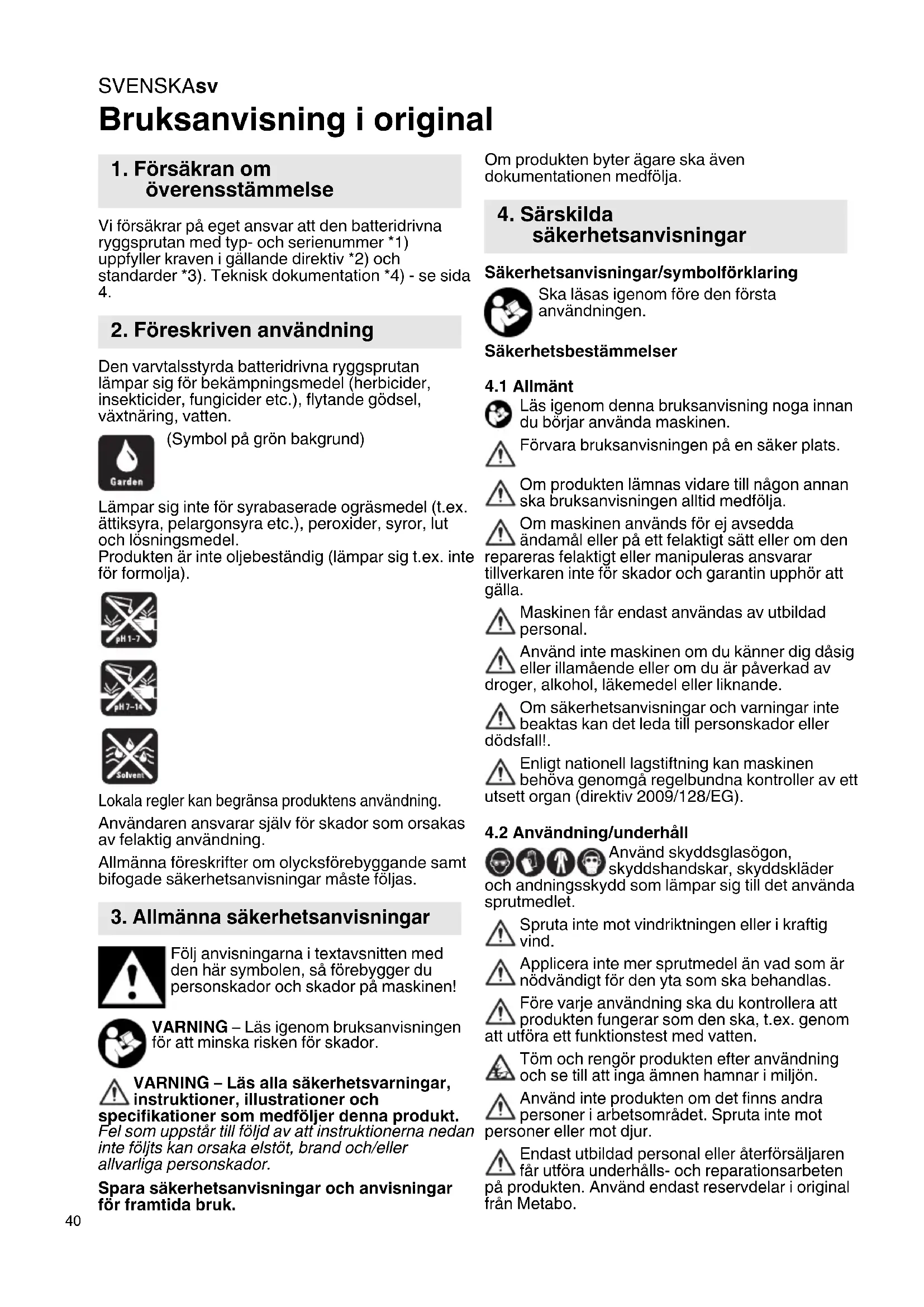 Använd skyddsglasögon, skyddshandskar, skyddskläder och andningsskydd som lämpar sig till det använda sprutmedlet. Spruta inte mot vindriktningen eller i kraftig vind. Applicera inte mer sprutmedel än vad som är nödvändigt för den yta som ska behandlas. Före varje användning ska du kontrollera att produkten fungerar som den ska, t.ex. genom att utföra ett funktionstest med vatten. Töm och rengör produkten efter användning och se till att inga ämnen hamnar i miljön. Använd inte produkten om det finns andra personer i arbetsområdet. Spruta inte mot personer eller mot djur. Endast utbildad personal eller återförsäljaren får utföra underhålls- och reparationsarbeten på produkten. Använd endast reservdelar i original från Metabo.