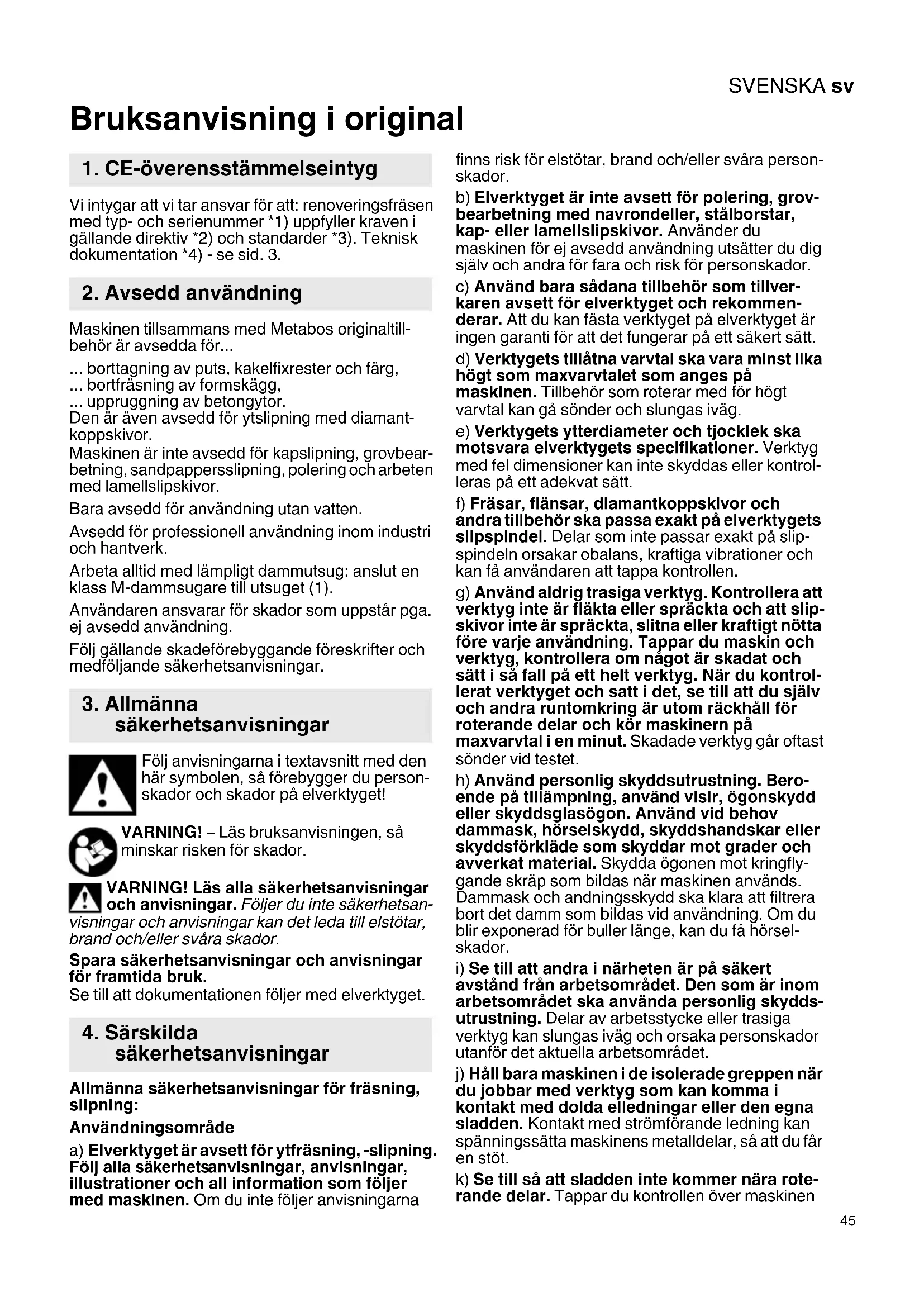 Bruksanvisning i original Vi intygar att vi tar ansvar för att: renoveringsfräsen med typ- och serienummer *1) uppfyller kraven i gällande direktiv *2) och standarder *3). Teknisk dokumentation *4) - se sid. 3. Maskinen tillsammans med Metabos originaltill- behör är avsedda för... ... borttagning av puts, kakelfixrester och färg, ... bortfräsning av formskägg, ... uppruggning av betongytor. Den är även avsedd för ytslipning med diamant- koppskivor. Maskinen är inte avsedd för kapslipning, grovbear- betning, sandpappersslipning, polering och arbeten med lamellslipskivor. Bara avsedd för användning utan vatten. Avsedd för professionell användning inom industri och hantverk. Arbeta alltid med lämpligt dammutsug: anslut en klass M-dammsugare till utsuget (1). Användaren ansvarar för skador som uppstår pga. ej avsedd användning. Följ gällande skadeförebyggande föreskrifter och medföljande säkerhetsanvisningar. Följ anvisningarna i textavsnitt med den här symbolen, så förebygger du person- skador och skador på elverktyget! VARNING! – Läs bruksanvisningen, så minskar risken för skador. VARNING! Läs alla säkerhetsanvisningar och anvisningar. Följer du inte säkerhetsan- visningar och anvisningar kan det leda till elstötar, brand och/eller svåra skador. Spara säkerhetsanvisningar och anvisningar för framtida bruk. Se till att dokumentationen följer med elverktyget. Allmänna säkerhetsanvisningar för fräsning, slipning: Användningsområde a) Elverktyget är avsett för ytfräsning, -slipning. Följ alla säkerhets anvisningar, anvisningar, illustrationer och all information som följer med maskinen. Om du inte följer anvisningarna finns risk för elstötar, brand och/eller svåra person- skador. b) Elverktyget är inte avsett för polering, grov- bearbetning med navrondeller, stålborstar, kap- eller lamellslipskivor. Använder du maskinen för ej avsedd användning utsätter du dig själv och andra för fara och risk för personskador. c) Använd bara sådana tillbehör som tillver- karen avsett för elverktyget och rekommen- derar. Att du kan fästa verktyget på elverktyget är ingen garanti för att det fungerar på ett säkert sätt. d) Verktygets tillåtna varvtal ska vara minst lika högt som maxvarvtalet som anges på maskinen. Tillbehör som roterar med för högt varvtal kan gå sönder och slungas iväg. e) Verktygets ytterdiameter och tjocklek ska motsvara elverktygets specifikationer. Verktyg med fel dimensioner kan inte skyddas eller kontrol- leras på ett adekvat sätt. f) Fräsar, flänsar, diamantkoppskivor och andra tillbehör ska passa exakt på elverktygets slipspindel. Delar som inte passar exakt på slip- spindeln orsakar obalans, kraftiga vibrationer och kan få användaren att tappa kontrollen. g) Använd aldrig trasiga verktyg. Kontrollera att verktyg inte är fläkta eller spräckta och att slip- skivor inte är spräckta, slitna eller kraftigt nötta före varje användning. Tappar du maskin och verktyg, kontrollera om något är skadat och sätt i så fall på ett helt verktyg. När du kontrol- lerat verktyget och satt i det, se till att du själv och andra runtomkring är utom räckhåll för roterande delar och kör maskinern på maxvarvtal i en minut. Skadade verktyg går oftast sönder vid testet. h) Använd personlig skyddsutrustning. Bero- ende på tillämpning, använd visir, ögonskydd eller skyddsglasögon. Använd vid behov dammask, hörselskydd, skyddshandskar eller skyddsförkläde som skyddar mot grader och avverkat material. Skydda ögonen mot kringfly- gande skräp som bildas när maskinen används. Dammask och andningsskydd ska klara att filtrera bort det damm som bildas vid användning. Om du blir exponerad för buller länge, kan du få hörsel- skador.