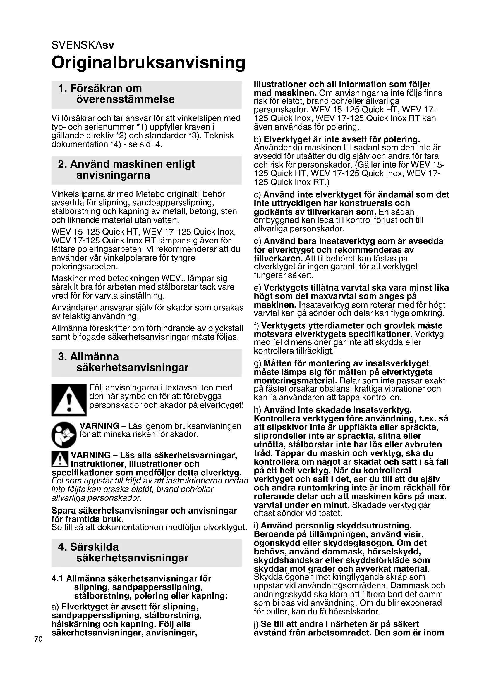 Originalbruksanvisning Vi försäkrar och tar ansvar för att vinkelslipen med typ- och serienummer *1) uppfyller kraven i gällande direktiv *2) och standarder *3). Teknisk dokumentation *4) - se sid. 4. Vinkelsliparna är med Metabo originaltillbehör avsedda för slipning, sandpappersslipning, stålborstning och kapning av metall, betong, sten och liknande material utan vatten. WEV 15-125 Quick HT, WEV 17-125 Quick Inox, WEV 17-125 Quick Inox RT lämpar sig även för lättare poleringsarbeten. Vi rekommenderar att du använder vår vinkelpolerare för tyngre poleringsarbeten. Maskiner med beteckningen WEV.. lämpar sig särskilt bra för arbeten med stålborstar tack vare vred för för varvtalsinställning. Användaren ansvarar själv för skador som orsakas av felaktig användning. Allmänna föreskrifter om förhindrande av olycksfall samt bifogade säkerhetsanvisningar måste följas. Följ anvisningarna i textavsnitten med den här symbolen för att förebygga personskador och skador på elverktyget! VARNING – Läs igenom bruksanvisningen för att minska risken för skador. VARNING – Läs alla säkerhetsvarningar, instruktioner, illustrationer och specifikationer som medföljer detta elverktyg. Fel som uppstår till följd av att instruktionerna nedan inte följts kan orsaka elstöt, brand och/eller allvarliga personskador. Spara säkerhetsanvisningar och anvisningar för framtida bruk. Se till så att dokumentationen medföljer elverktyget.