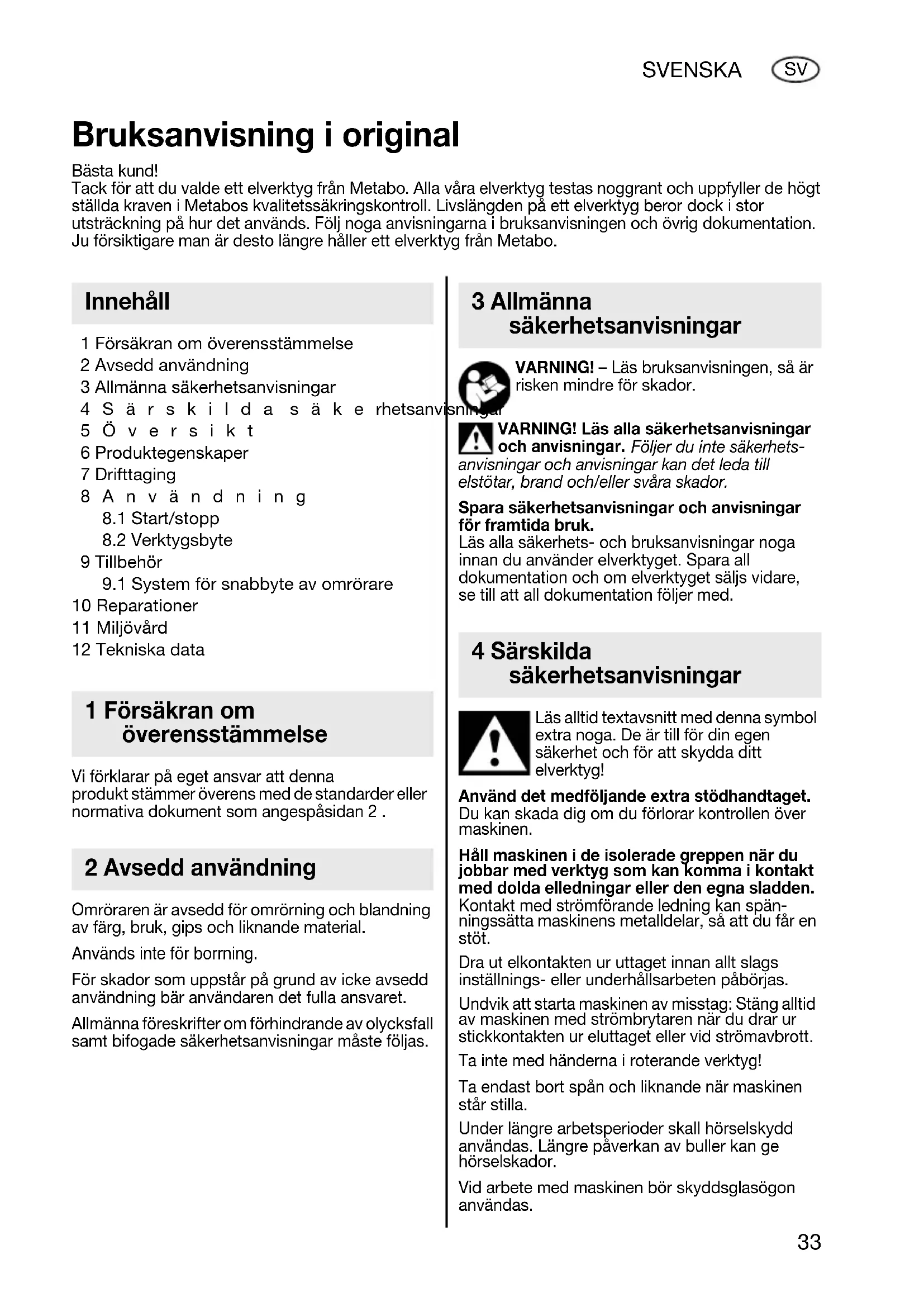 10 Reparationer 11 Miljövård 12 Tekniska data Vi förklarar på eget ansvar att denna produkt stämmer överens med de standarder eller normativa dokument som angespåsidan 2 . Omröraren är avsedd för omrörning och blandning av färg, bruk, gips och liknande material. Används inte för borrning. För skador som uppstår på grund av icke avsedd användning bär användaren det fulla ansvaret. Allmänna föreskrifter om förhindrande av olycksfall samt bifogade säkerhetsanvisningar måste följas. VARNING! – Läs bruksanvisningen, så är risken mindre för skador. VARNING! Läs alla säkerhetsanvisningar och anvisningar. Följer du inte säkerhets- anvisningar och anvisningar kan det leda till elstötar, brand och/eller svåra skador. Spara säkerhetsanvisningar och anvisningar för framtida bruk. Läs alla säkerhets- och bruksanvisningar noga innan du använder elverktyget. Spara all dokumentation och om elverktyget säljs vidare, se till att all dokumentation följer med. Läs alltid textavsnitt med denna symbol extra noga. De är till för din egen säkerhet och för att skydda ditt elverktyg! Använd det medföljande extra stödhandtaget. Du kan skada dig om du förlorar kontrollen över maskinen. Håll maskinen i de isolerade greppen när du jobbar med verktyg som kan komma i kontakt med dolda elledningar eller den egna sladden. Kontakt med strömförande ledning kan spän- ningssätta maskinens metalldelar, så att du får en stöt. Dra ut elkontakten ur uttaget innan allt slags inställnings- eller underhållsarbeten påbörjas. Undvik att starta maskinen av misstag: Stäng alltid av maskinen med strömbrytaren när du drar ur stickkontakten ur eluttaget eller vid strömavbrott. Ta inte med händerna i roterande verktyg! Ta endast bort spån och liknande när maskinen står stilla. Under längre arbetsperioder skall hörselskydd användas. Längre påverkan av buller kan ge hörselskador. Vid arbete med maskinen bör skyddsglasögon användas. Bruksanvisning i original Bästa kund! Tack för att du valde ett elverktyg från Metabo. Alla våra elverktyg testas noggrant och uppfyller de högt ställda kraven i Metabos kvalitetssäkringskontroll. Livslängden på ett elverktyg beror dock i stor utsträckning på hur det används. Följ noga anvisningarna i bruksanvisningen och övrig dokumentation. Ju försiktigare man är desto längre håller ett elverktyg från Metabo. Innehåll 1 Försäkran om överensstämmelse 2 Avsedd användning 3 Allmänna säkerhetsanvisningar 4 Särskilda säkerhetsanvisningar 17026753_0513 RWE 1100.book Seite 33 Dienstag, 7. Mai 2013 10:49 1034 SVENSKA