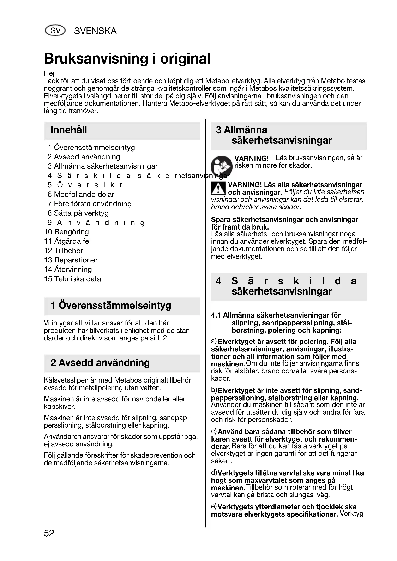 1 Överensstämmelseintyg 2 Avsedd användning 3 Allmänna säkerhetsanvisningar 4Särskilda säkerhetsanvisningar 5Översikt 6 Medföljande delar 7 Före första användning 8 Sätta på verktyg 9Användning 10 Rengöring 11 Åtgärda fel 12 Tillbehör 13 Reparationer 14 Återvinning 15 Tekniska data Vi intygar att vi tar ansvar för att den här produkten har tillverkats i enlighet med de stan- darder och direktiv som anges på sid. 2. Kälsvetsslipen är med Metabos originaltillbehör avsedd för metallpolering utan vatten. Maskinen är inte avsedd för navrondeller eller kapskivor. Maskinen är inte avsedd för slipning, sandpap- persslipning, stålborstning eller kapning. Användaren ansvarar för skador som uppstår pga. ej avsedd användning. Följ gällande föreskrifter för skadeprevention och de medföljande säkerhetsanvisningarna. VARNING! – Läs bruksanvisningen, så är risken mindre för skador. VARNING! Läs alla säkerhetsanvisningar och anvisningar. Följer du inte säkerhetsan- visningar och anvisningar kan det leda till elstötar, brand och/eller svåra skador. Spara säkerhetsanvisningar och anvisningar för framtida bruk. Läs alla säkerhets- och bruksanvisningar noga innan du använder elverktyget. Spara den medföl- jande dokumentationen och se till att den följer med elverktyget.